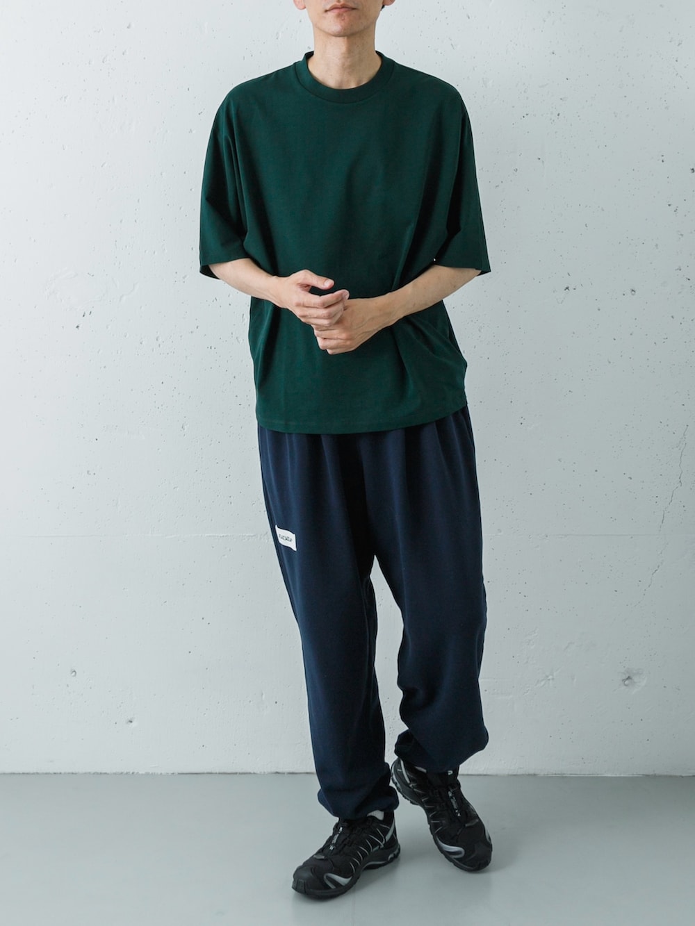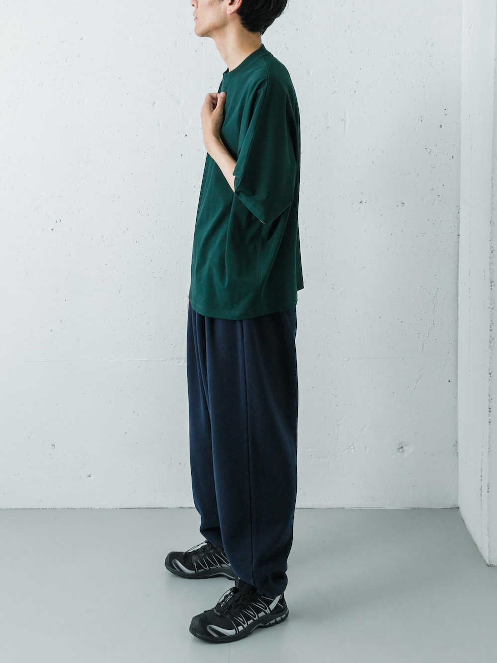 カジュアルなネイビースウェットも、トップスの「EVER LUSTER」生地特有のツヤ感と落ち感が加わることで、部屋着感のない洗練されたルックスに仕上がります。モスグリーンとネイビーという、渋く落ち着いたカラーリングも大人っぽさを引き立てるポイントです。