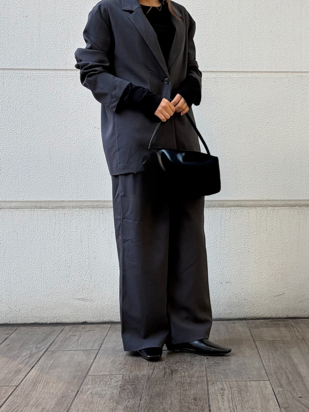 同素材のパンツとジャケットを合わせた、セットアップコーデです。