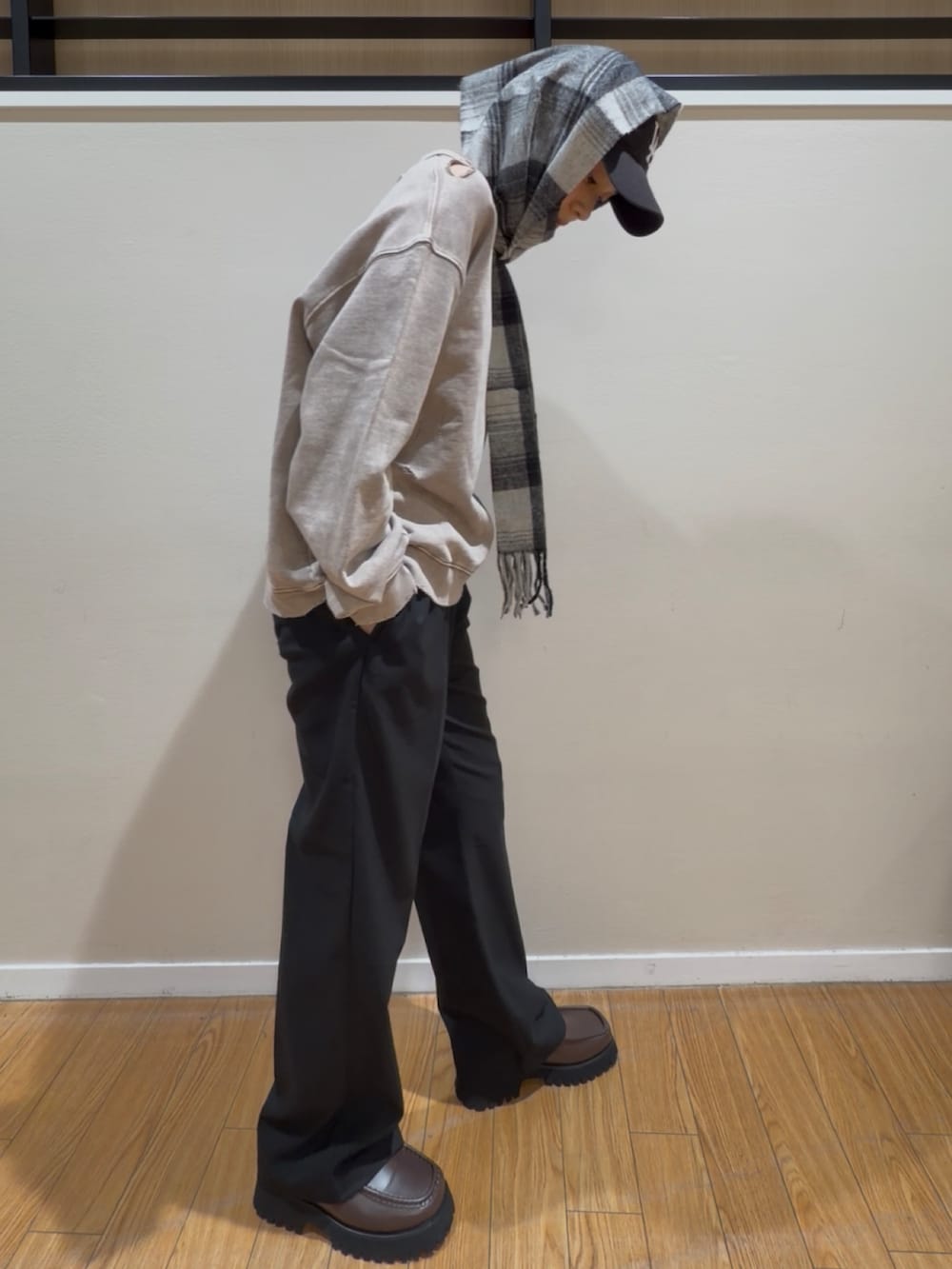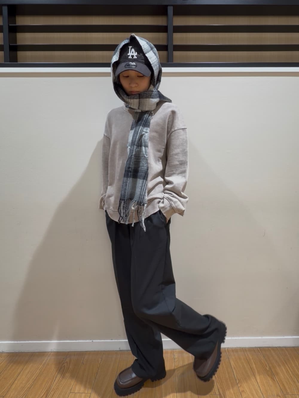 スウェットとワイドパンツでラフなシルエットをつくり、キャップを合わせてストリート感を出したコーディネート。チェックのマフラーをフードのように巻くことでアクセントを加え、シンプルな中にも動きのあるスタイルにしました。