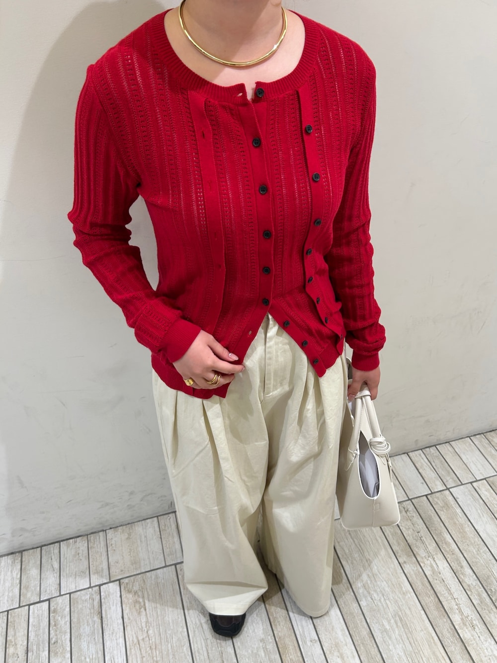 下のボタンは2.3個開けて、ハイスエストのボトムスと合わせるとスタイルアップします👍