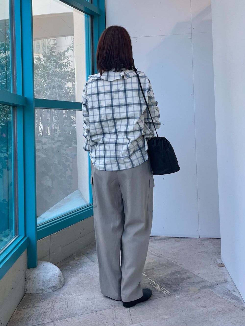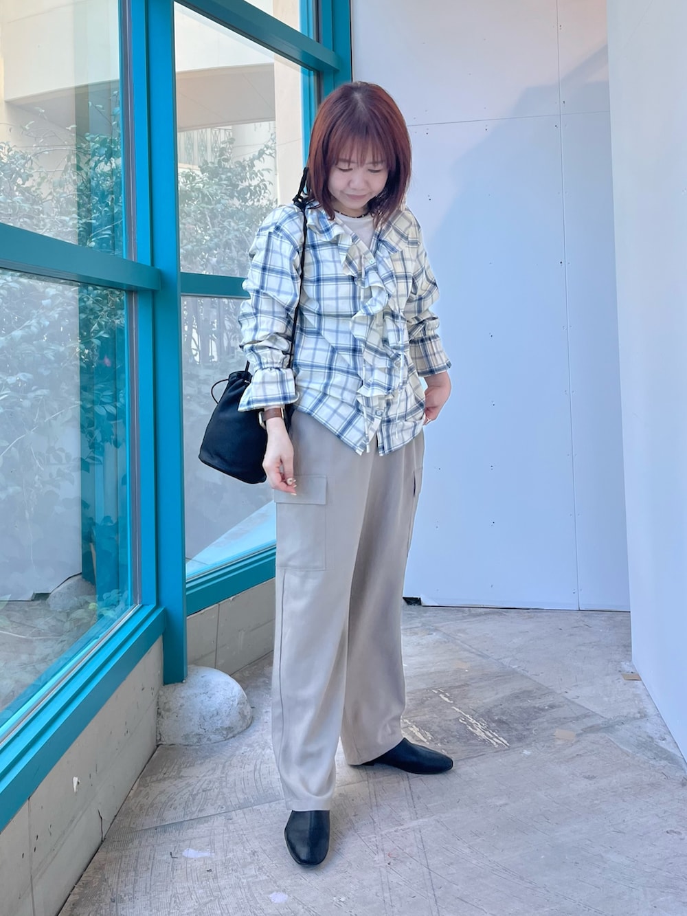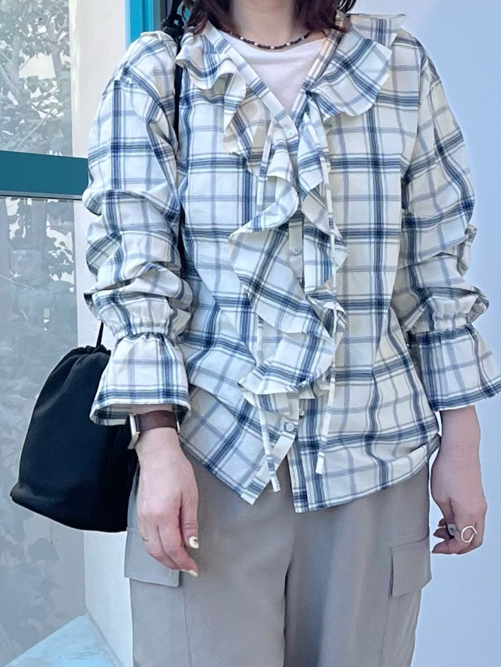 優しいカラーのチェック柄に、とろみ素材のカーゴパンツを合わせてワントーンコーデにまとめました。