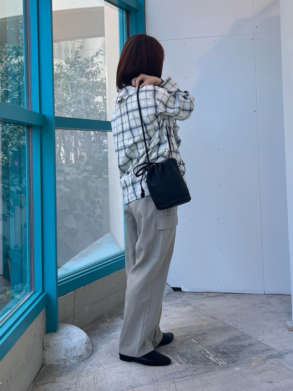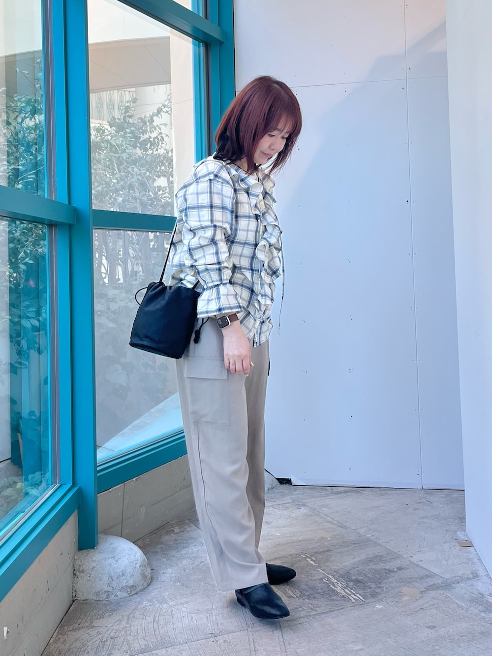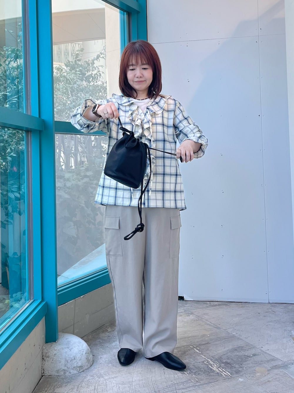 優しいカラーのチェック柄に、とろみ素材のカーゴパンツを合わせてワントーンコーデにまとめました。
