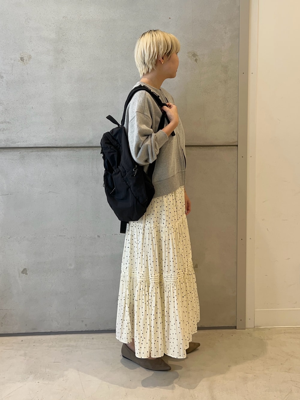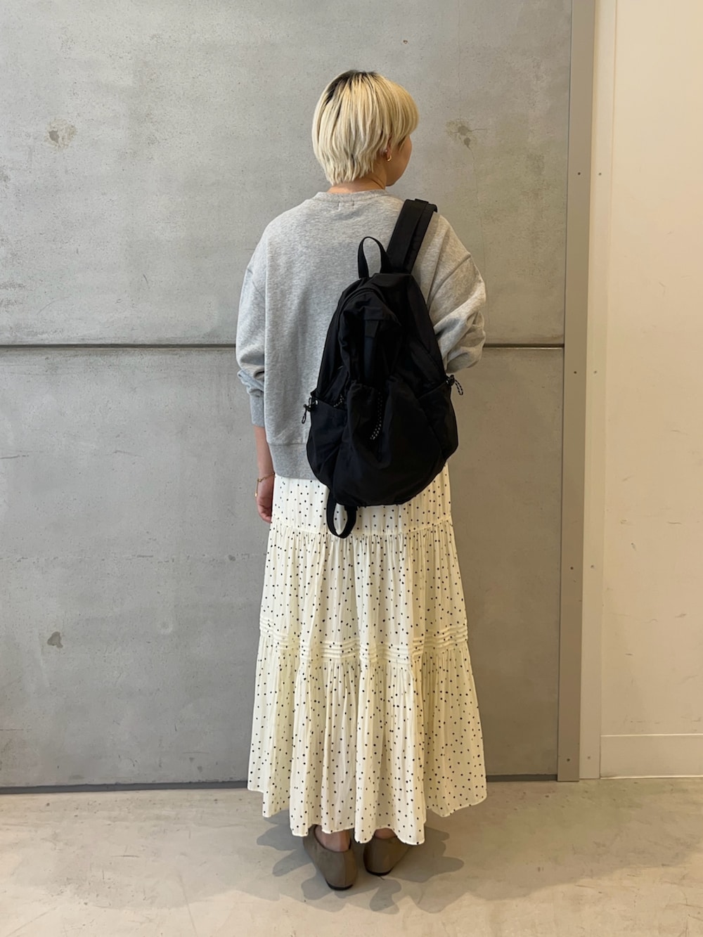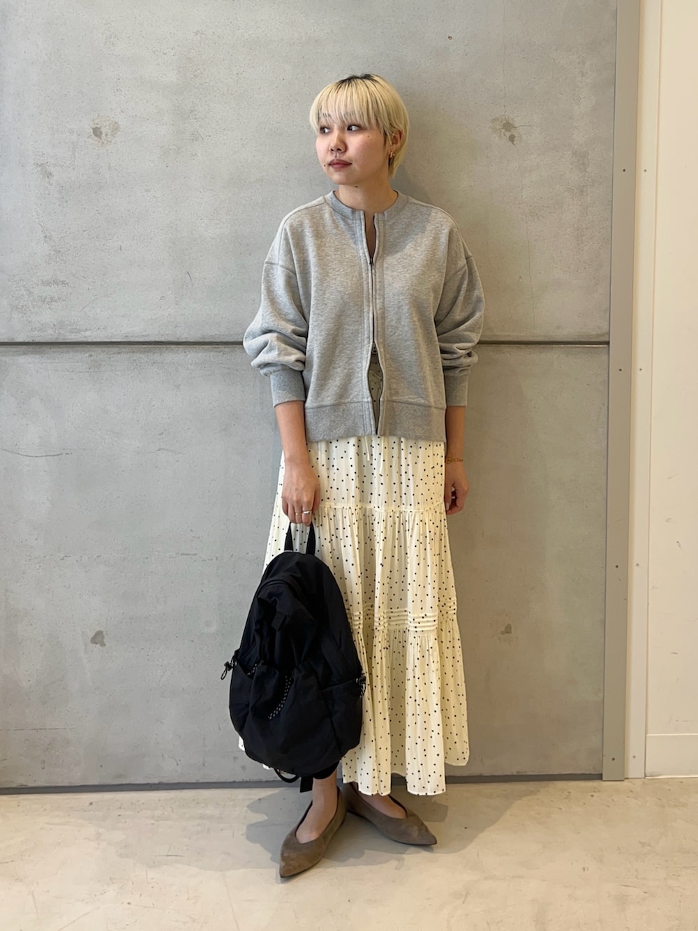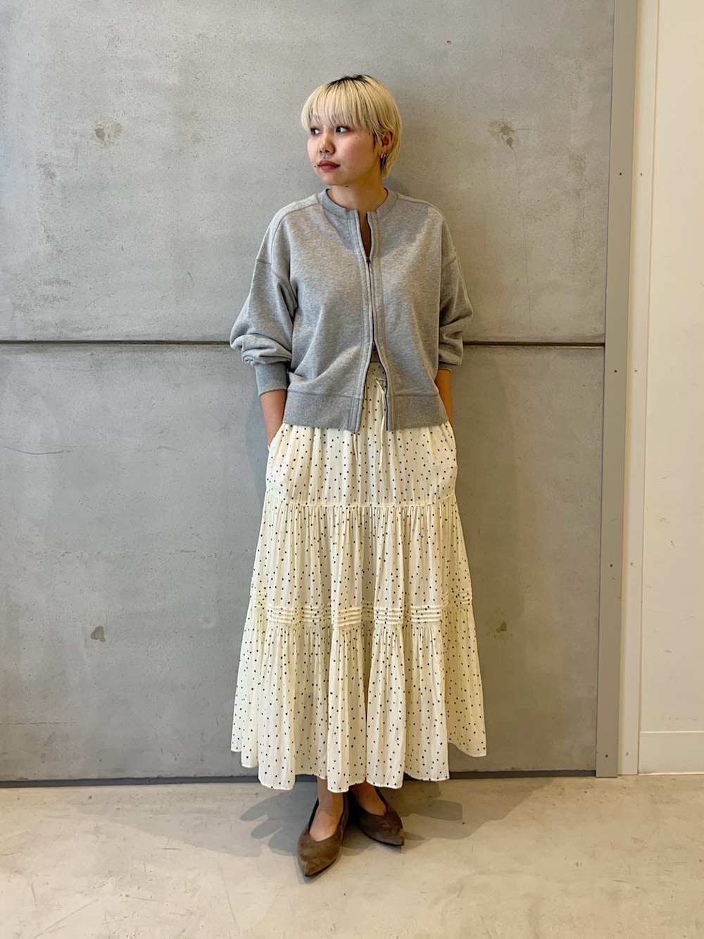スカートはドット柄で春らしく!