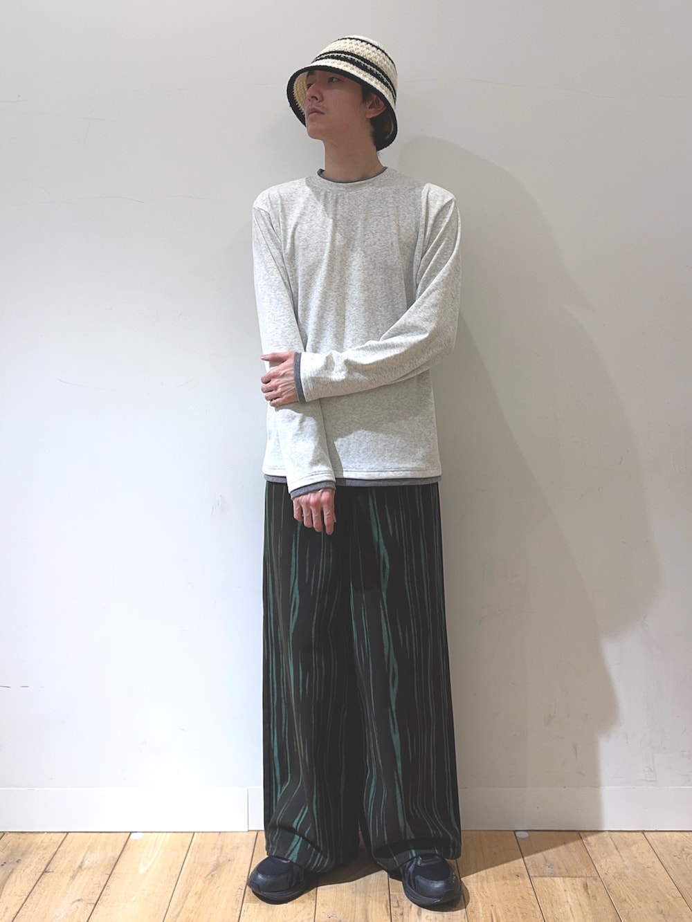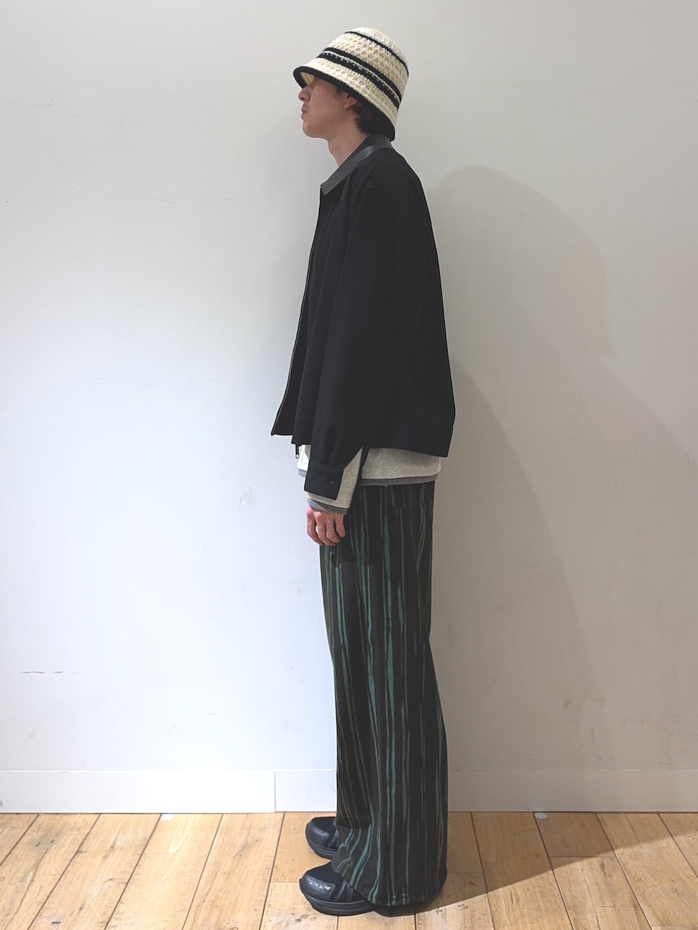 上半身はフェイクレイヤードTに襟切り替えアウターとトレンドを意識したアイテムで合わせてバランス感を意識しました!