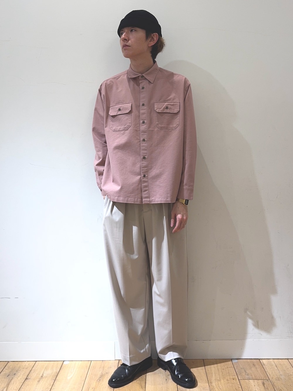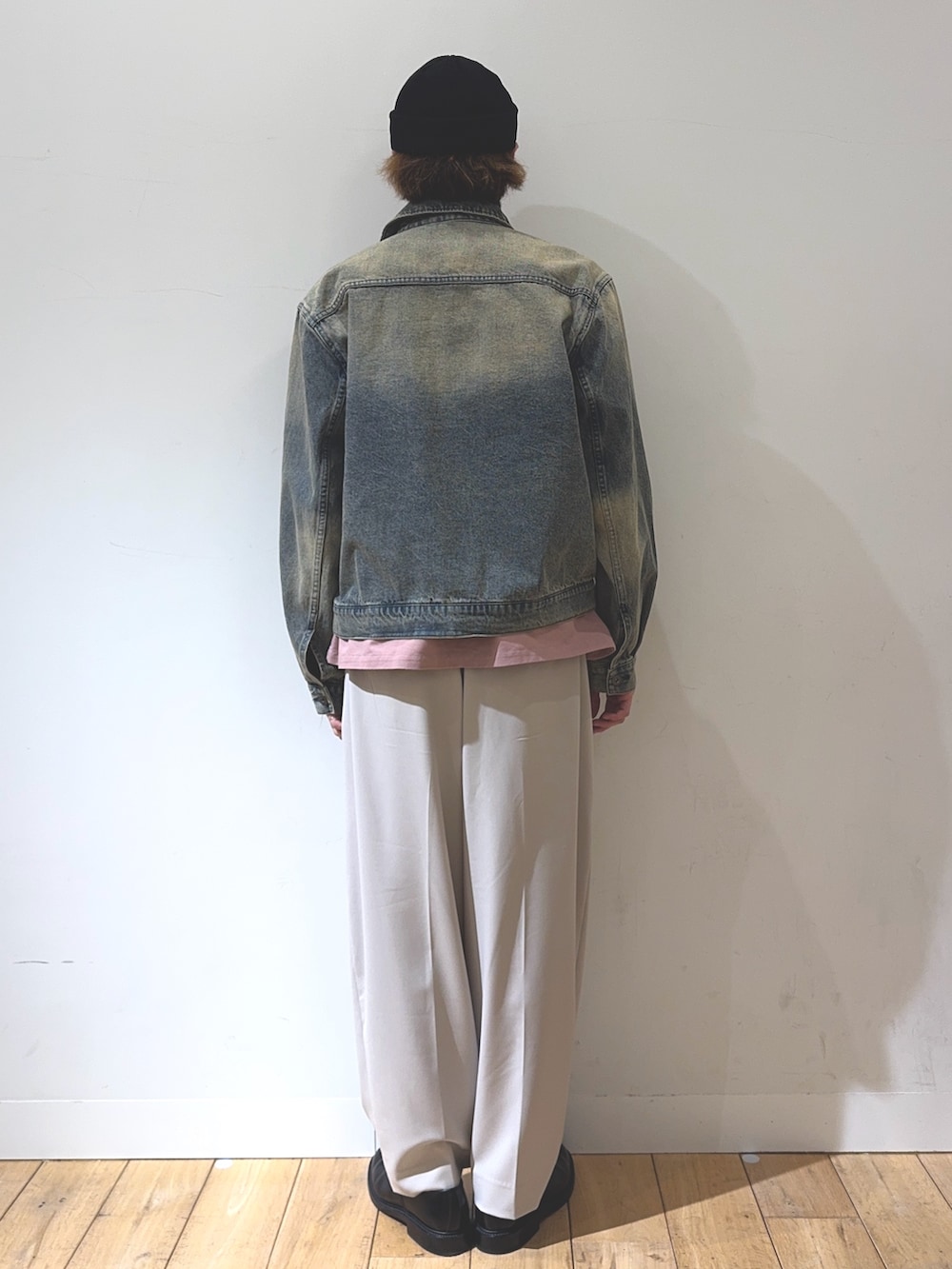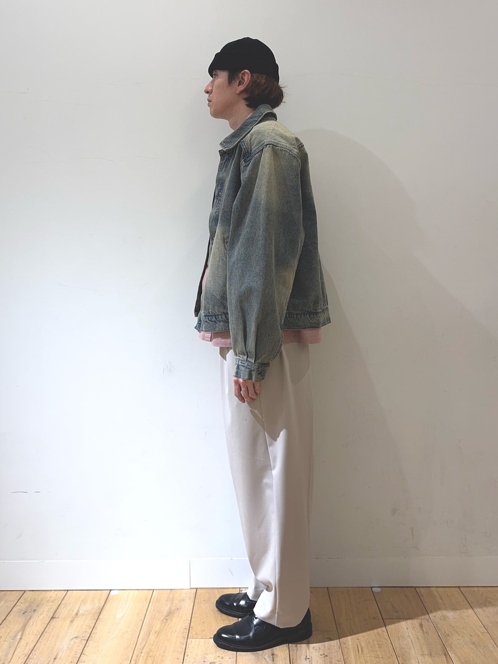 上半身はデニム素材のアイテムのレイヤードで、ピンクを基調にデニムらしいやや無骨なシルエットで合わせています!下半身はスラックスに革靴とクラシックな印象で子供っぽくならないバランスを意識したコーディネートに仕上げました!