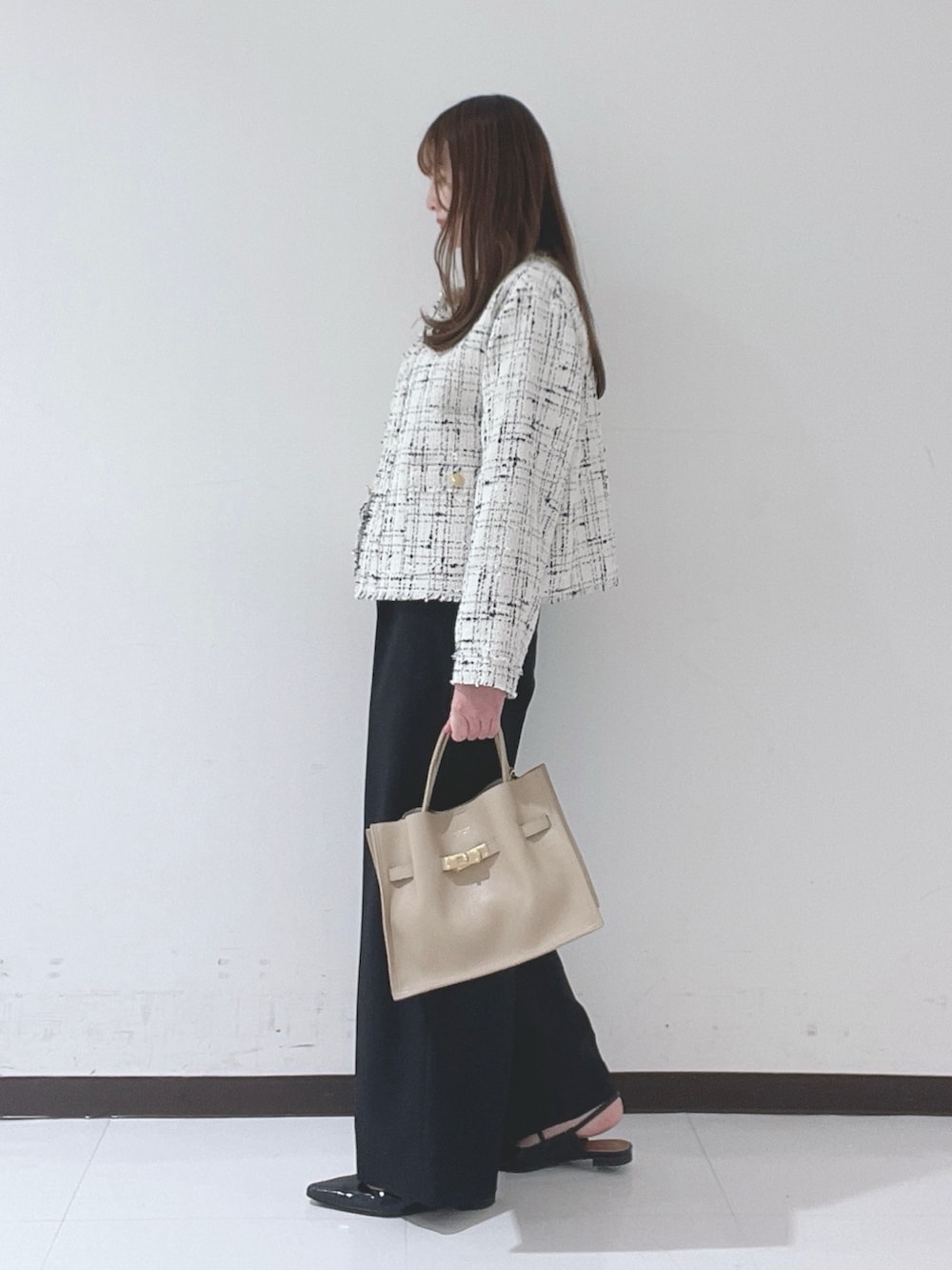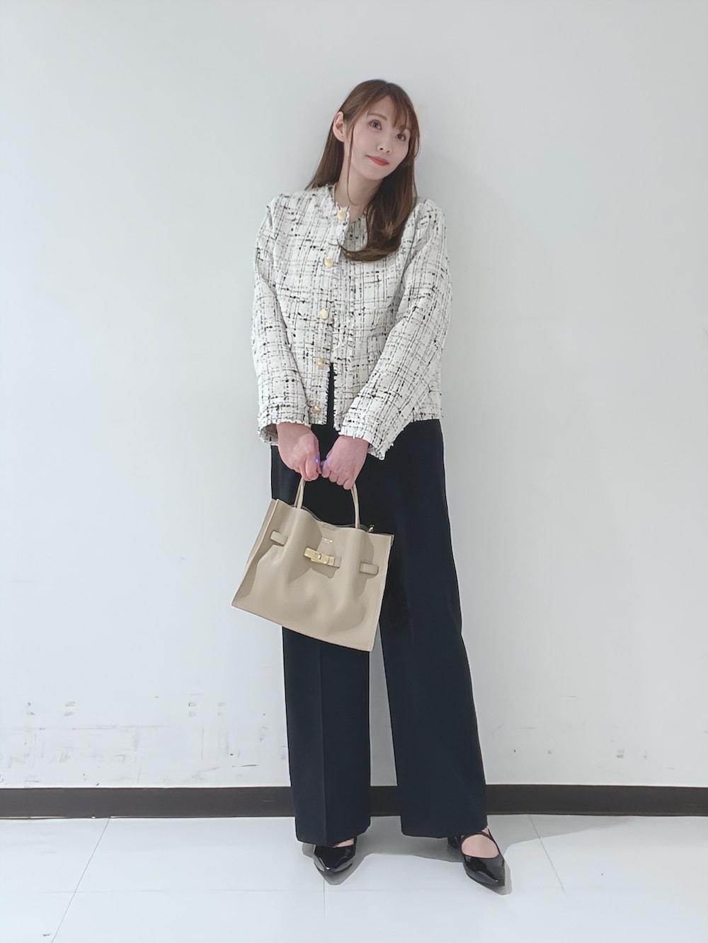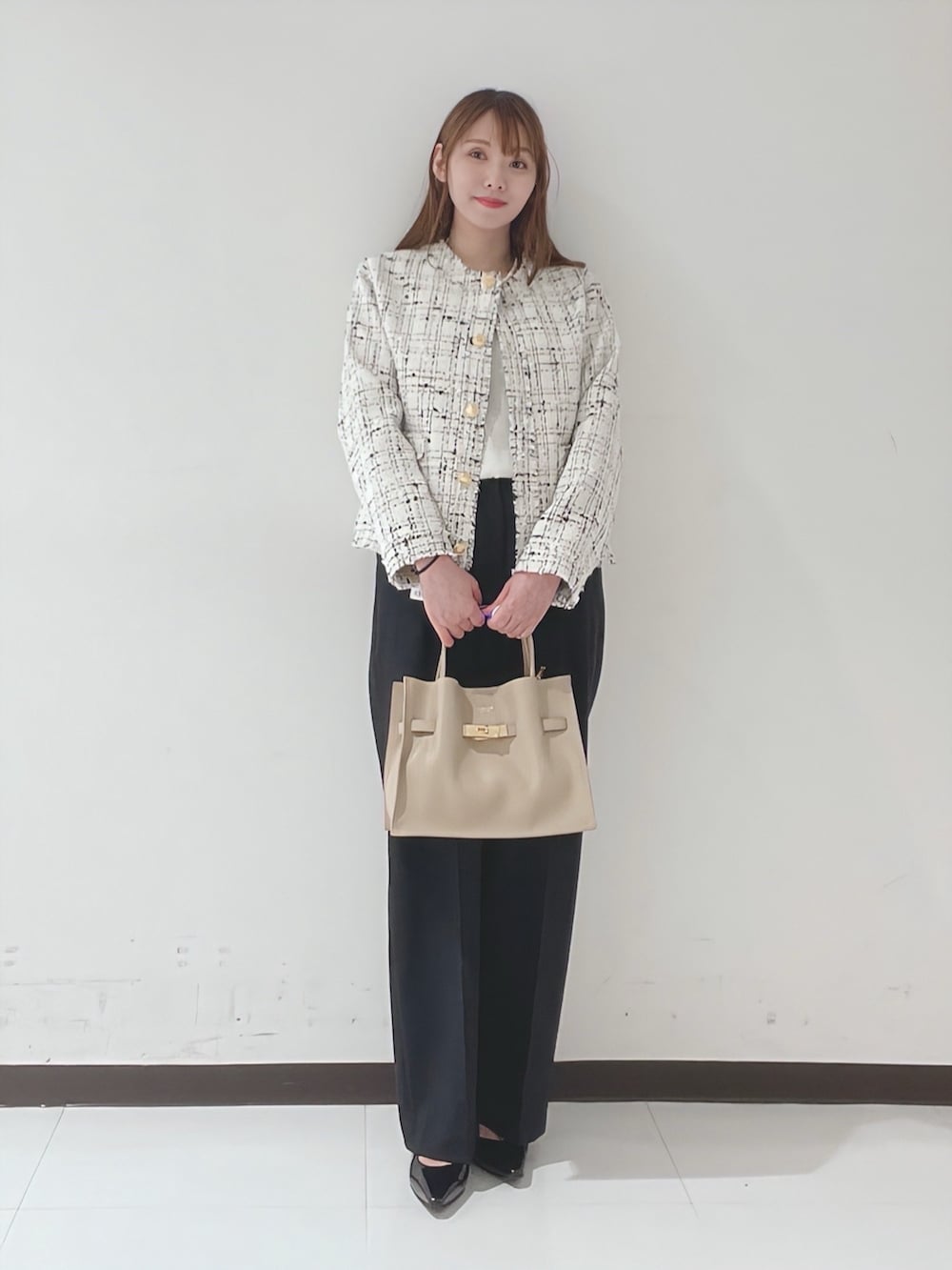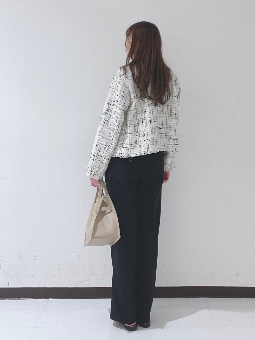 入学式は明るい印象のお洋服を着てくる方が多いので、今回は 白ツイードジャケット×白ブラウスで華やかな雰囲気にしてみました。