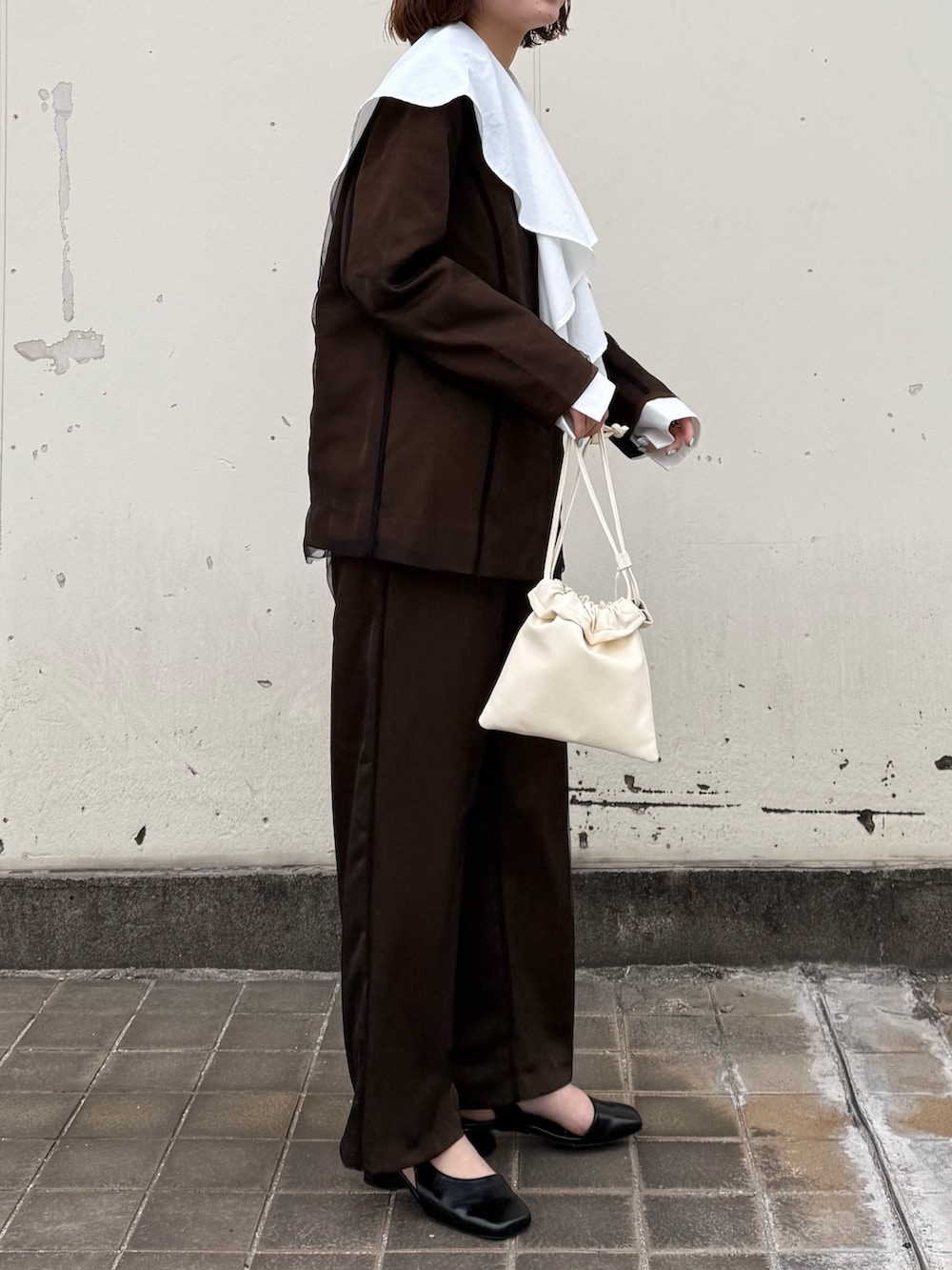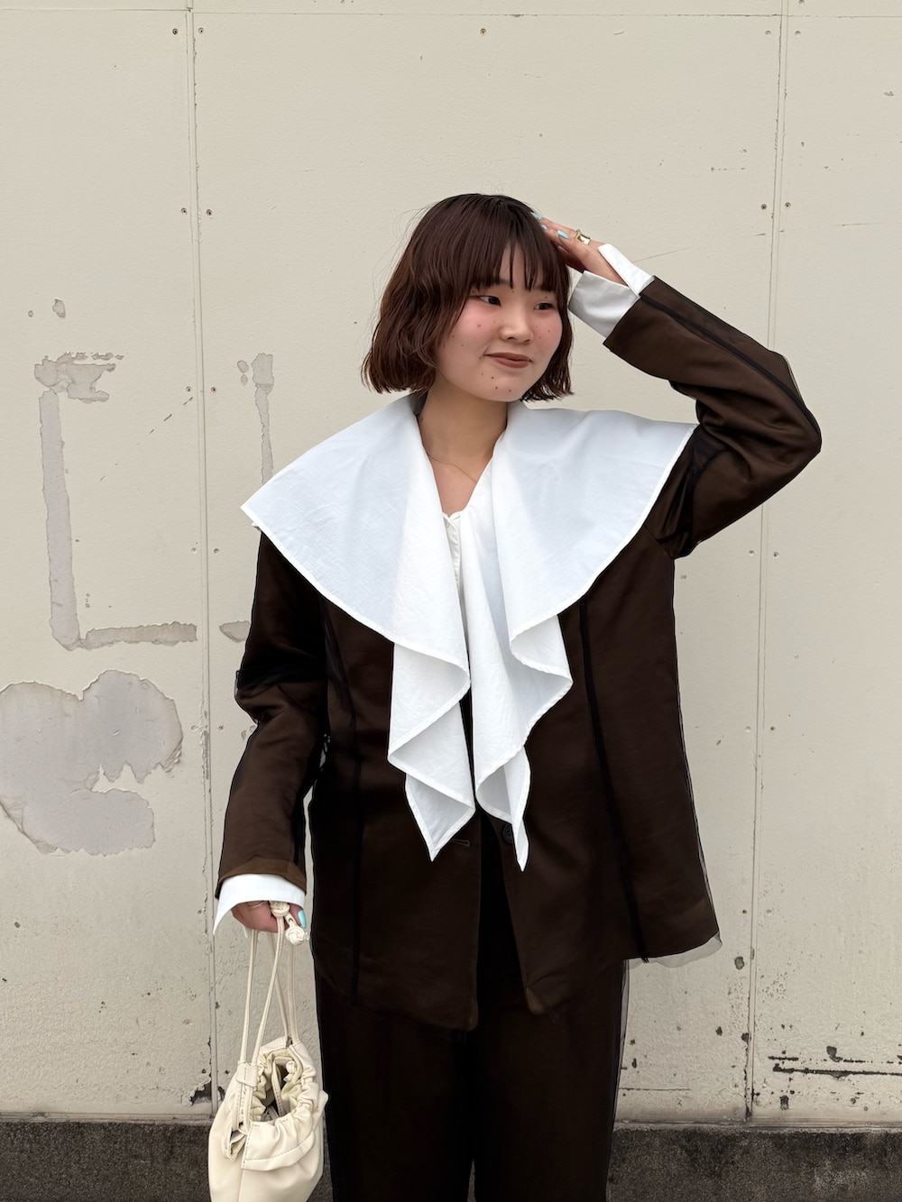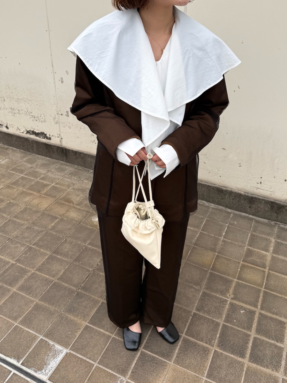 チュールのセットアップだと少し寂しい感じがしたため、大きめな襟のブラウスを中に仕込んだのがポイントです🙆