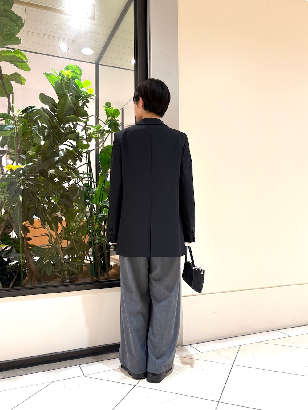 中に着ているチェックのビスチェもモノトーンのコーデにいいアクセントに◎