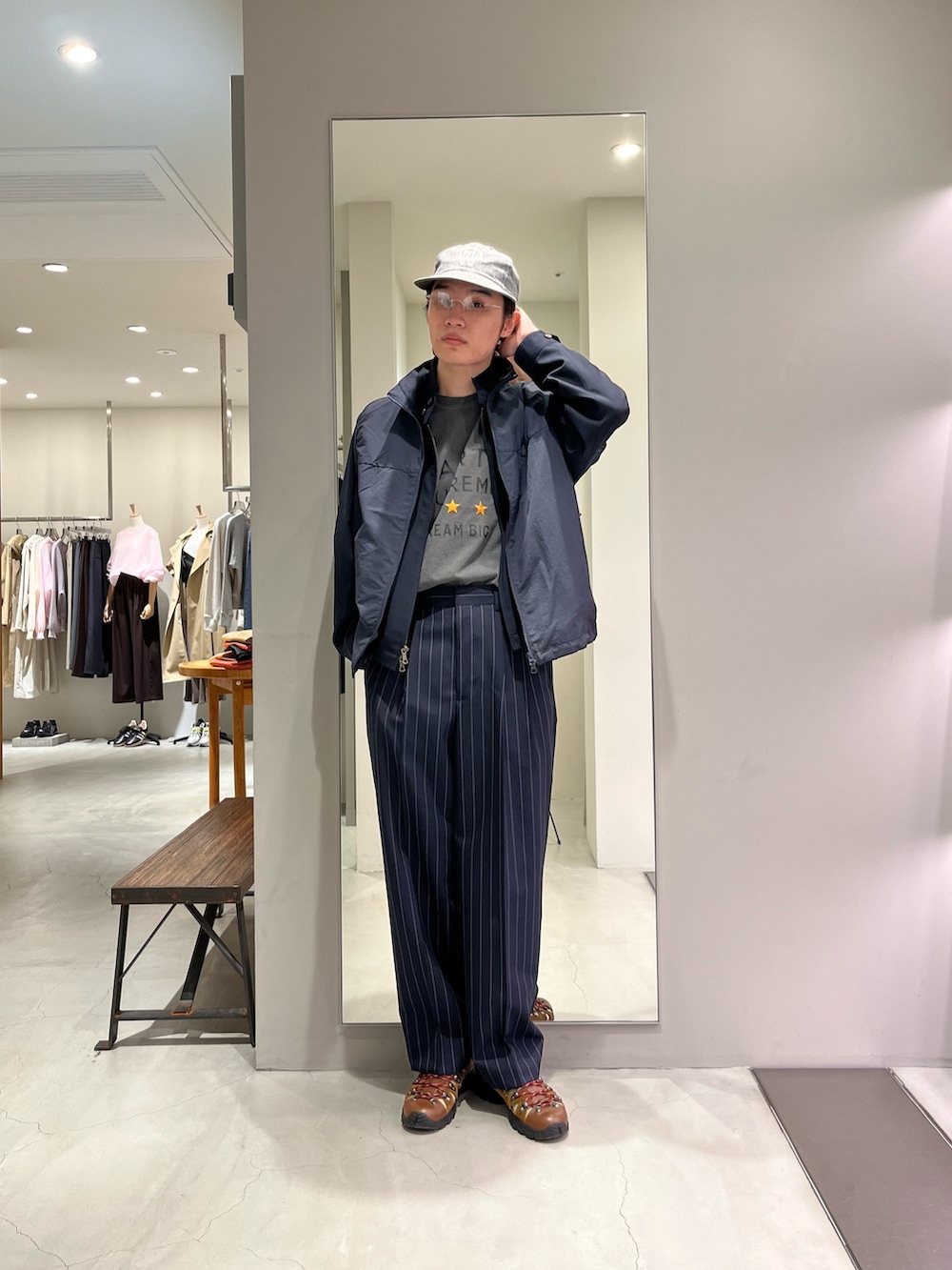 トップスはマーティーシュプリームのスリースターロゴTEE古着のようなボディが雰囲気良し❗️