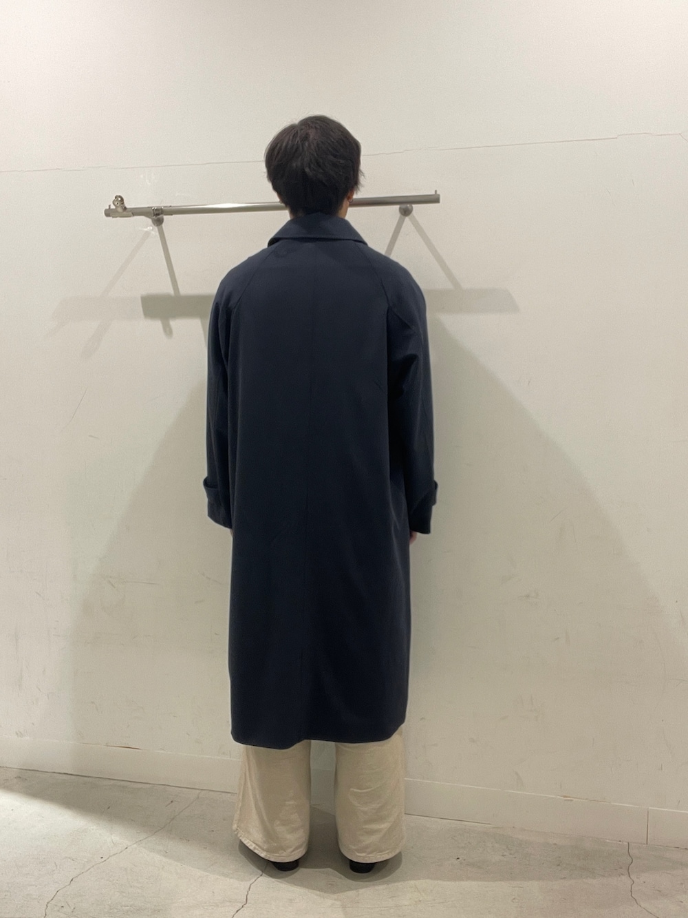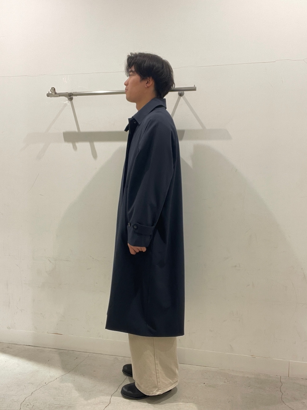 ネイビー寄りのグレーのバルマカーンコートにブラウンチェックシャツ、