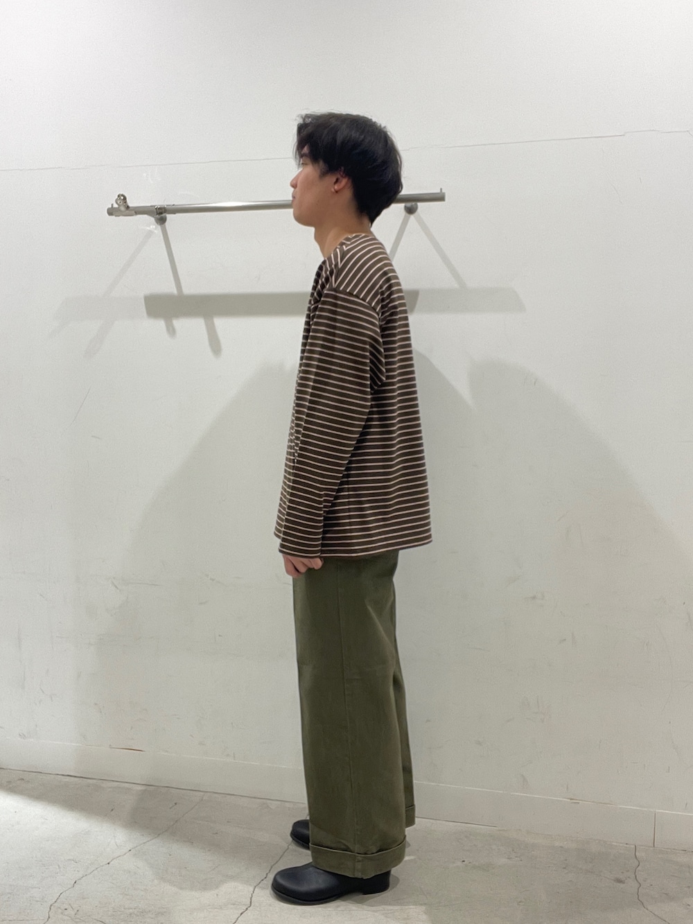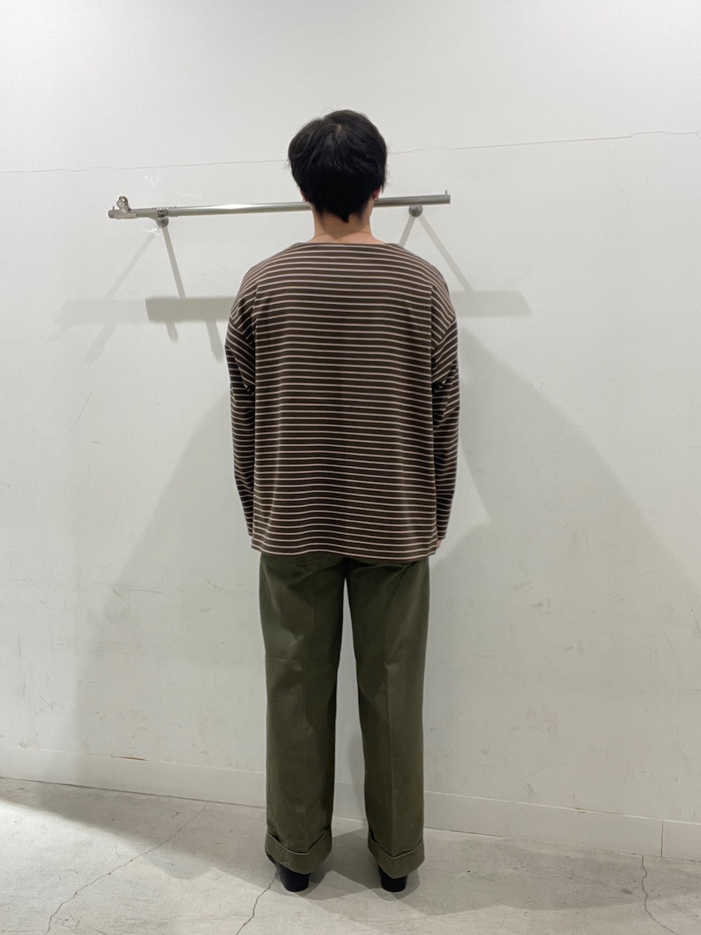 ブラウンのバスクシャツにカーキのカツラギパンツを合わせました!