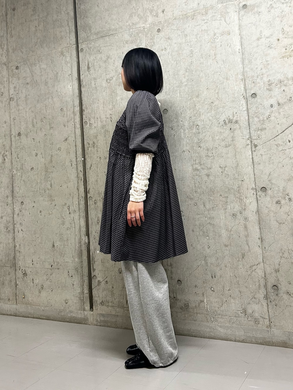 トップス、ワンピースが甘めだったのでスウェットパンツでカジュアルにしてバランスを取りました✋