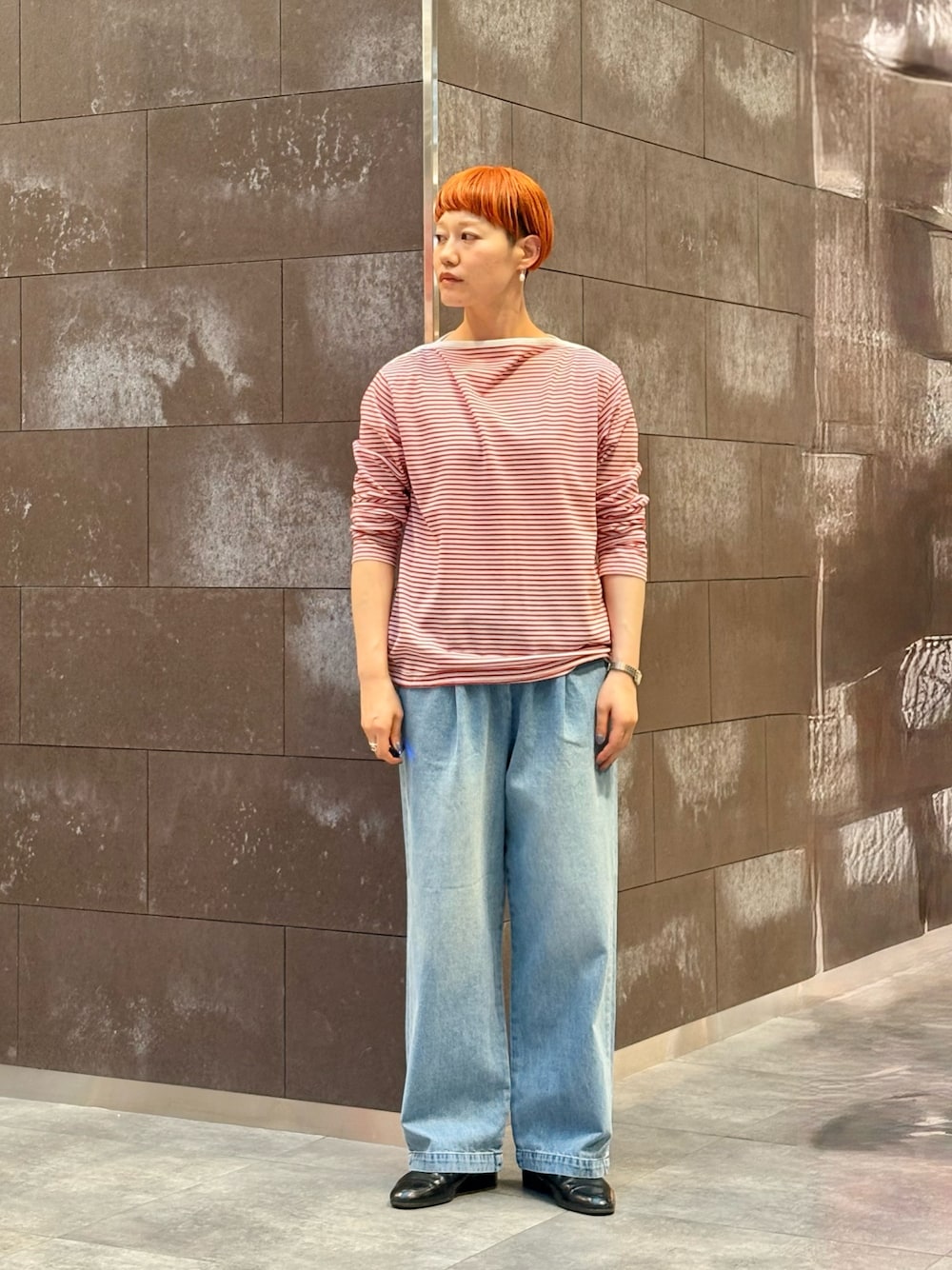 メンズのボーダートップスとワイドデニムのビッグシルエットコーデ。