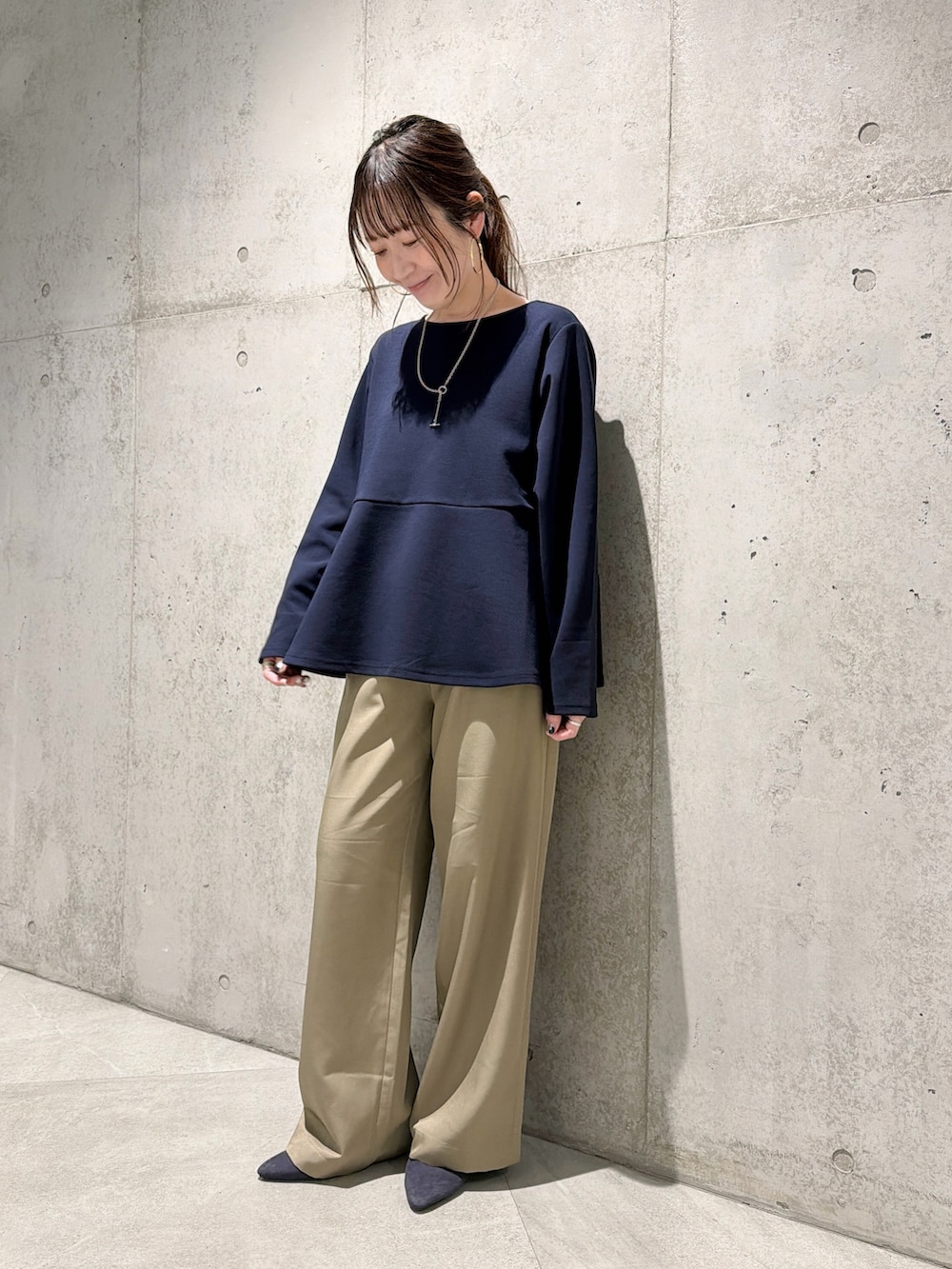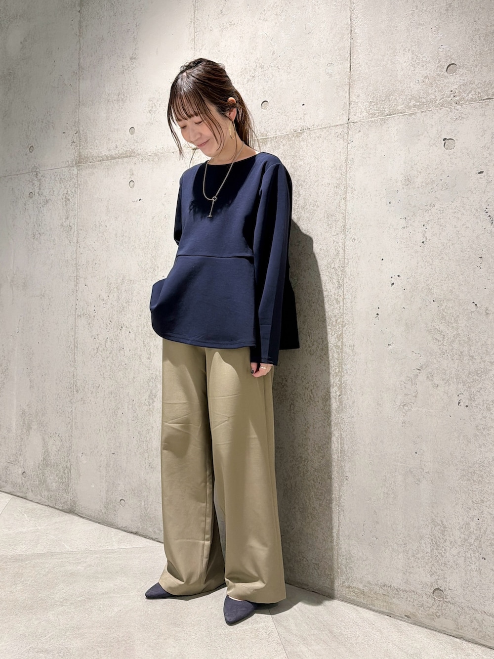今回は、光沢のあるパンツと合わせた、キレイめコーディネート。