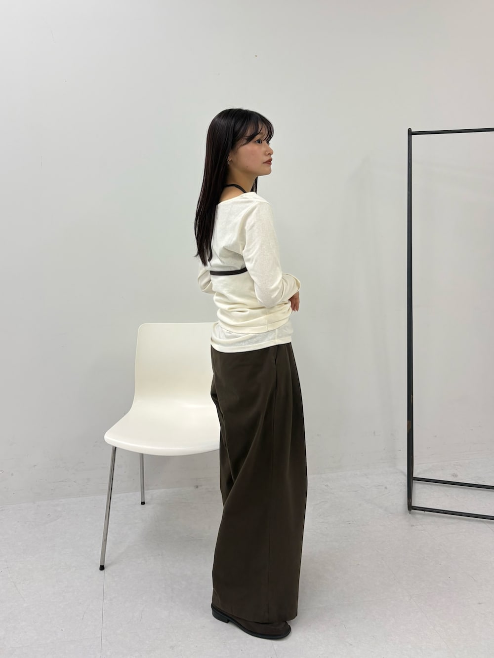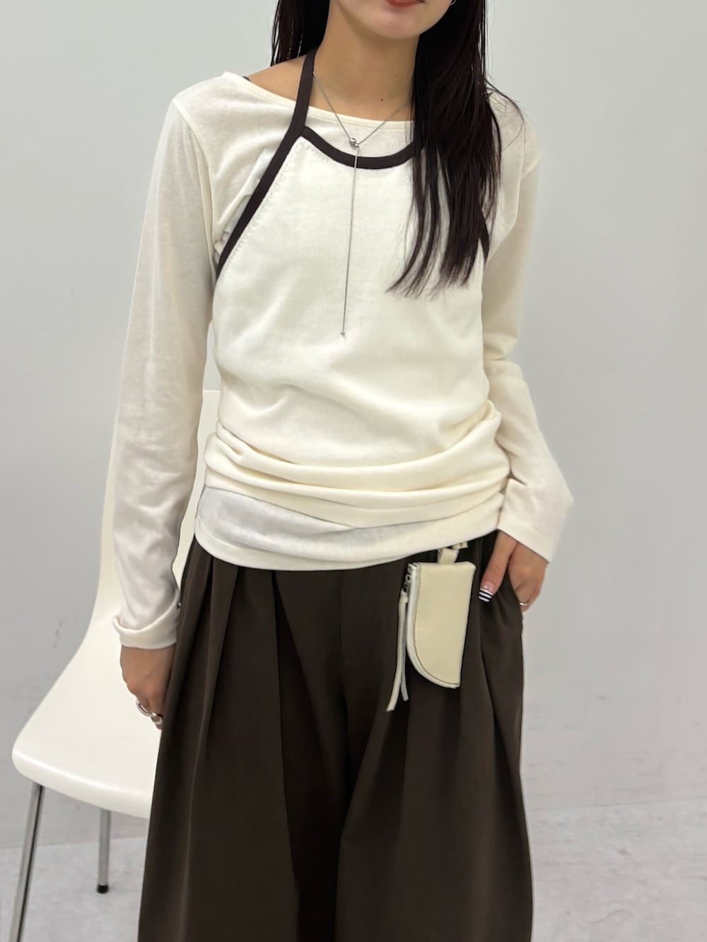 トレンドのホルターネックをレイヤードしたトップスで、バイカラーの配色もあるので、顔周りも締まった印象になります!
