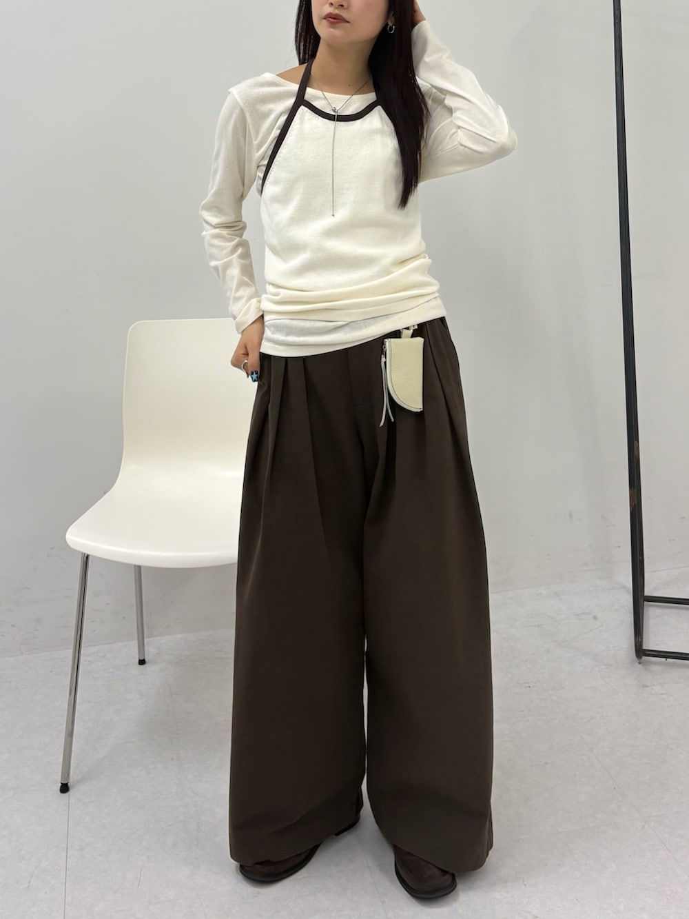 上半身がコンパクトな印象になるのでワイドパンツを合わせるのがおすすめです✨
