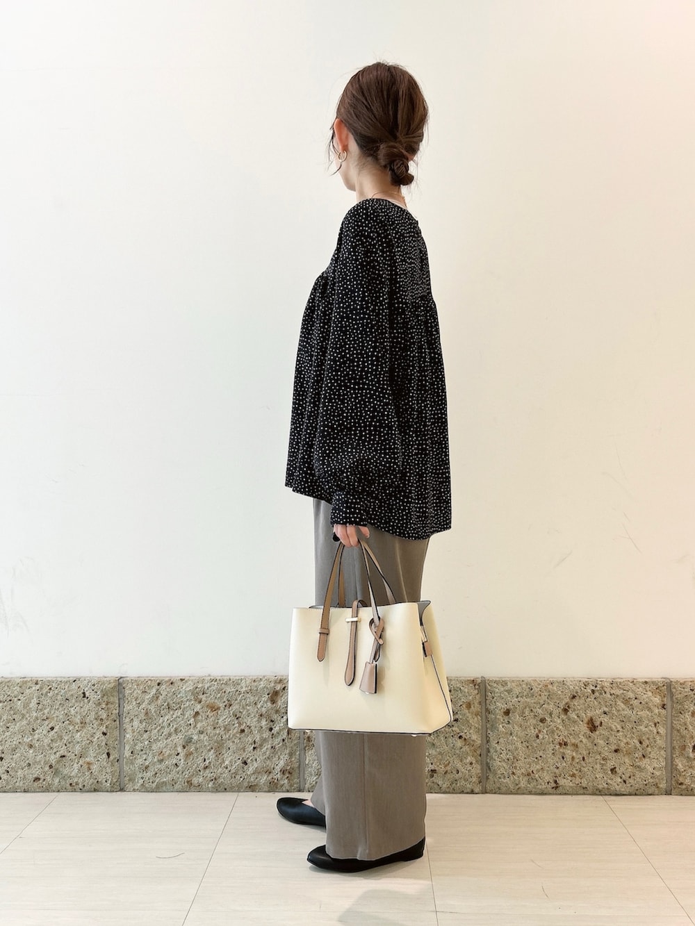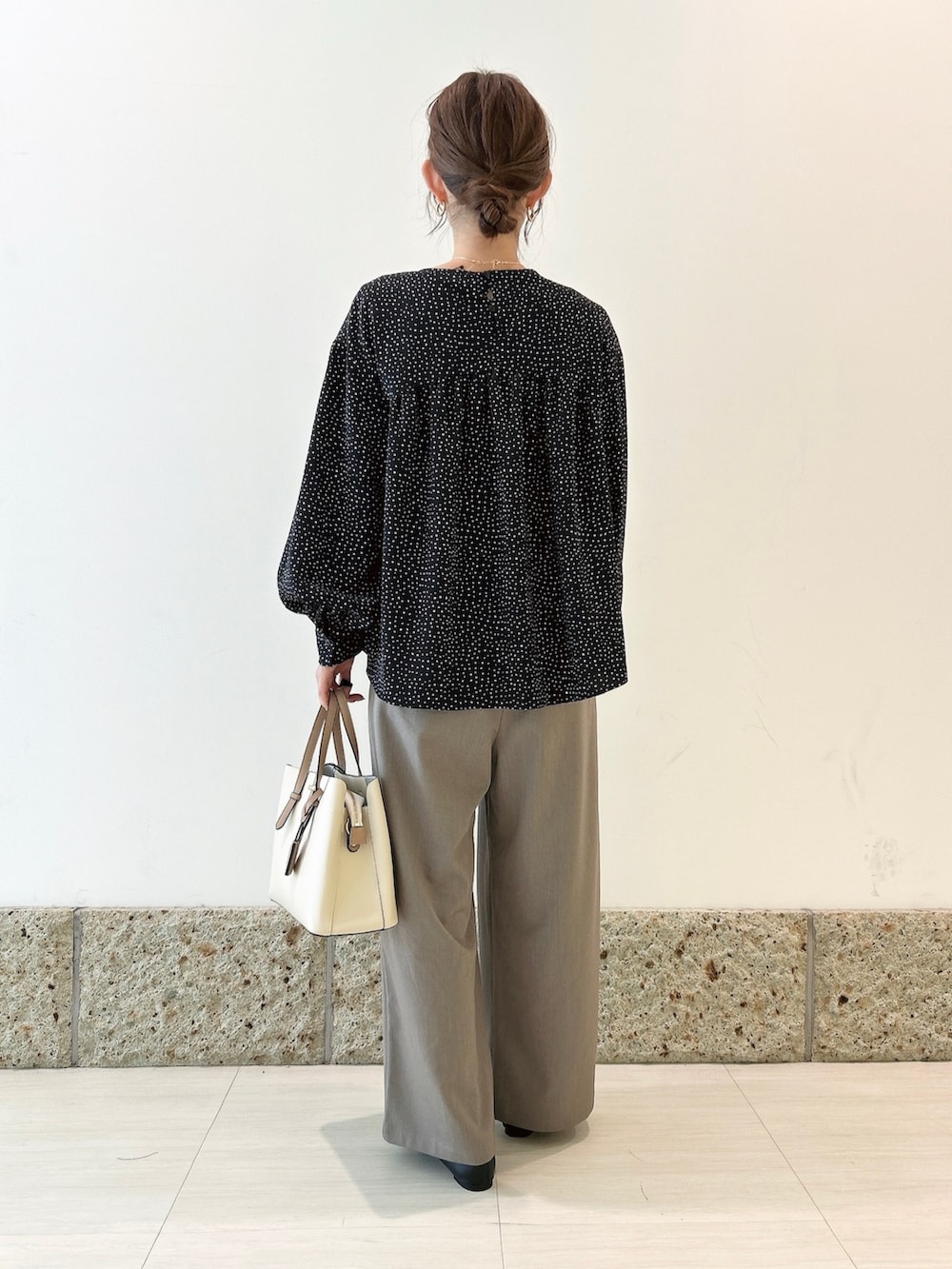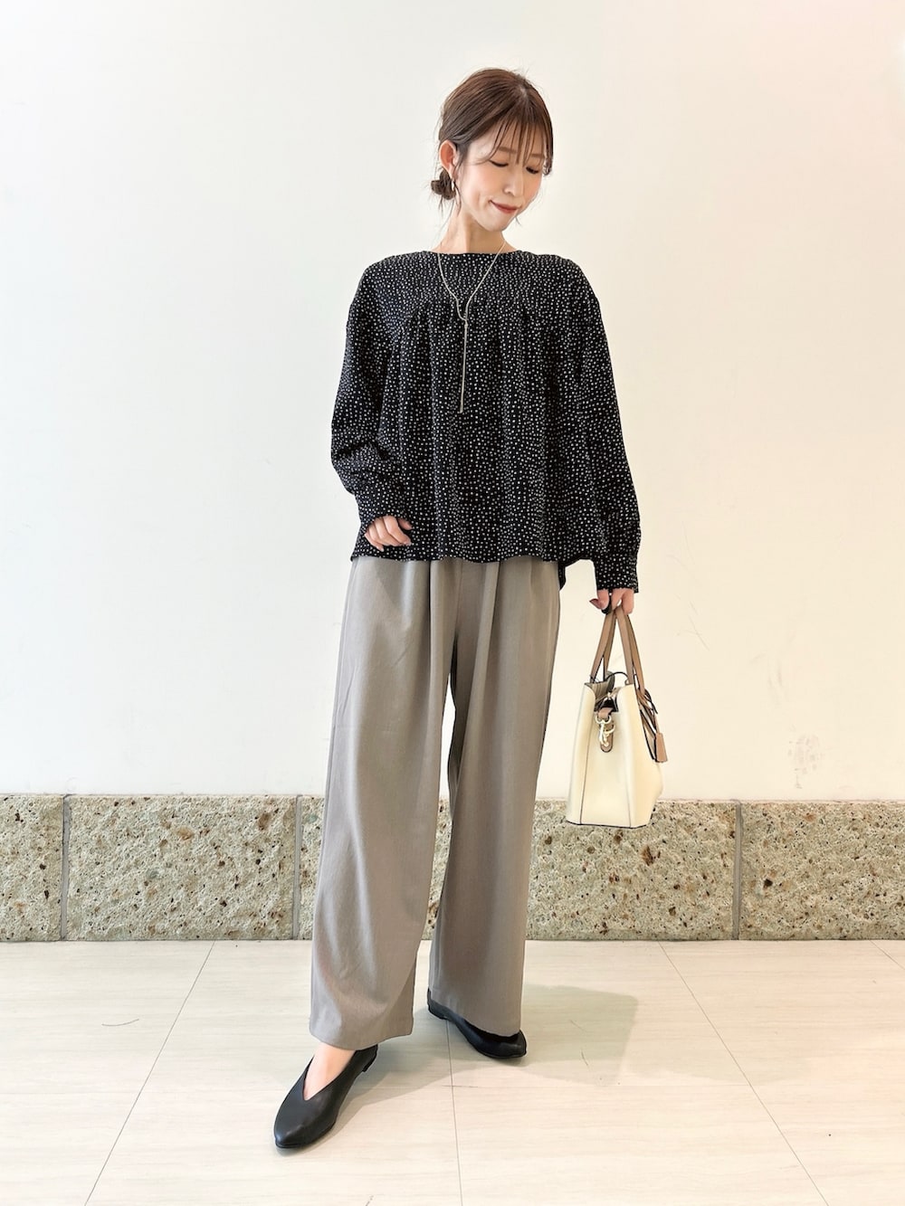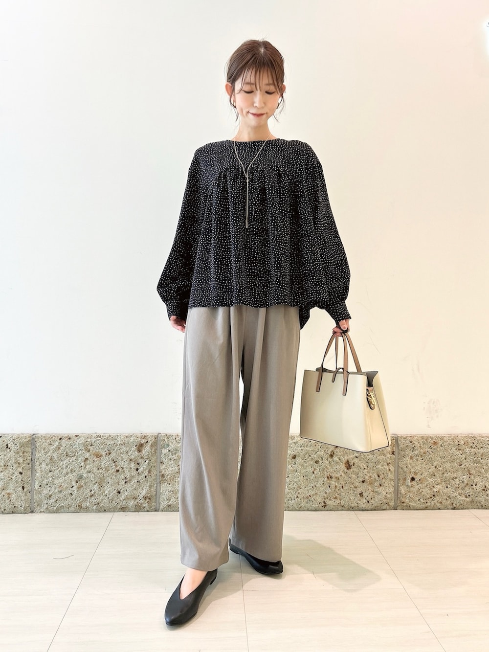 トップスは小ぶりのドット柄が大人可愛いブラウス。