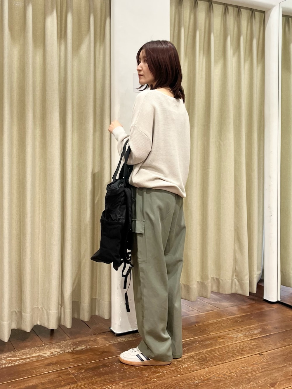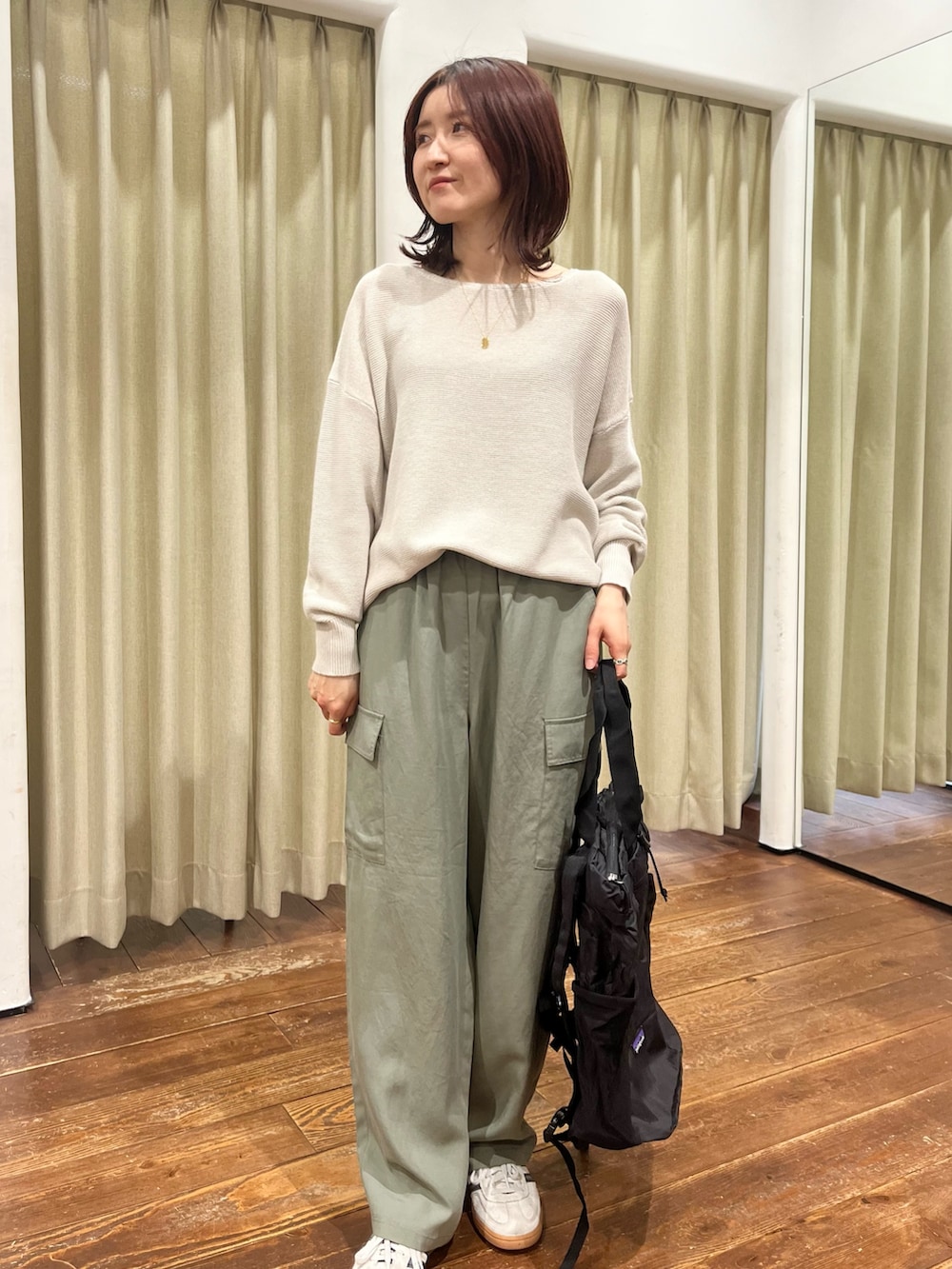 パンツはとろみがあるカーゴパンツでカジュアルすぎず大人っぽく着ていただけます。