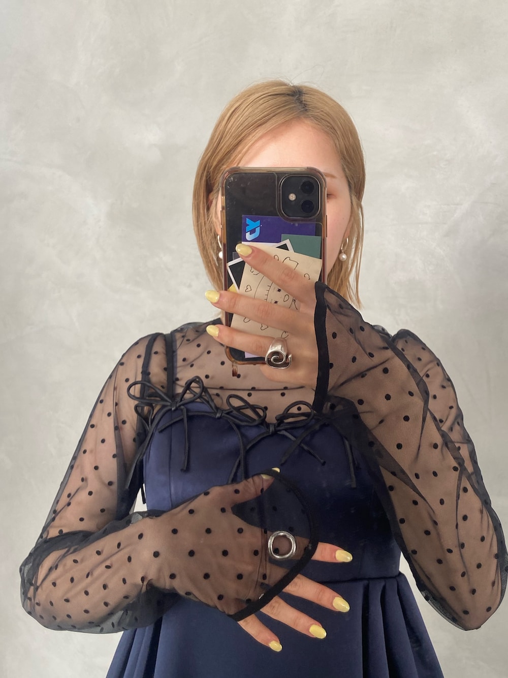 ドット柄のシアートップスとワンピースの