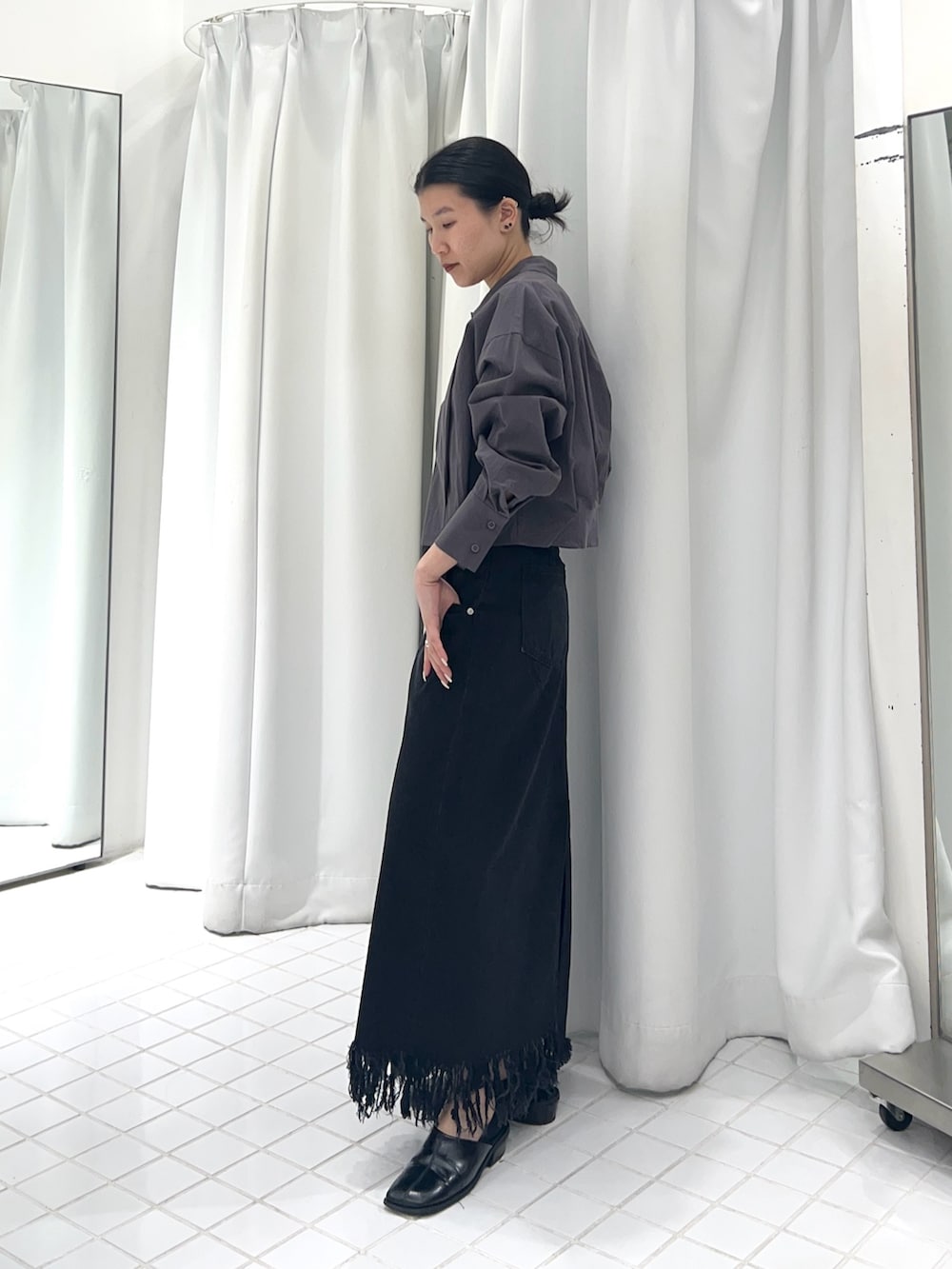 フリンジが目を引くデニムスカートと合わせてモノトーンコーデにしました^^