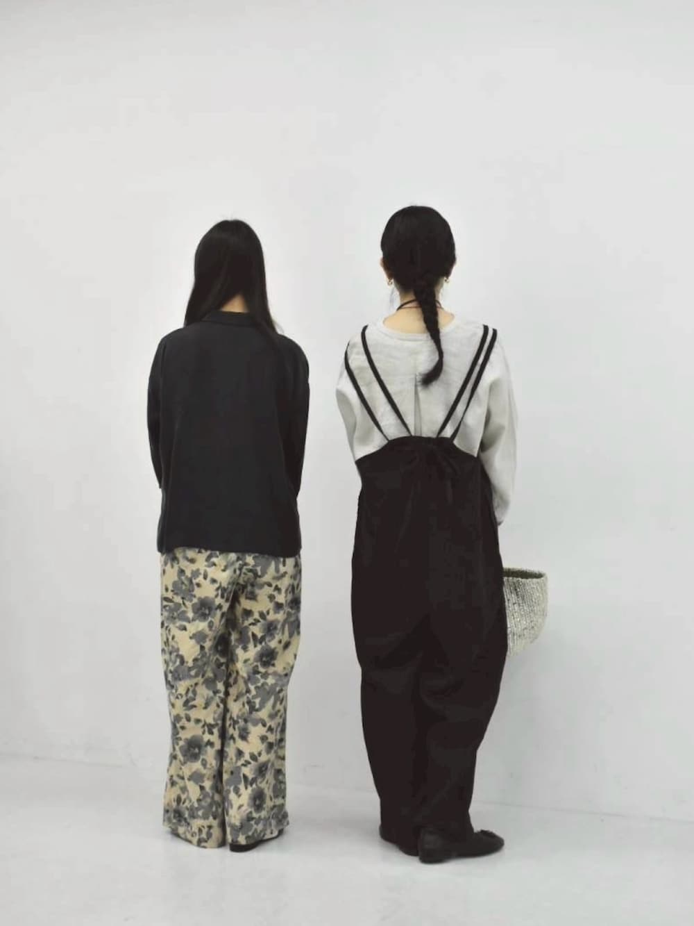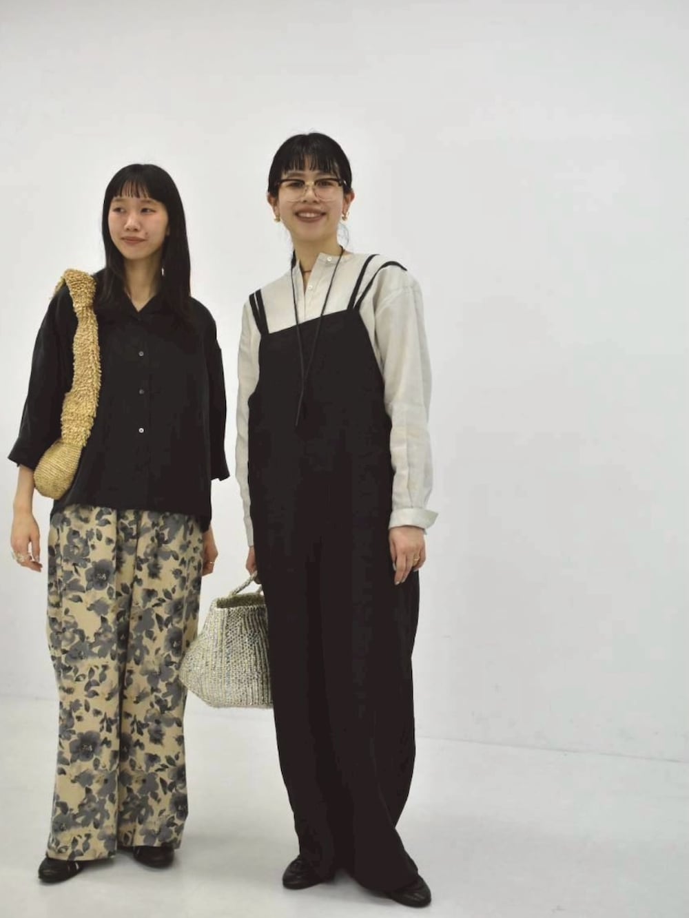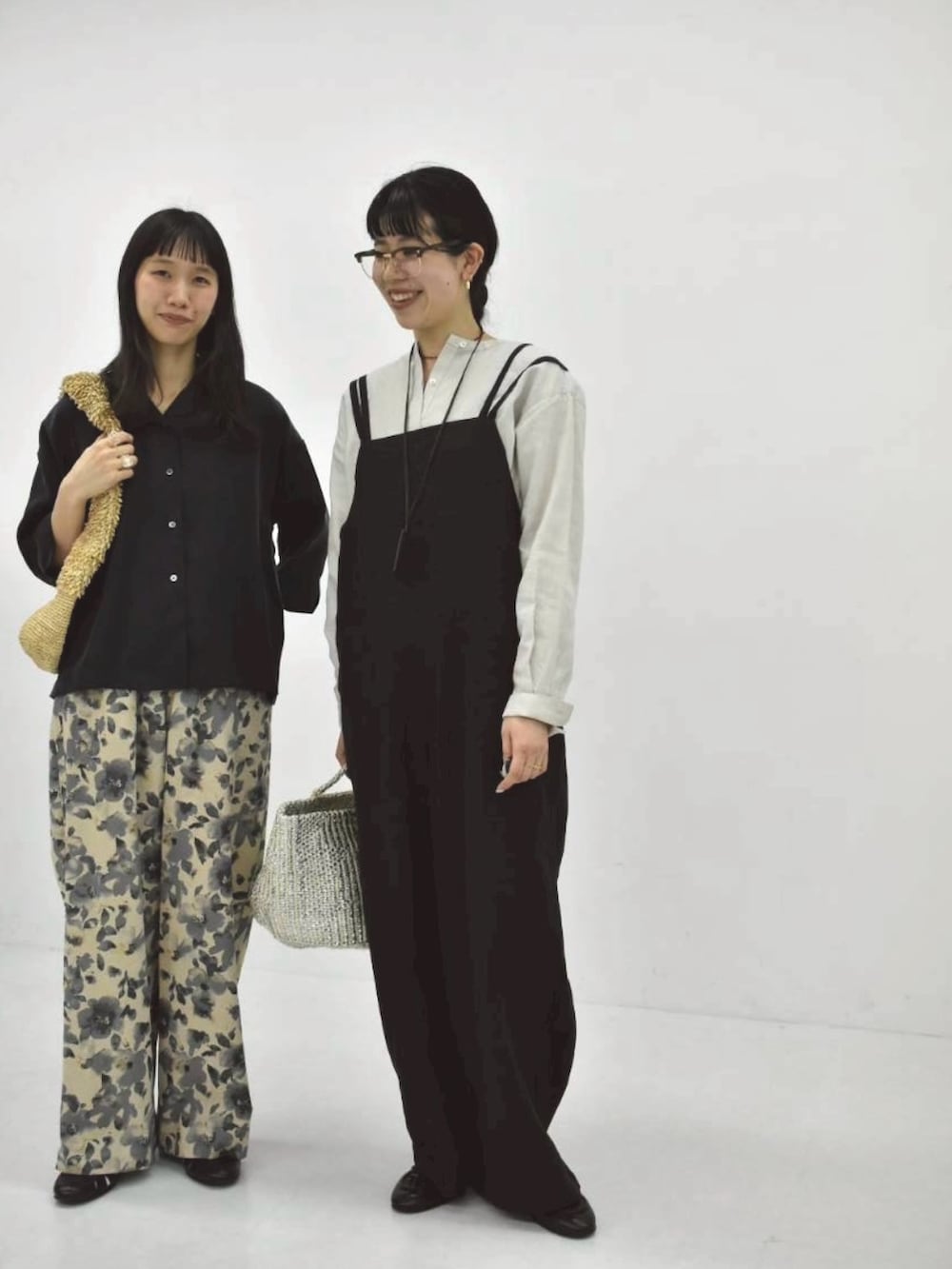 私はキュプラオープンカラーシャツとコットンリネンプリントイージーパンツを着用。