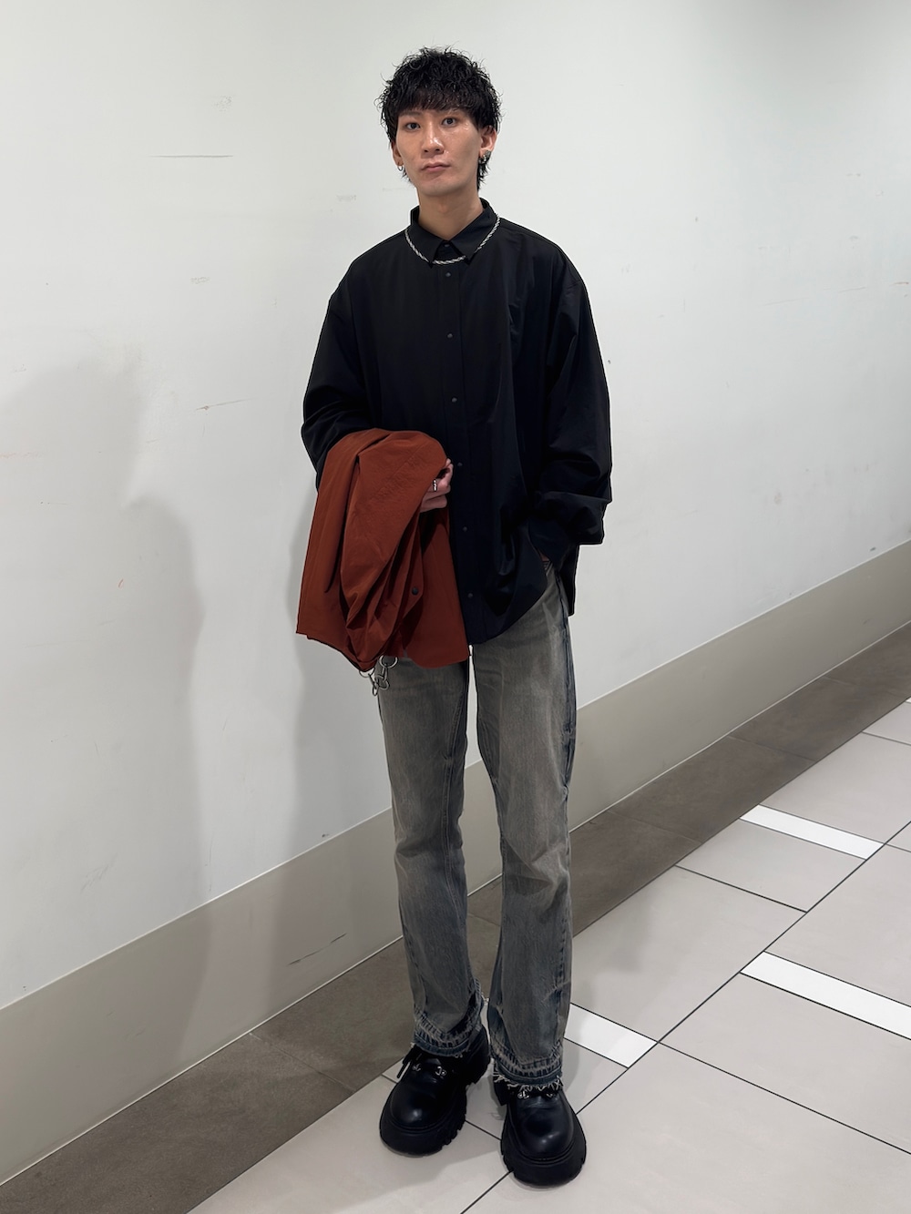 インナーはブラックでまとめて、シャツのカラーを引き立てました。