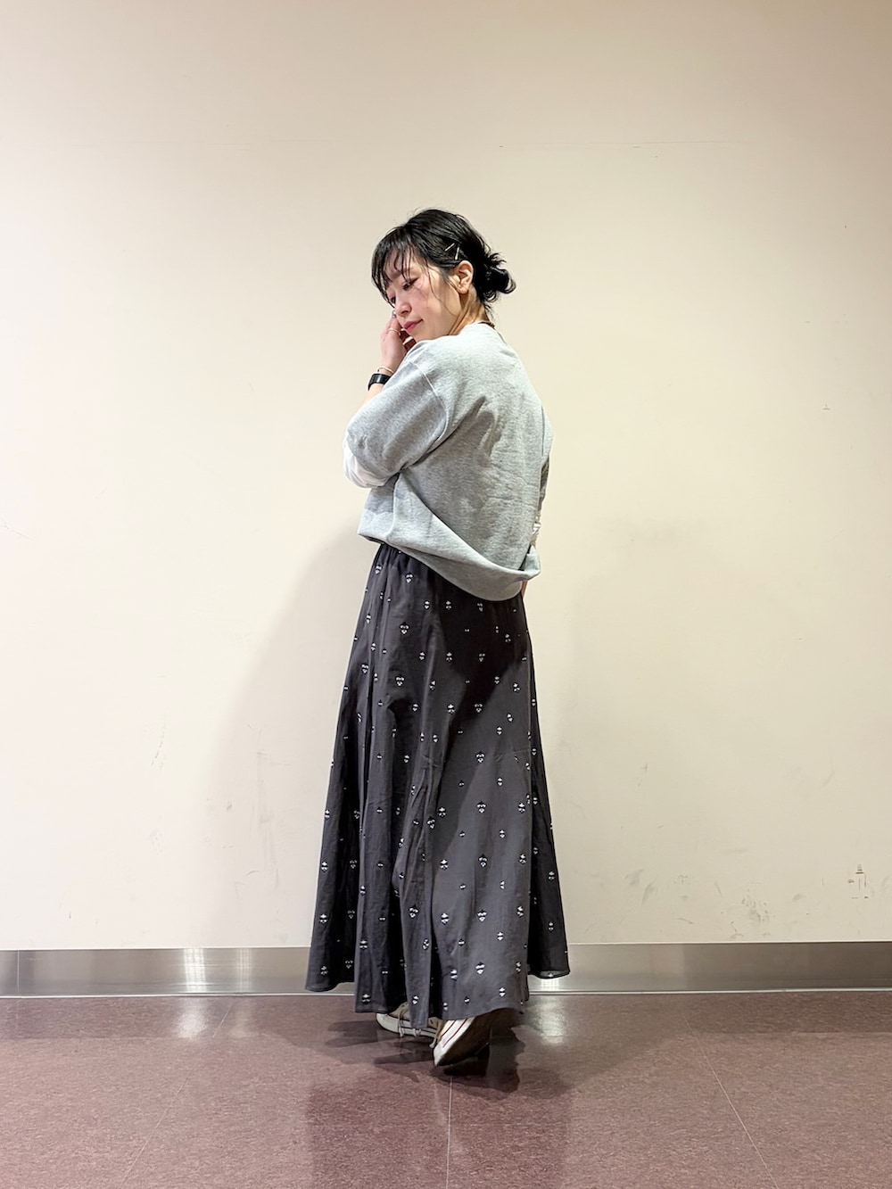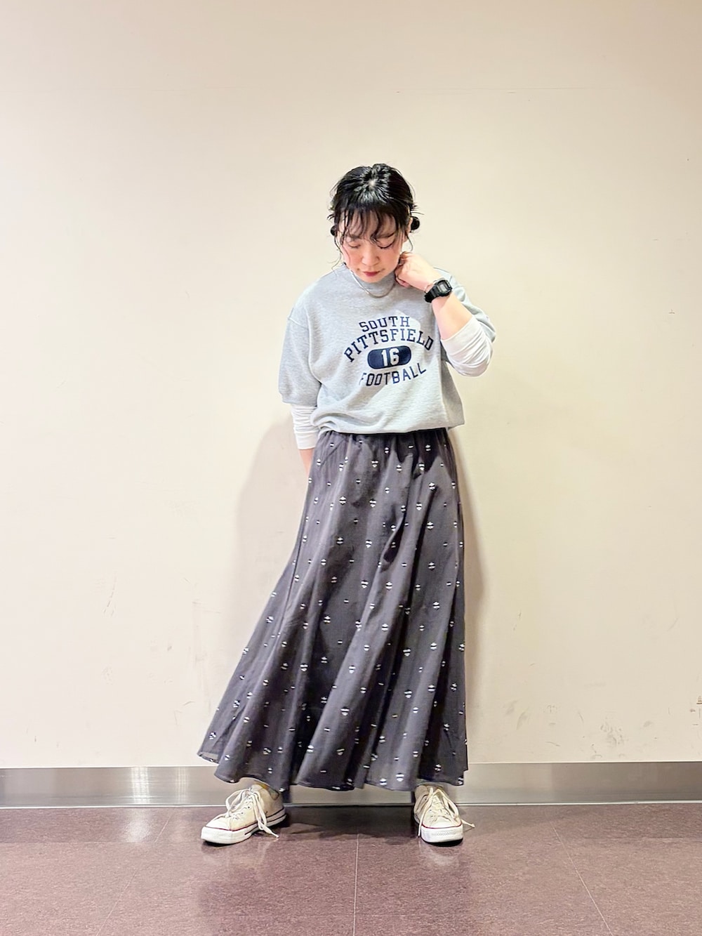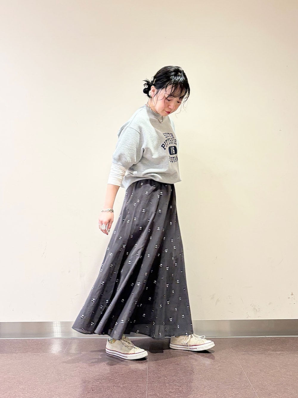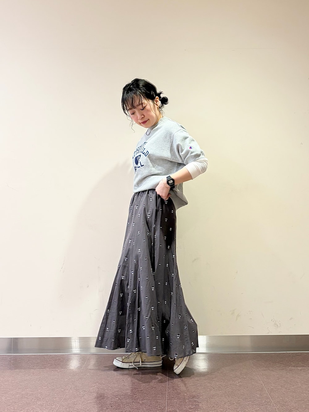 キレイなラインのスカートをあえてスウェットとスニーカーではずしてカジュアルに