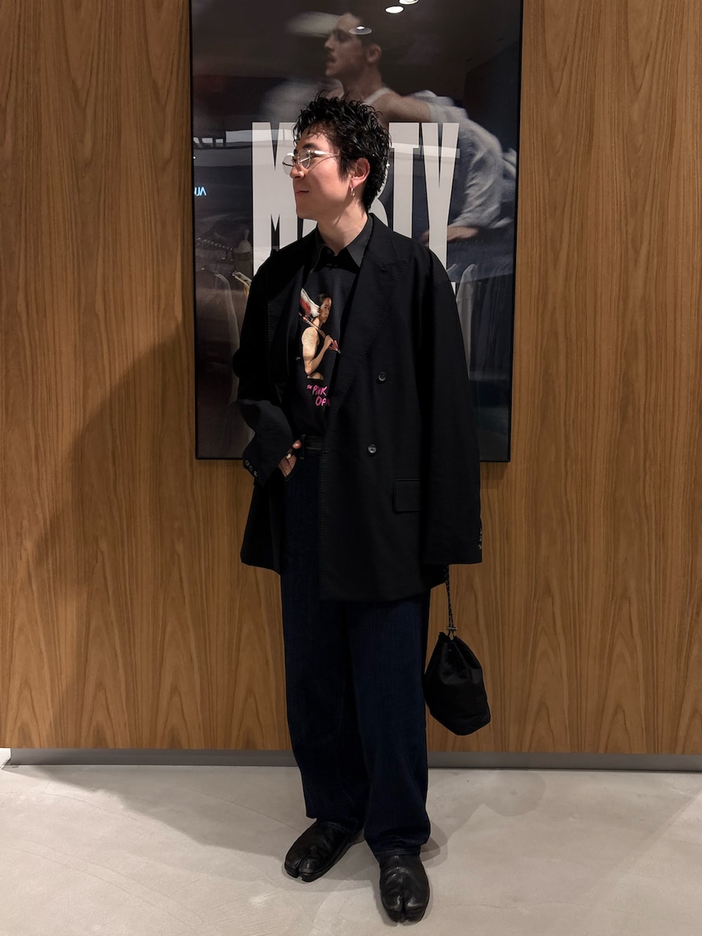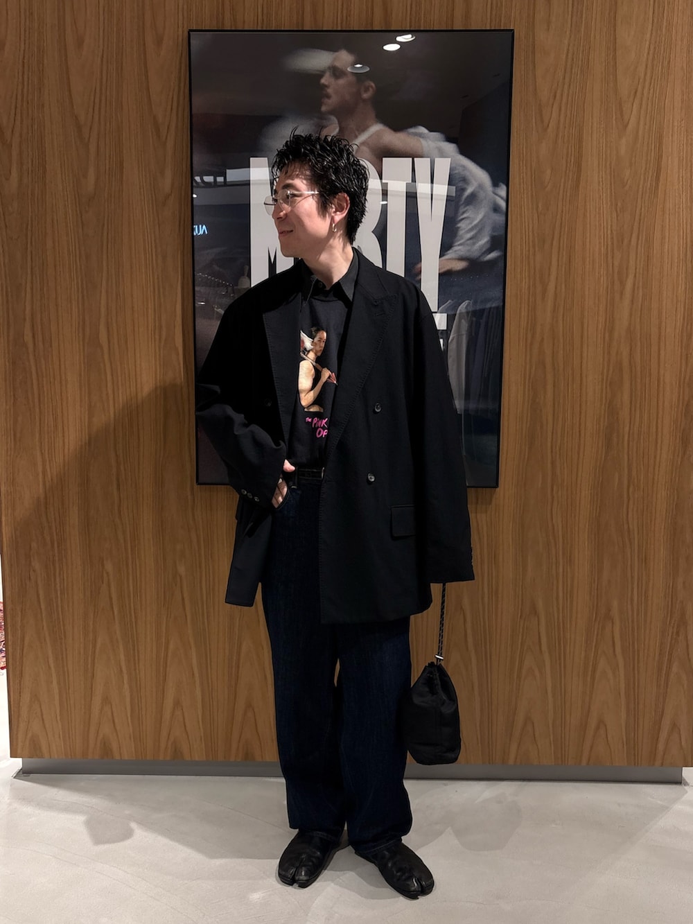 A24のTシャツをベースに黒でレイヤード、統一したスタイリング。