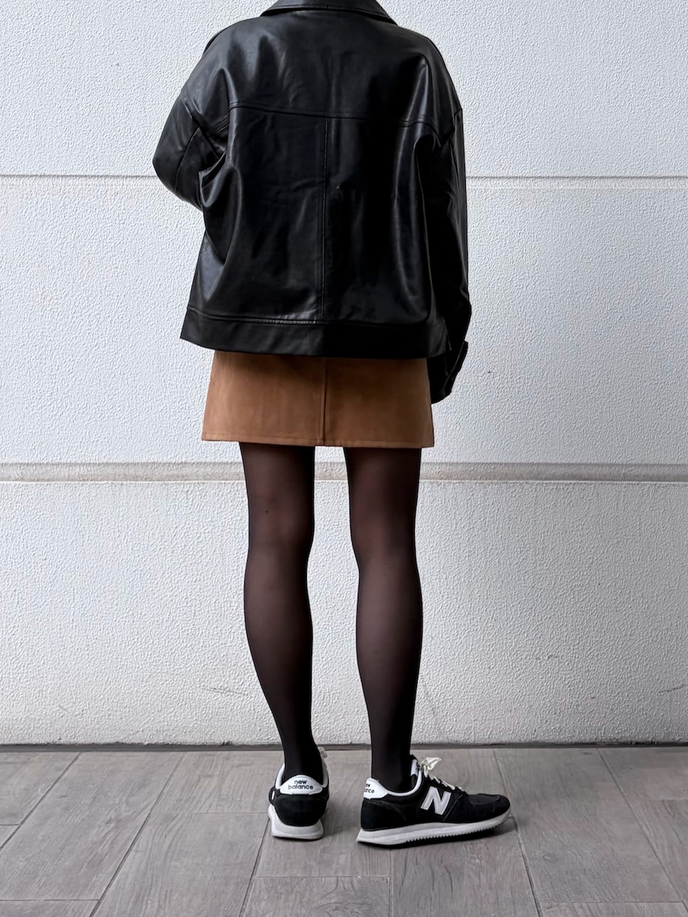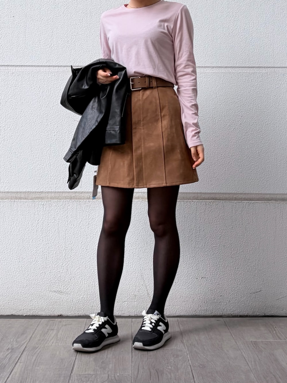 淡いピンクのトップスで優しい印象にし、黒のレザージャケットを合わせて少し引き締めました。