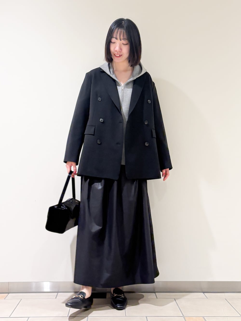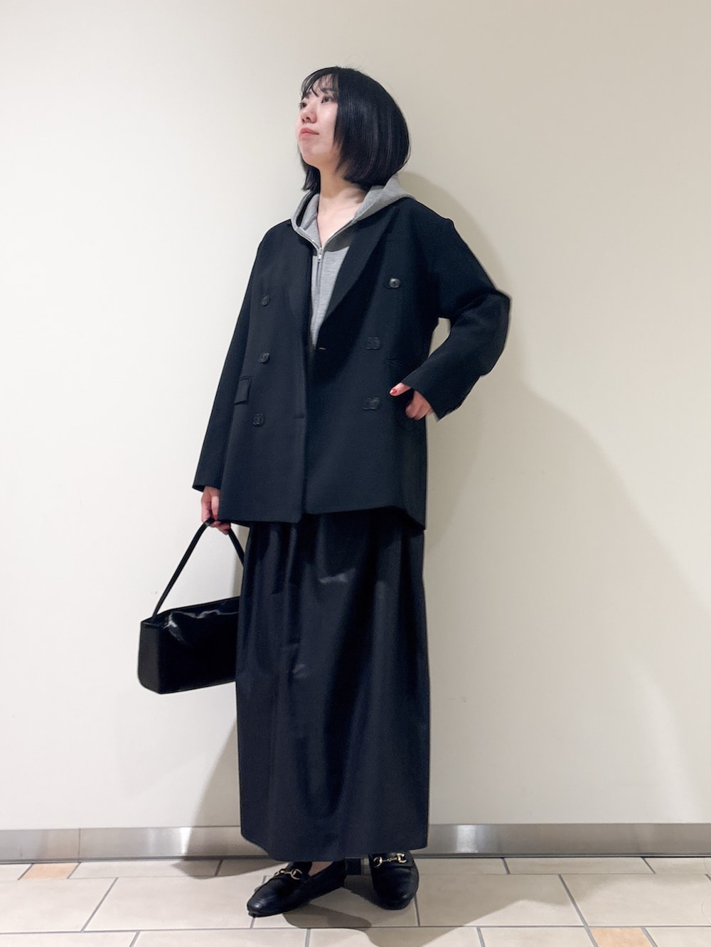 ジャケットとスカートを合わせた外しコーデ◎色はモノトーンで揃えてモードな雰囲気にしました^^