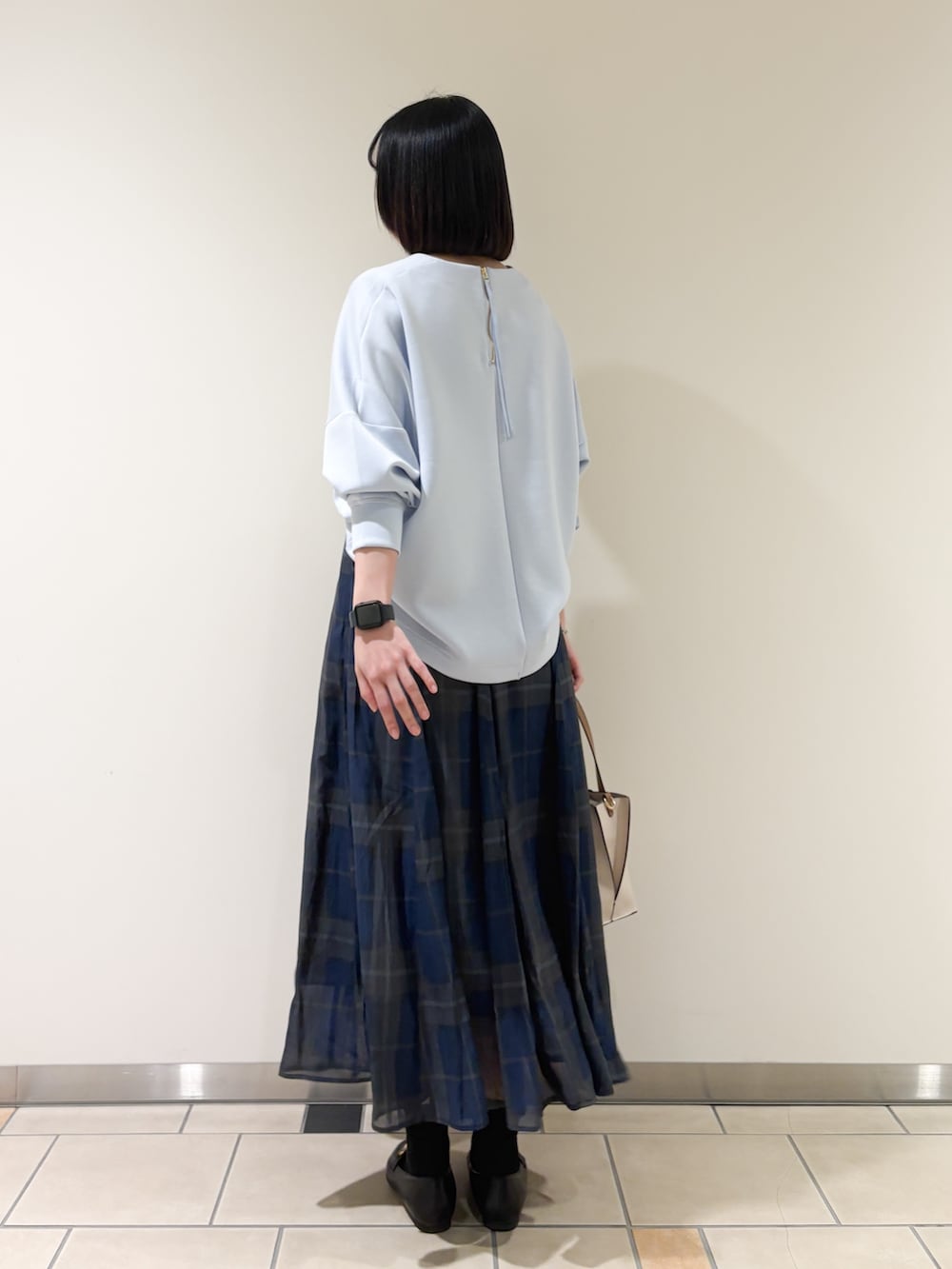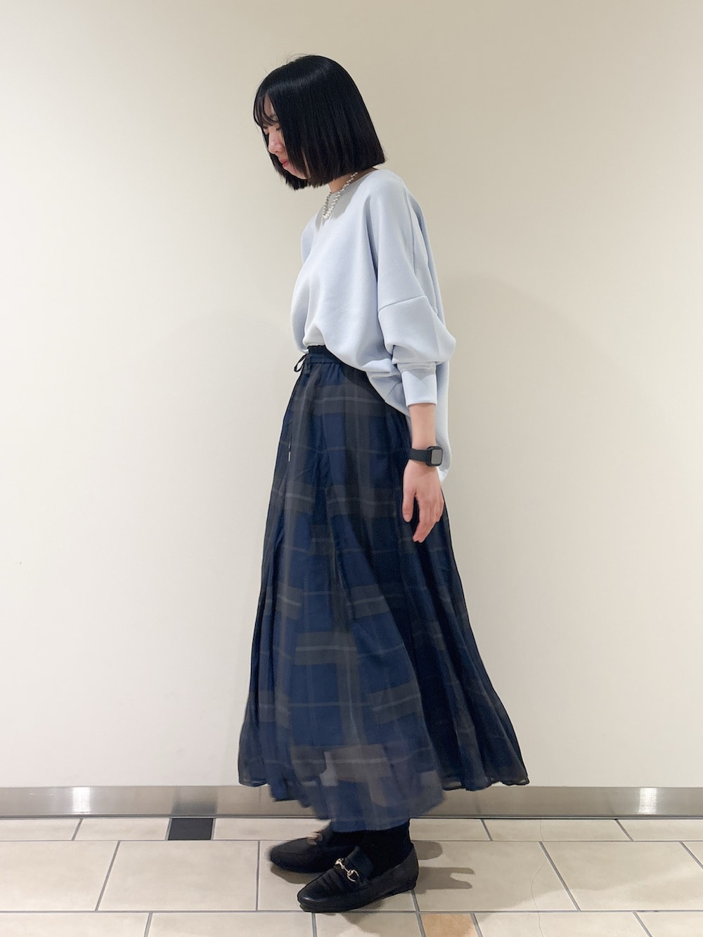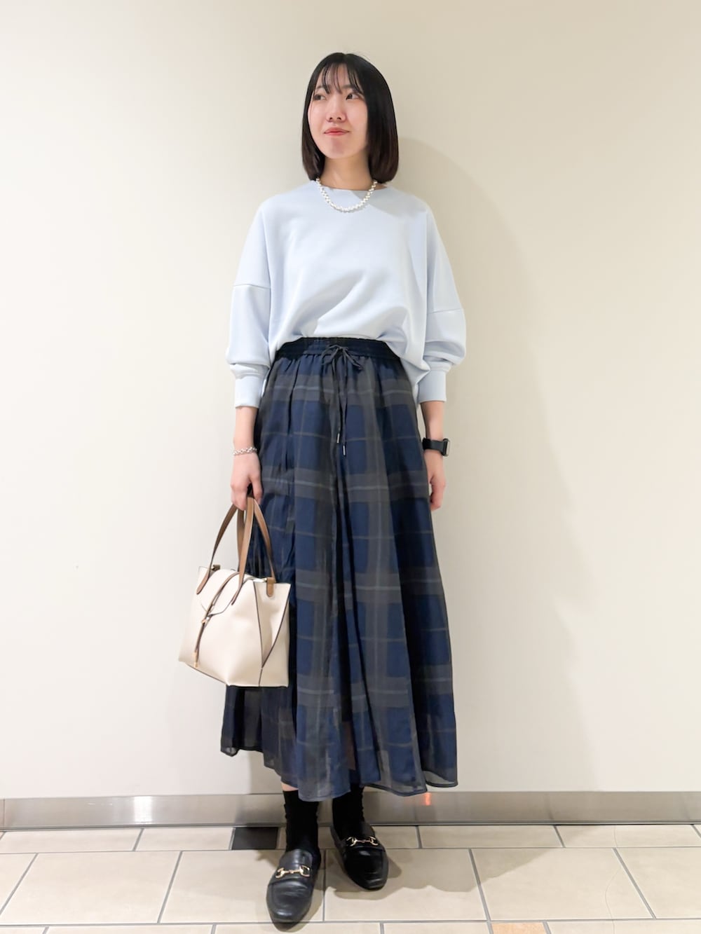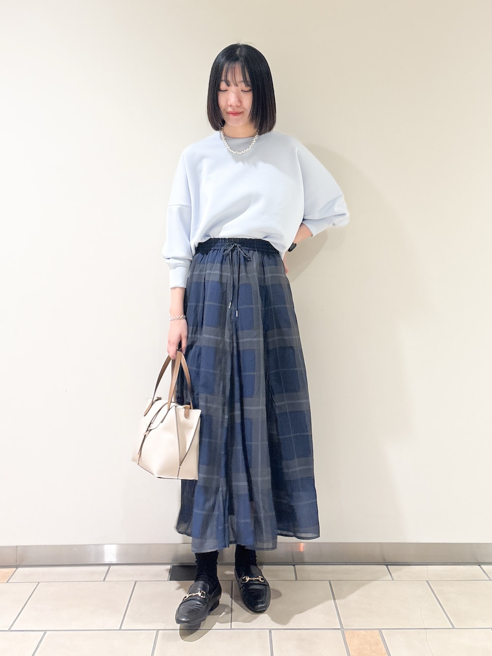 同系色のネイビーチェックのスカートを合わせました◎