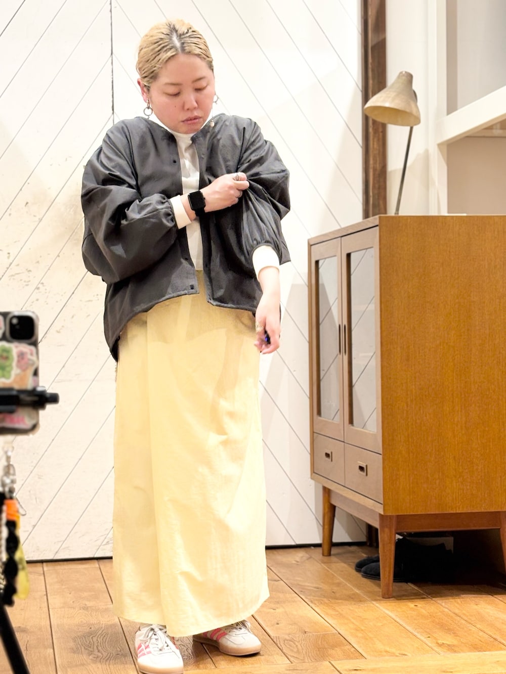 カーディガンは太めのアームで