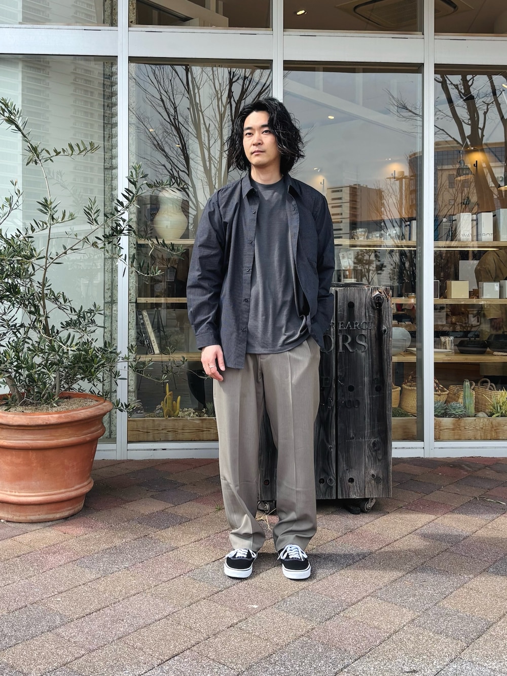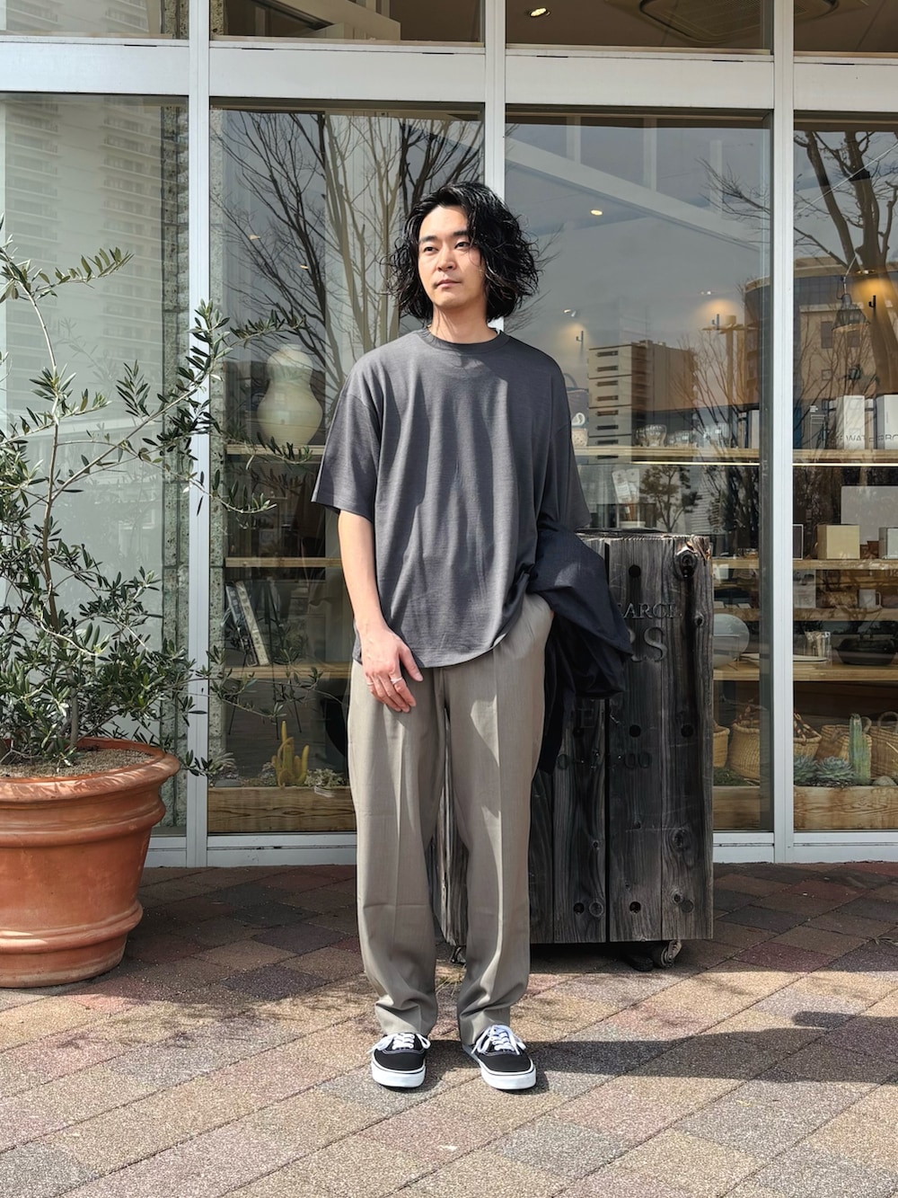 今回は、今の時期はジャケットのインナーやニットのインナーで暖かい日は一枚で大活躍してくれる合わせやすいカラーのアイテムでコーディネートを組んでみました。