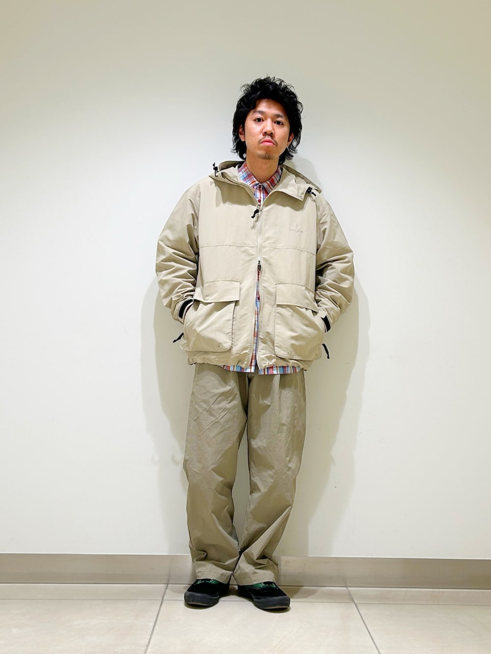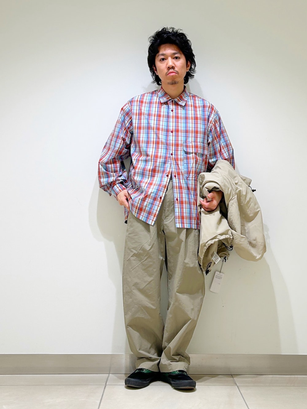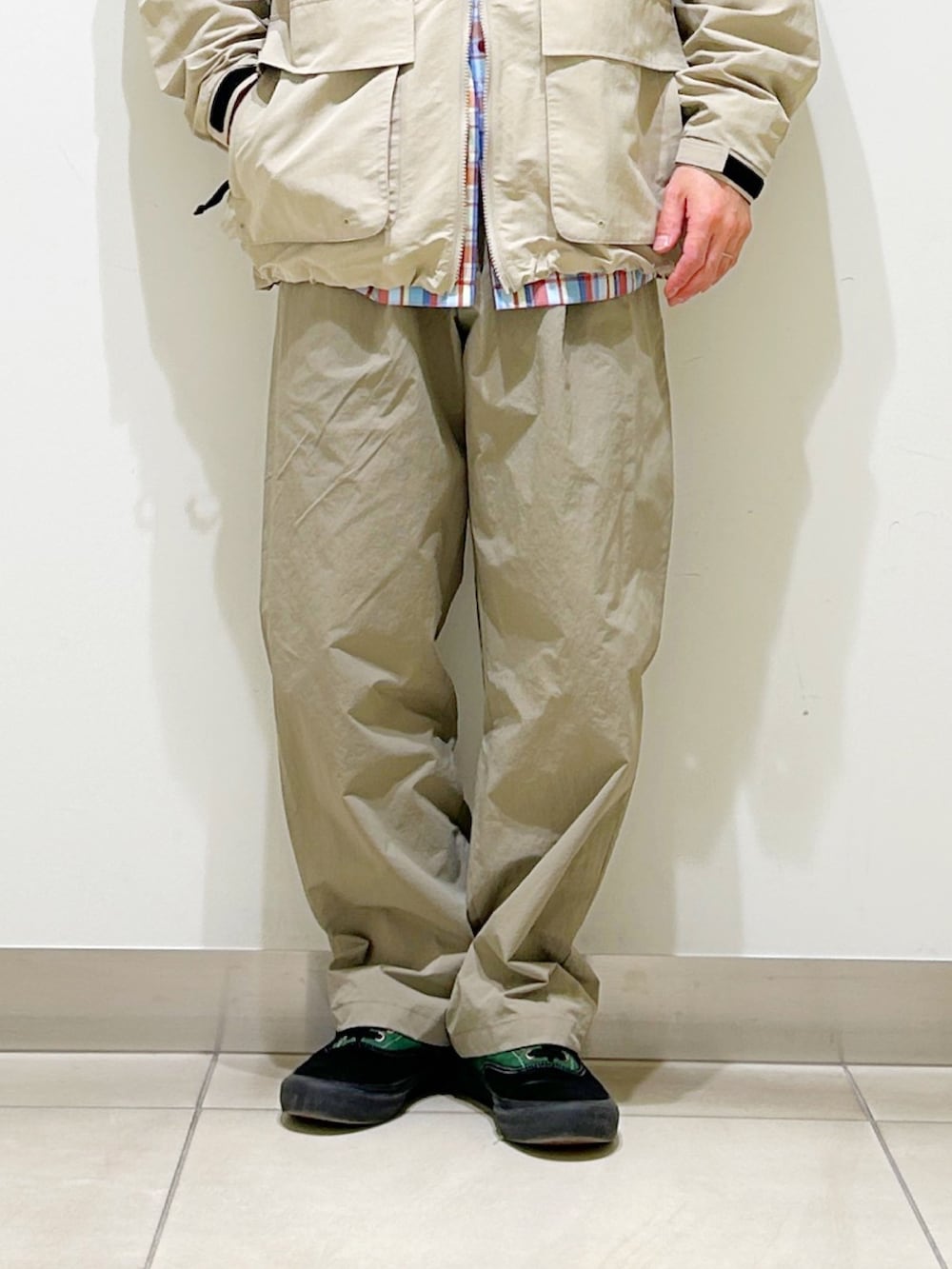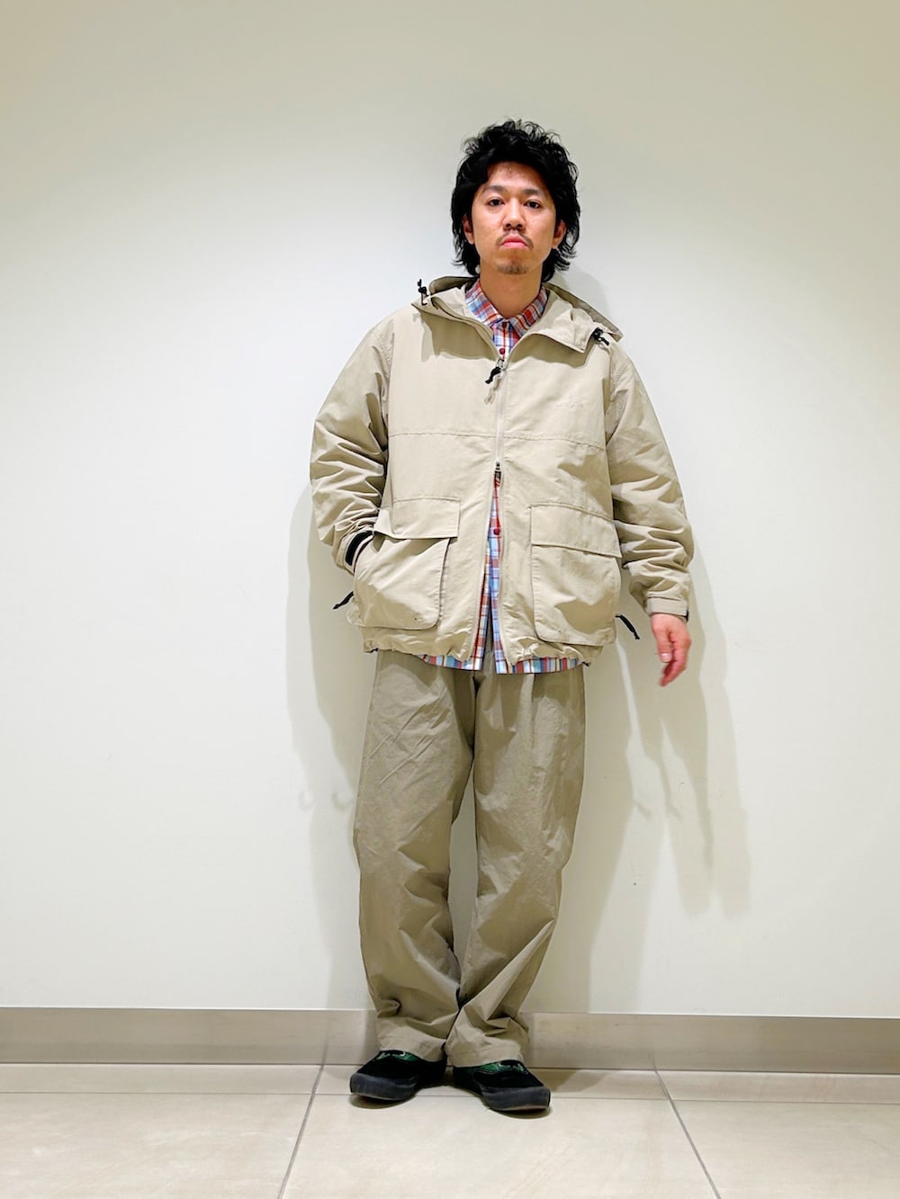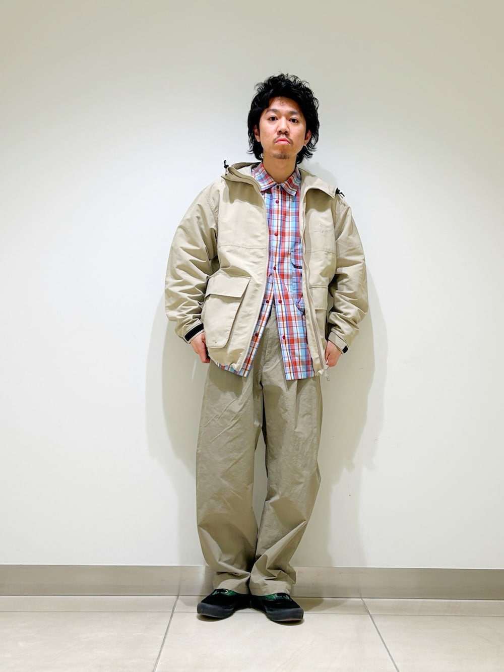 今回はスノーピーク別注のマウンテンパーカーをベースに春らしいベージュカラー×チェックの春スタイルに!