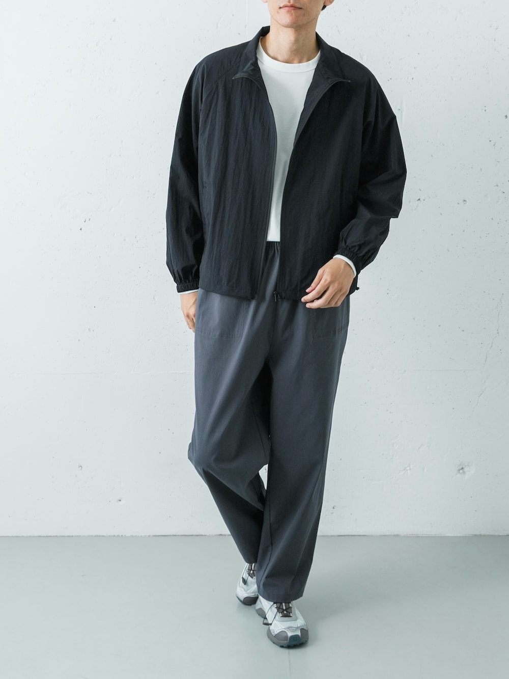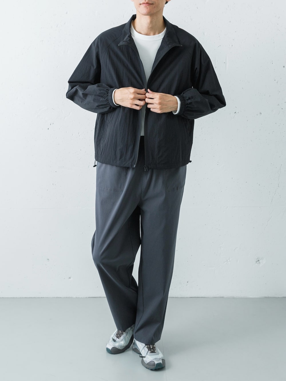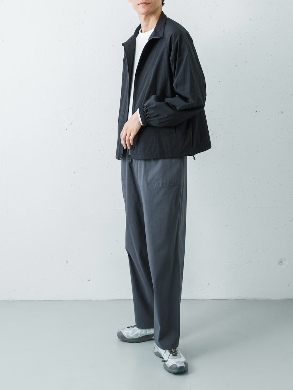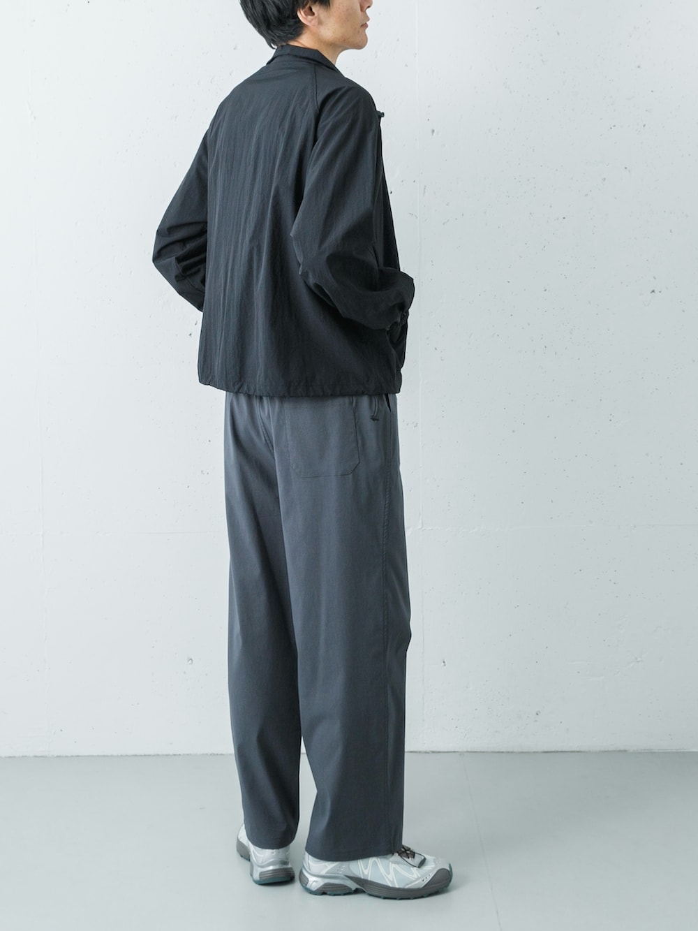 そして足元には、SALOMONのエクスクルーシブモデル「XT-WHISPER」のグレーをセレクト。パンツのチャコールからスニーカーのグレーへ流れるようなグラデーションが美しく、トレンドのアーバンアウトドアを大人っぽく昇華させた完成度の高い着こなしに仕上がります。