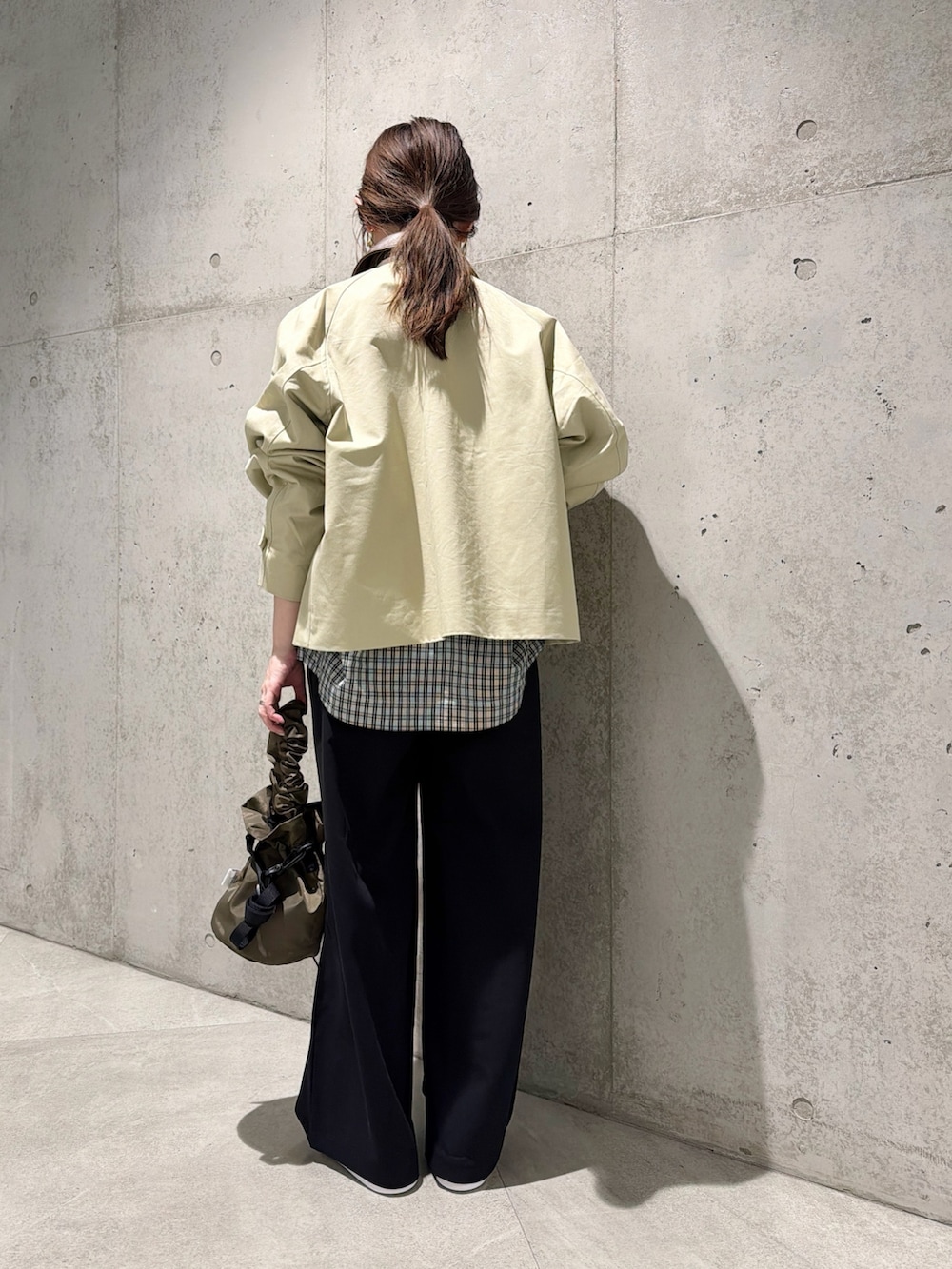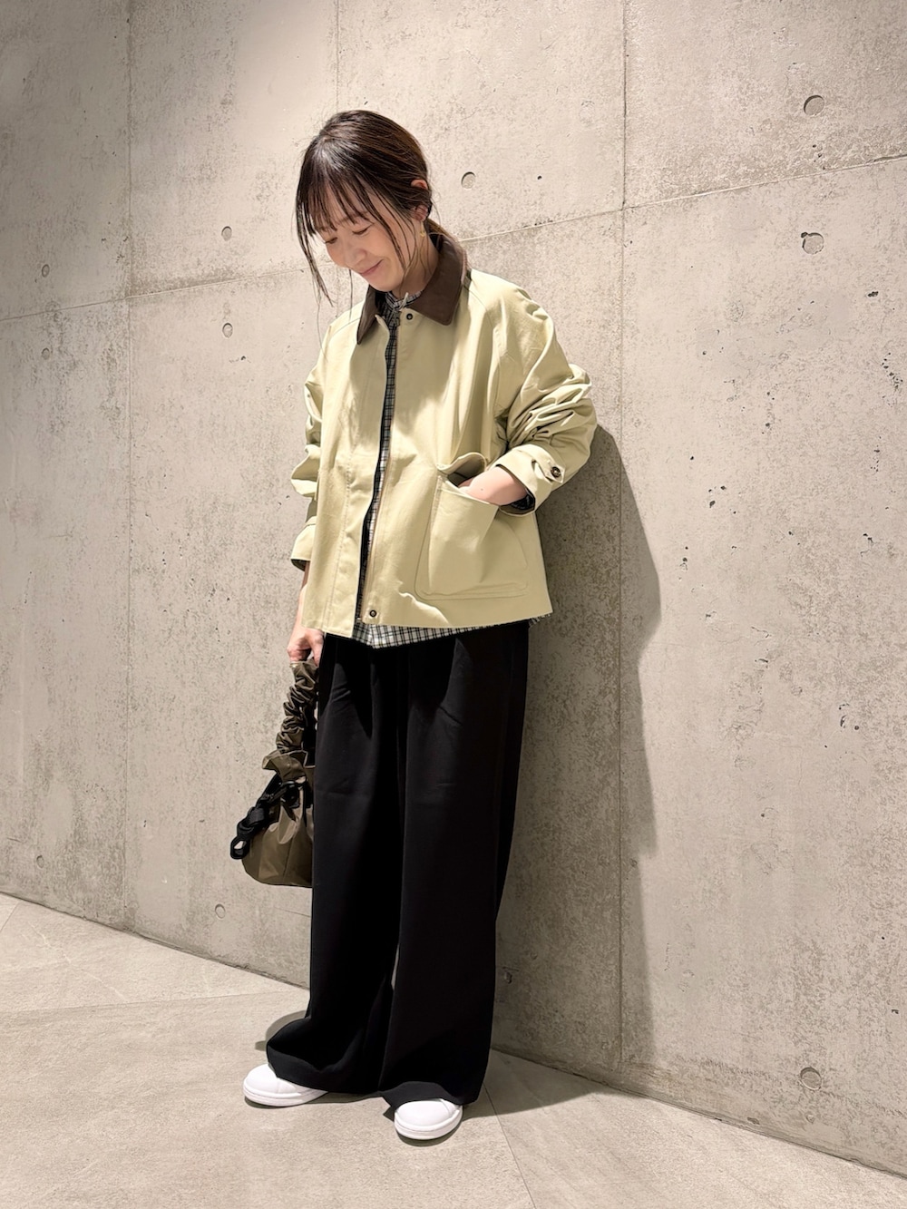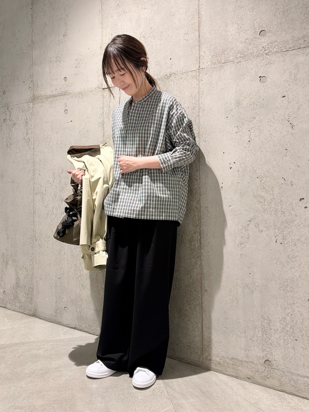 今回は、コクーンシルエットが特徴的なチェック柄のブラウスをポイントにした、大人カジュアルコーディネートです。