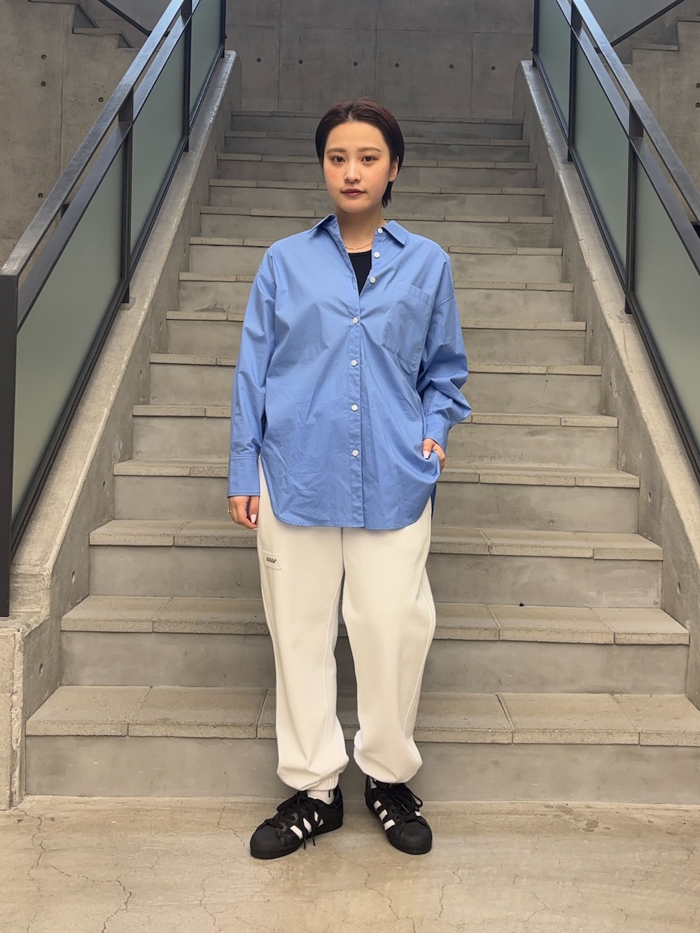 明るい水色のシャツなコーディネート全体が明るく見え、一気に春らしくなります!!