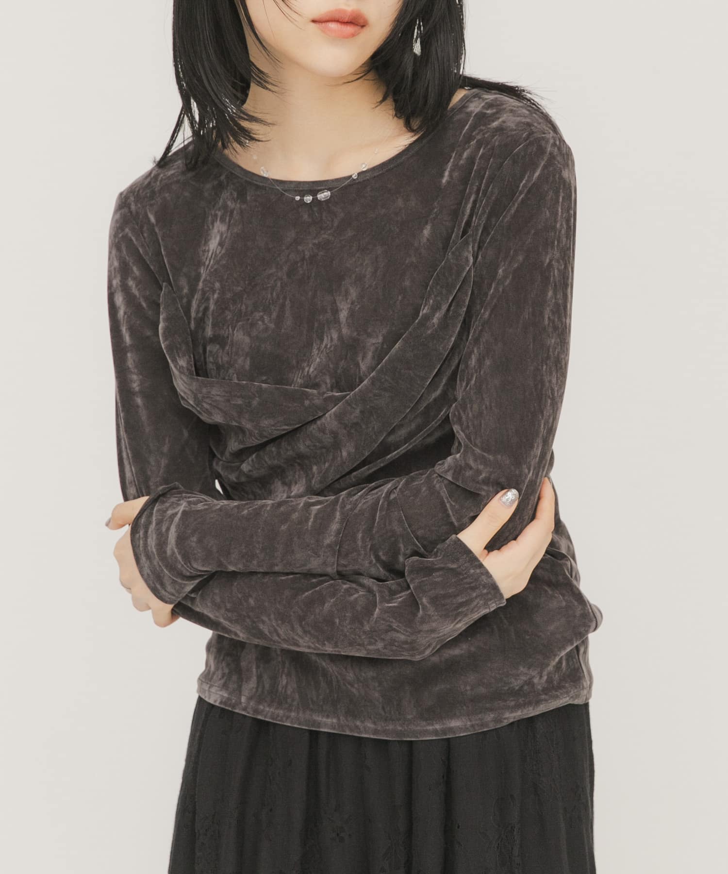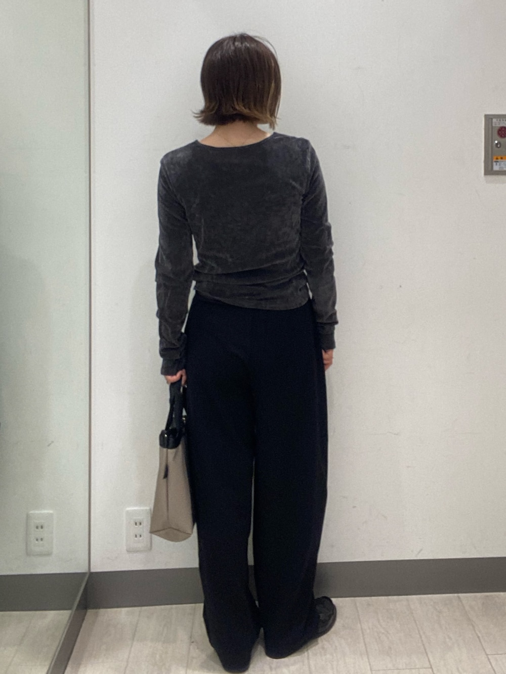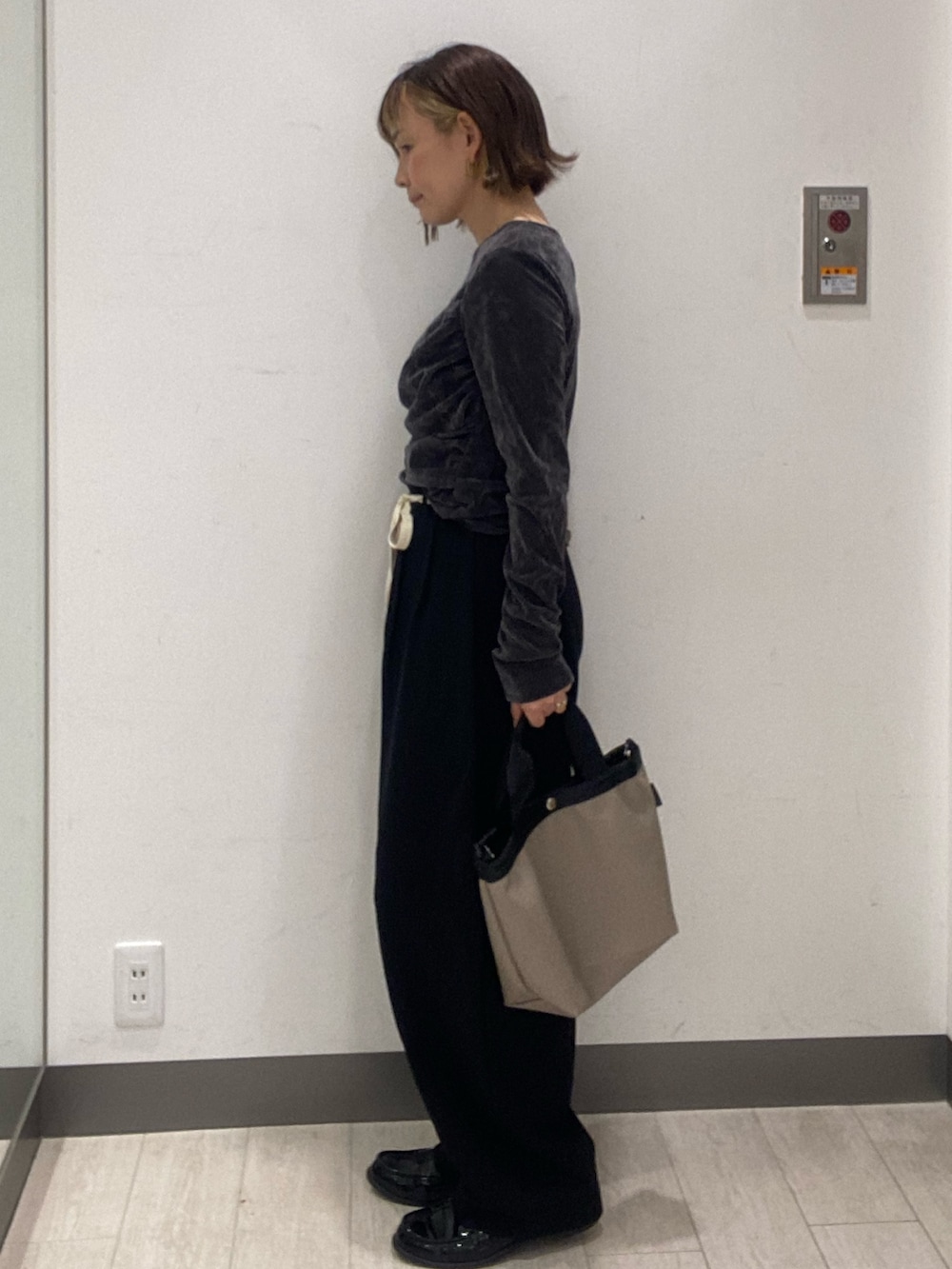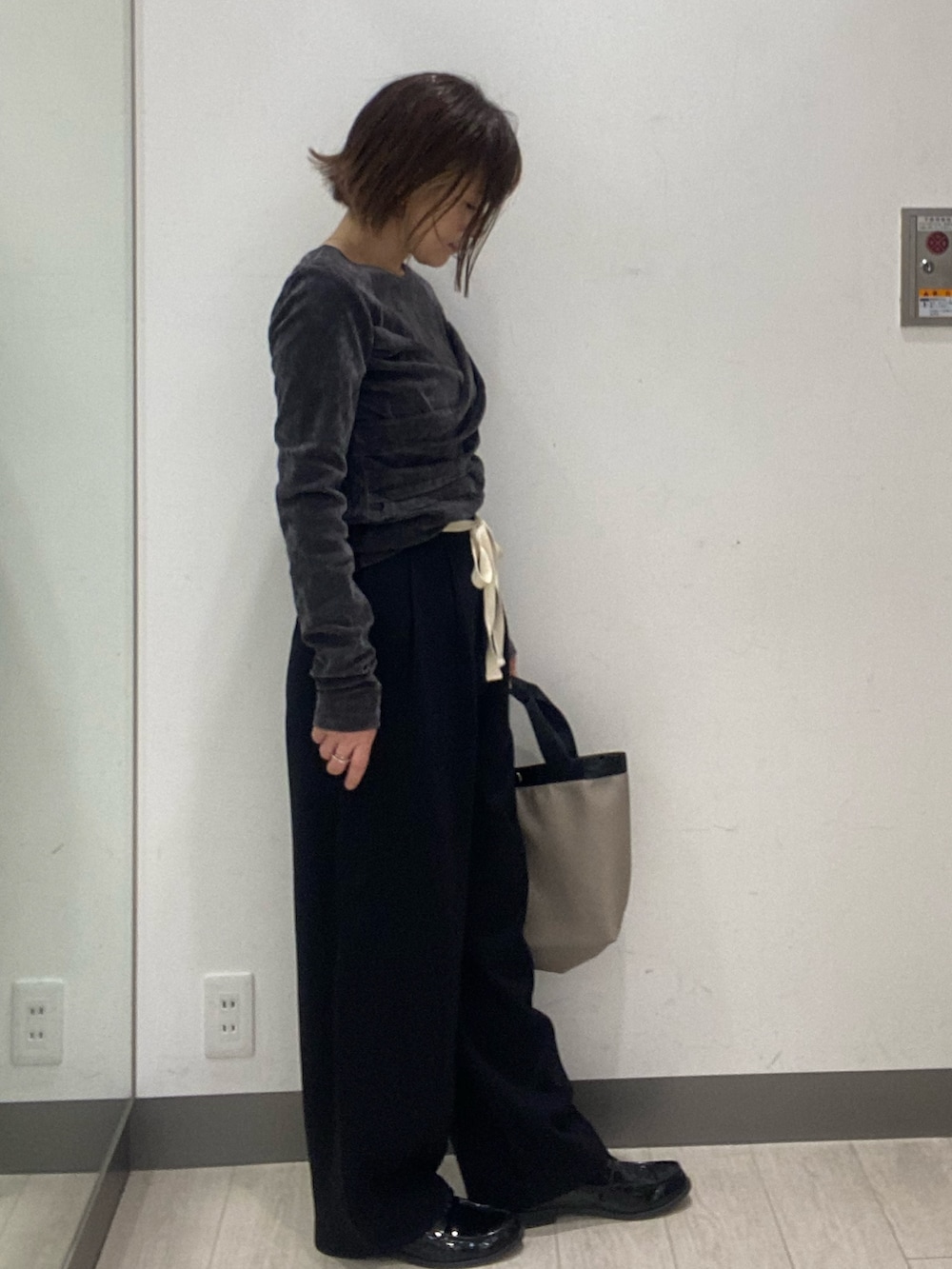 チャコールのシアーベロアクロスドレープカットソーに、ウエストのリボンがポイントのカーブパンツです。