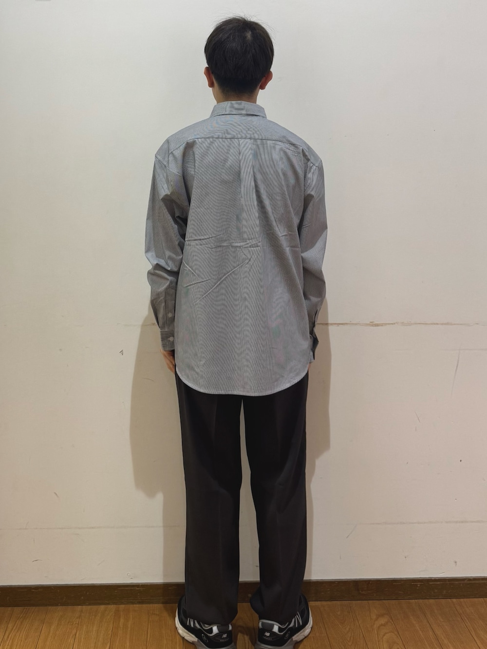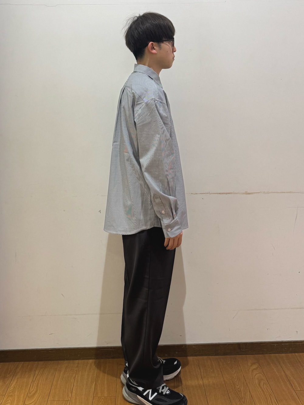 ストライプのシャツにキレイめなパンツを組み合わせて、コーディネートいたしました