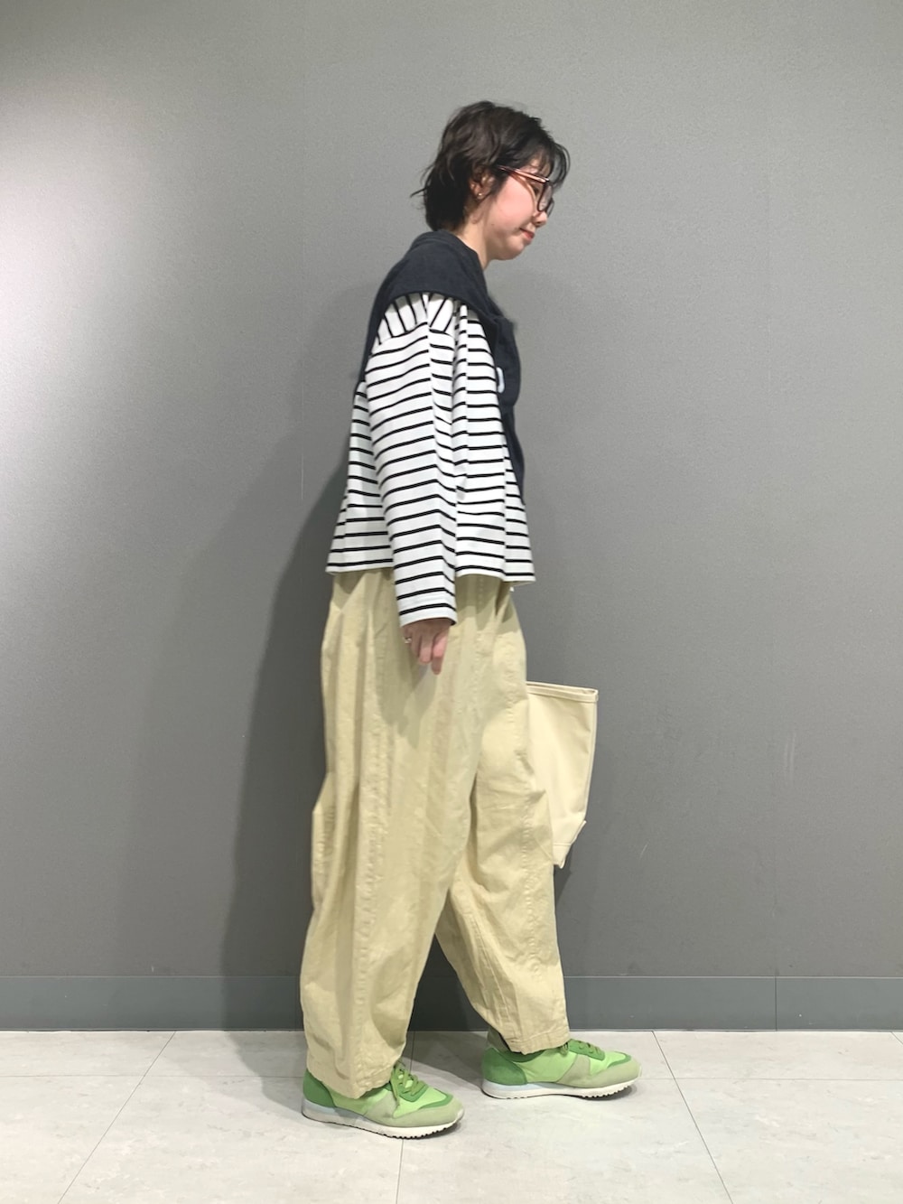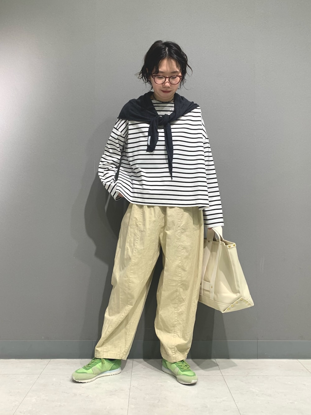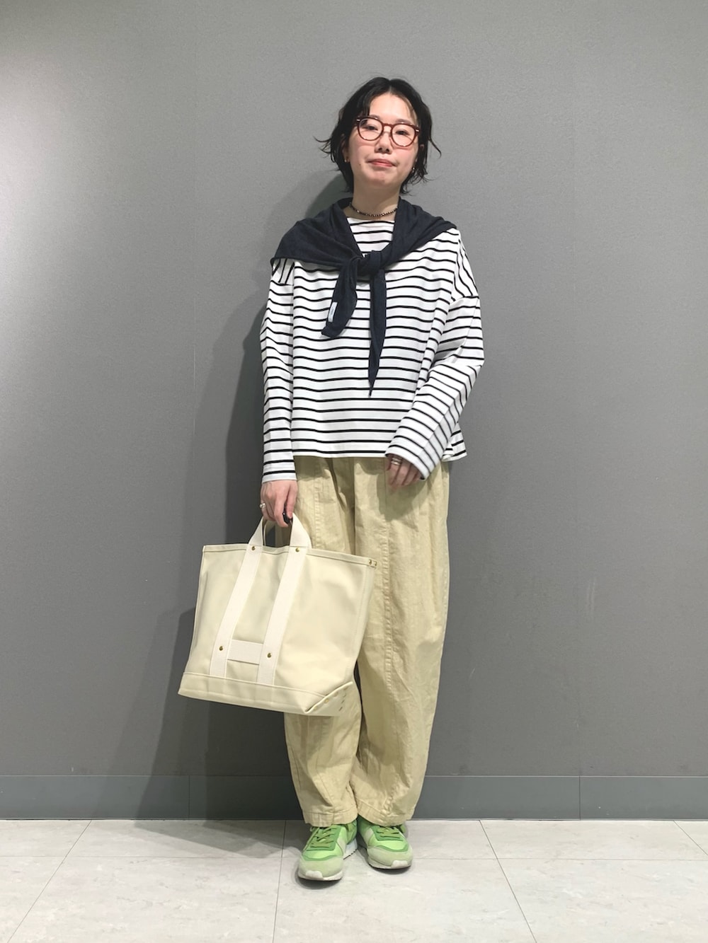 少し短めのボーダーカットソー。若干厚みがあるため一枚で透けもなく着やすいです。万能に使えるため一着あると重宝します。