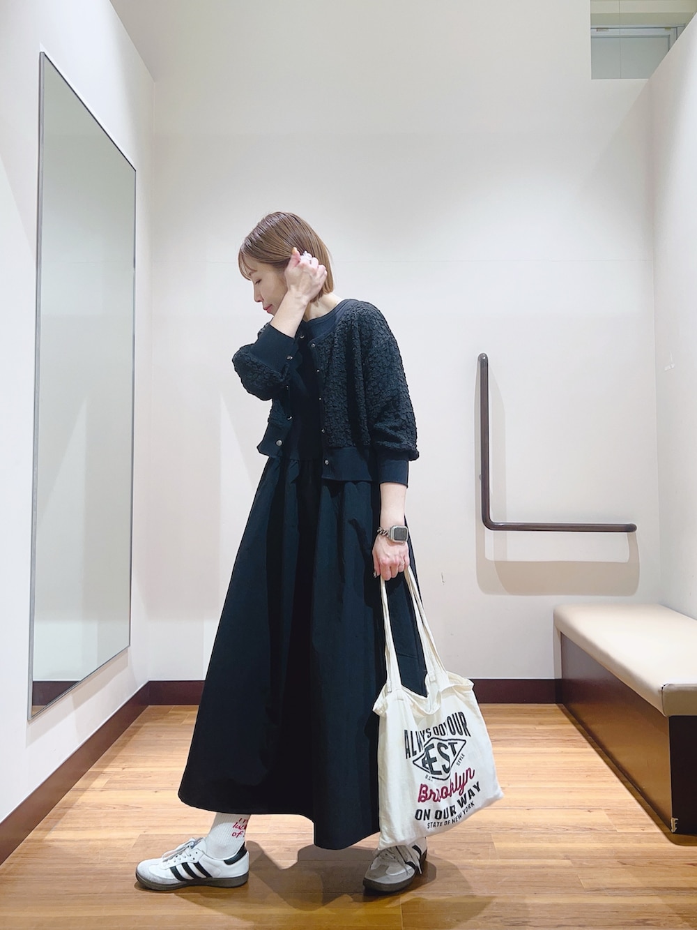 カーディガンはポコポコした素材で、柔らかくて着やすいです✨