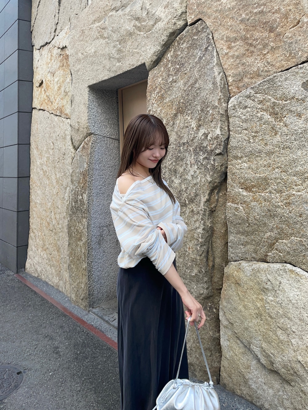 トップスはUR別注のマルチボーダー2WAYカットソーです!写真の着方は襟元のボタンを外してオフショルにして着てみました✨もちろんそのままでも可愛いのと、大人っぽいボーダーでスカートからデニムなどカジュアルなアイテムにも合わせやすいと思います!