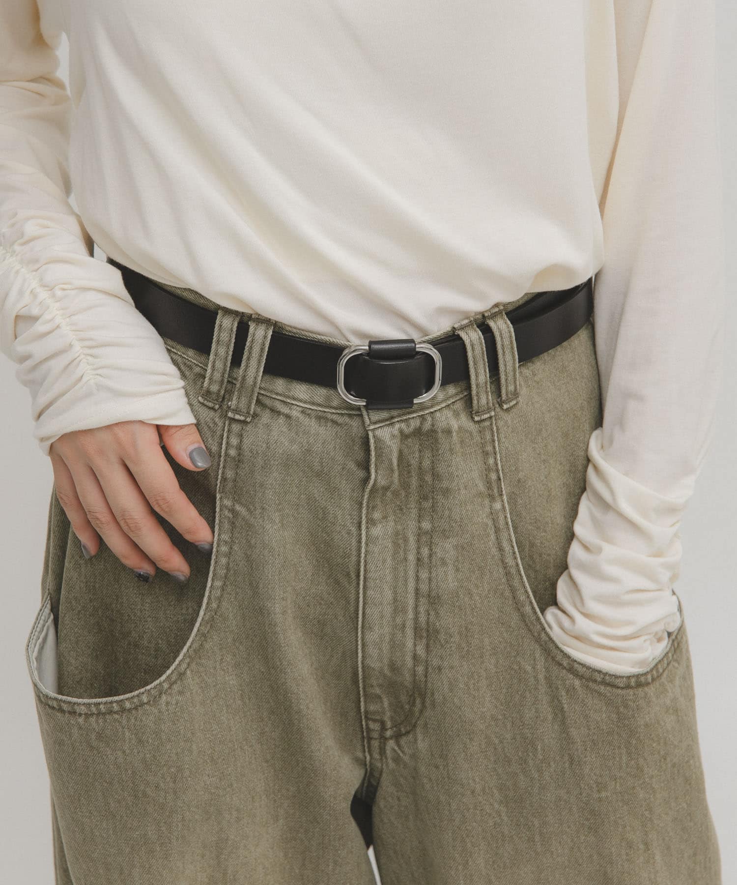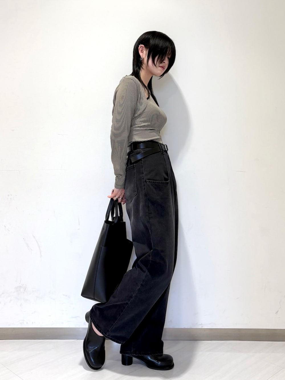 トップスがタイトなので、ボトムスはBIGポケットデザインデニムでほどよいゆる感を出しました。