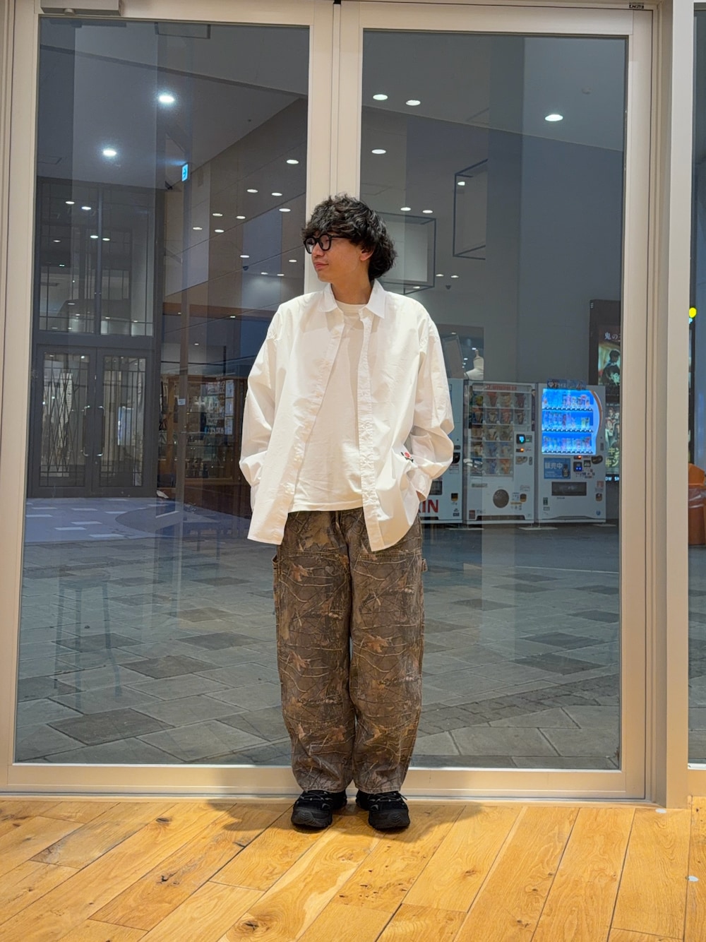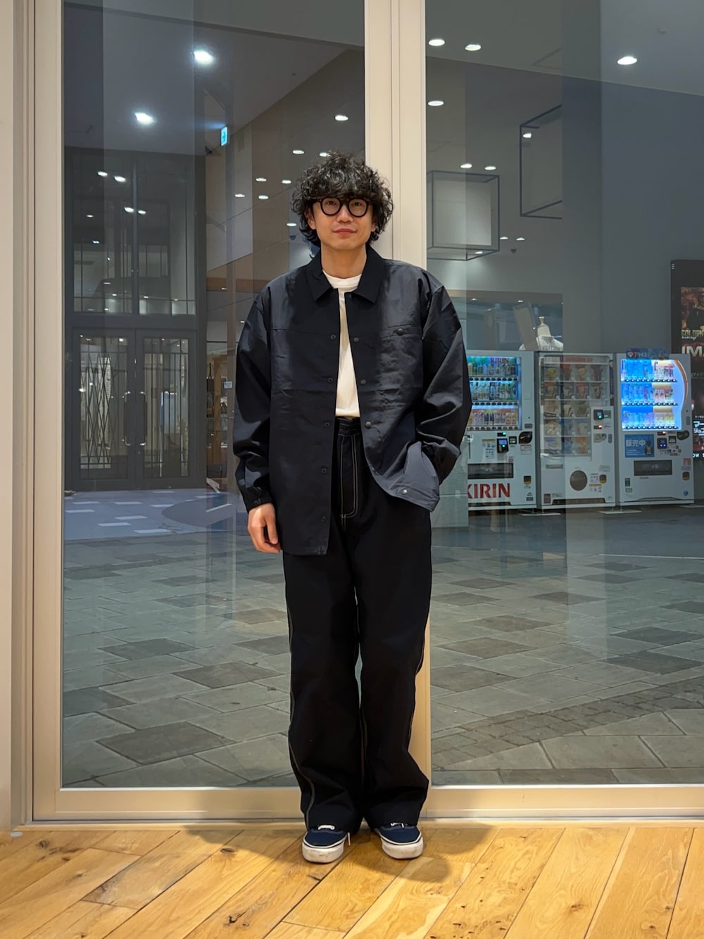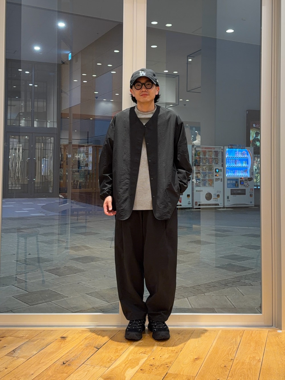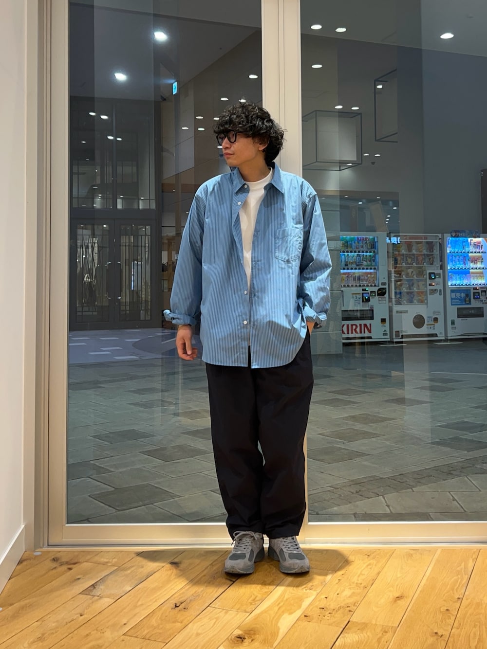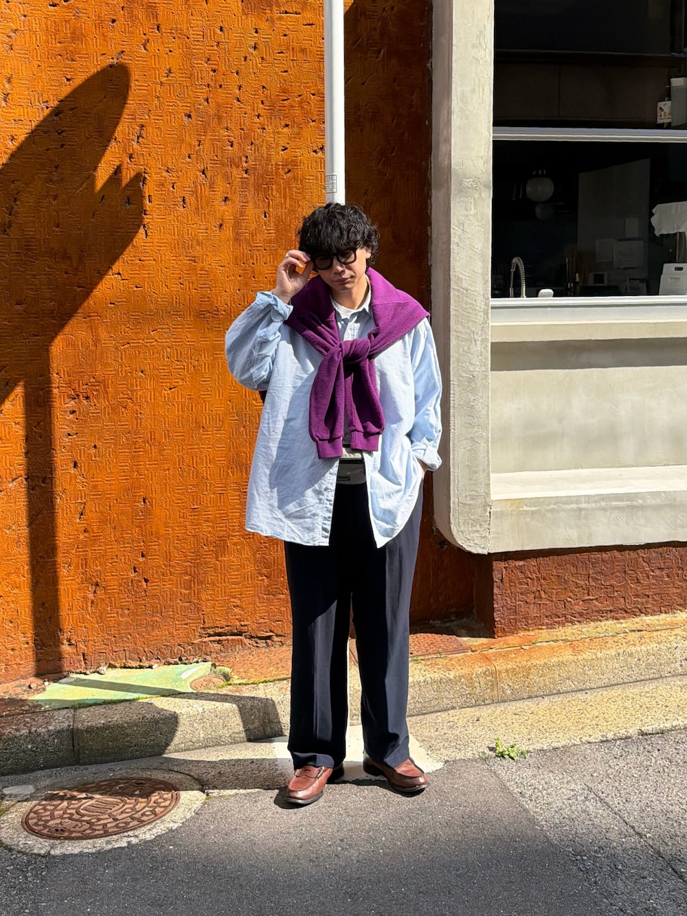 バンドカラーのシャツはフロント開けて羽織りとしても!