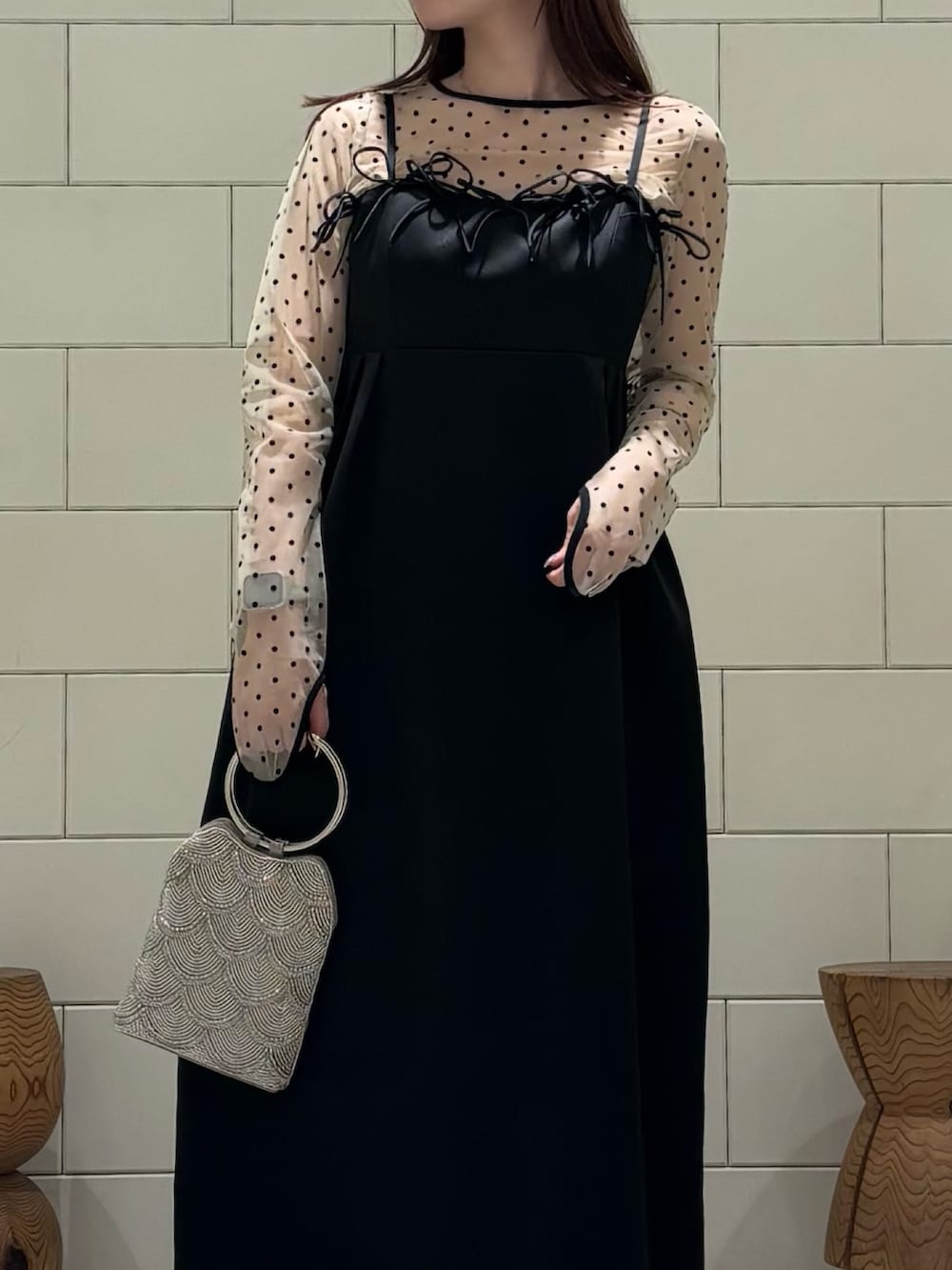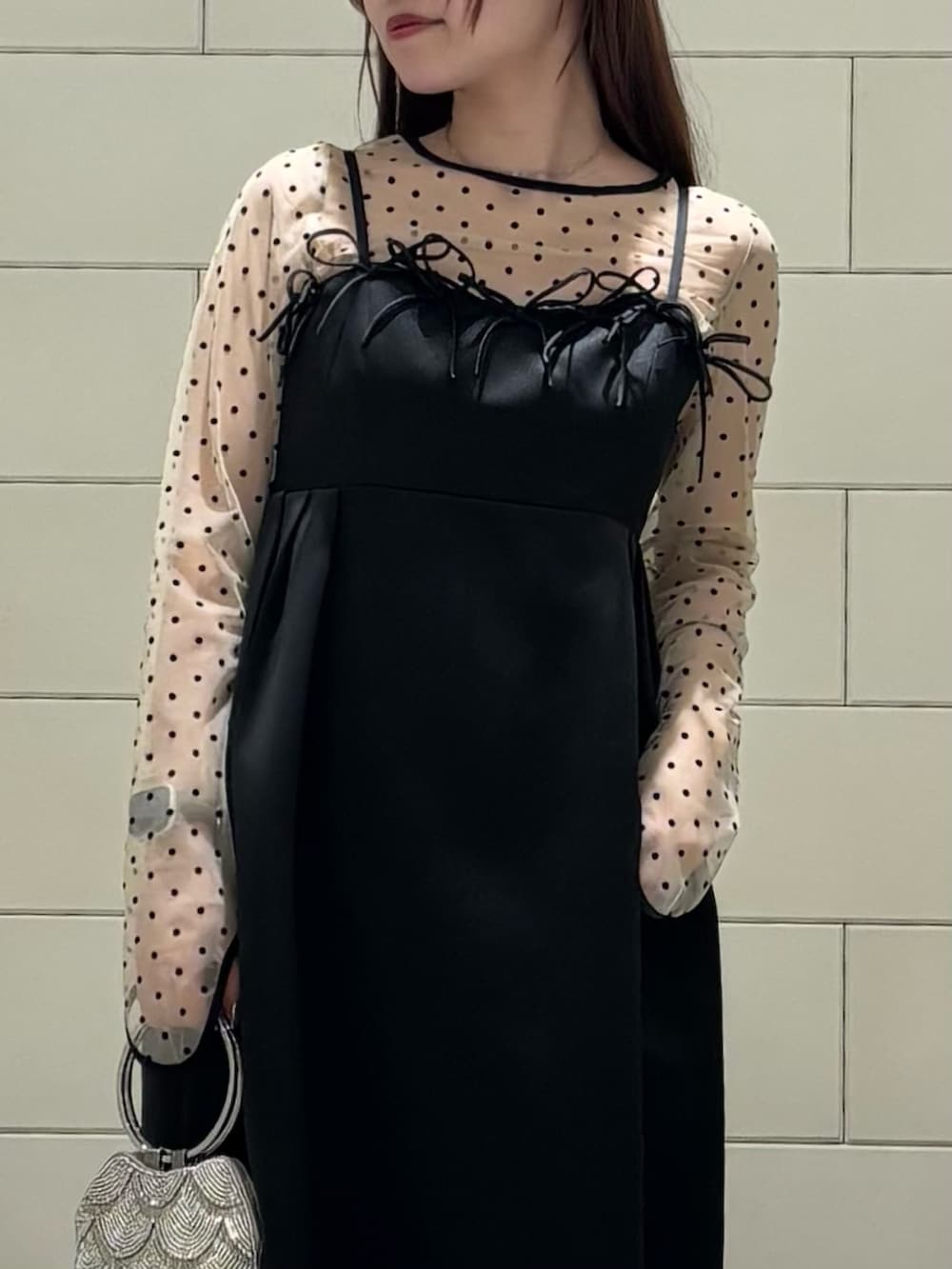 ドットトップスセットのワンピースです。トレンド感のあるドットと胸元のリボンが散りばめられたデザインは特別感があります。【ROSSO/ANDRESD/CR26210-2130002/RIBBONSDRESS×SHEER TOPS/BLACK/M】