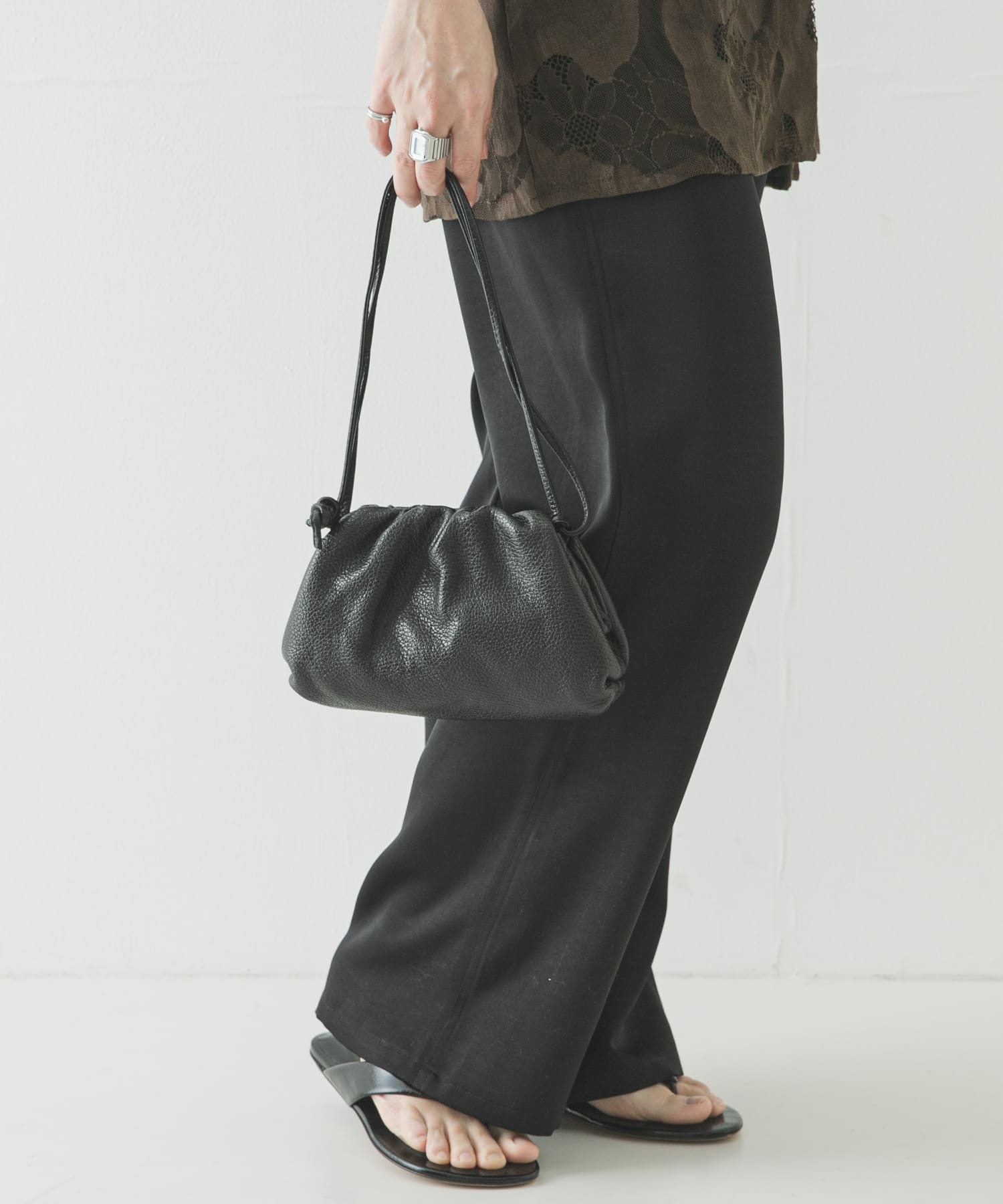 がま口タイプのレザーショルダーバッグです。シンプルなデザインで使い回しやすく、日常使いに使いやすい小ぶりなサイズ感です。