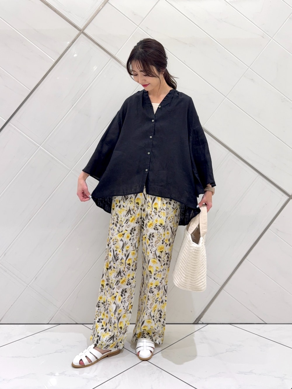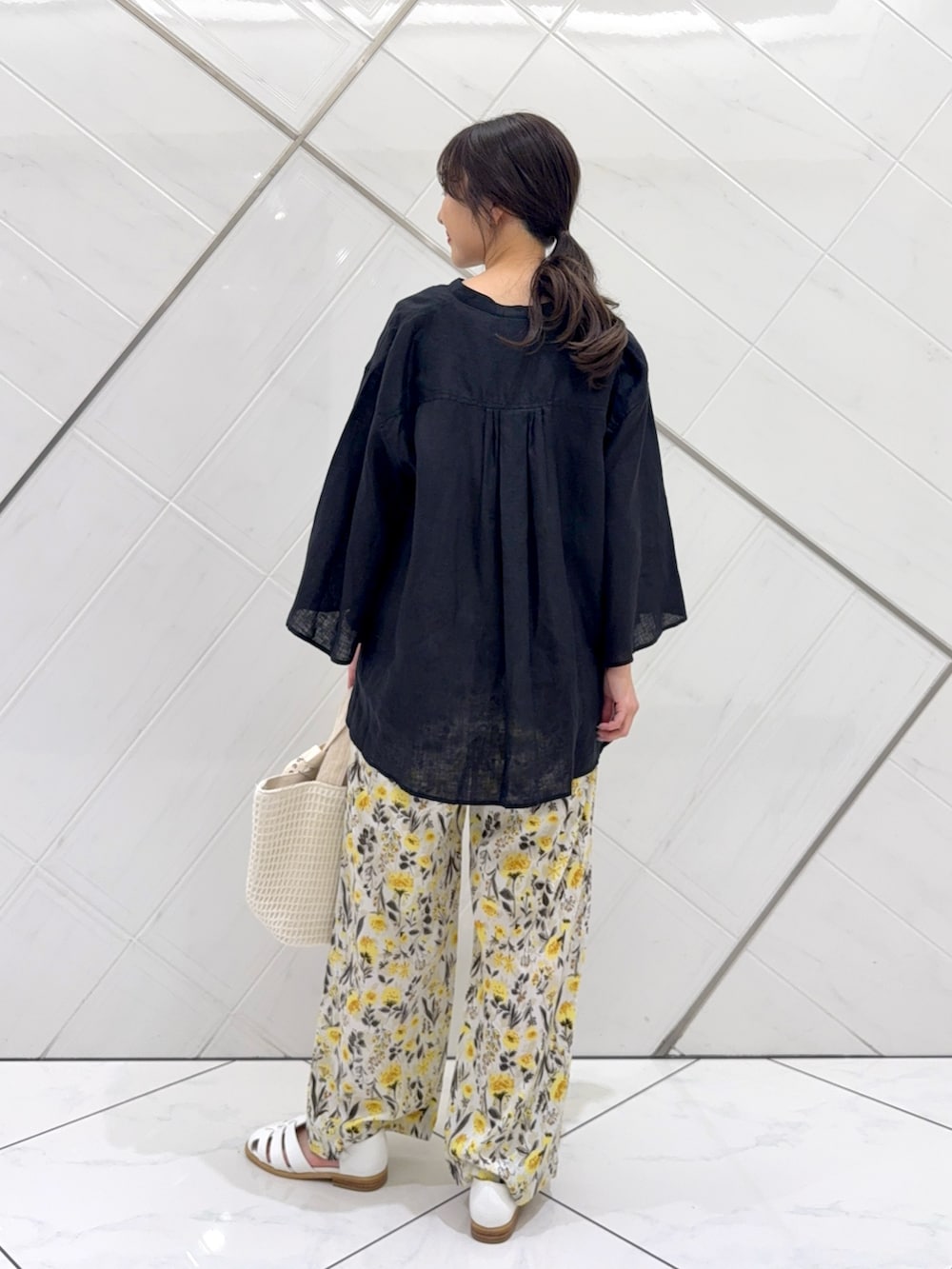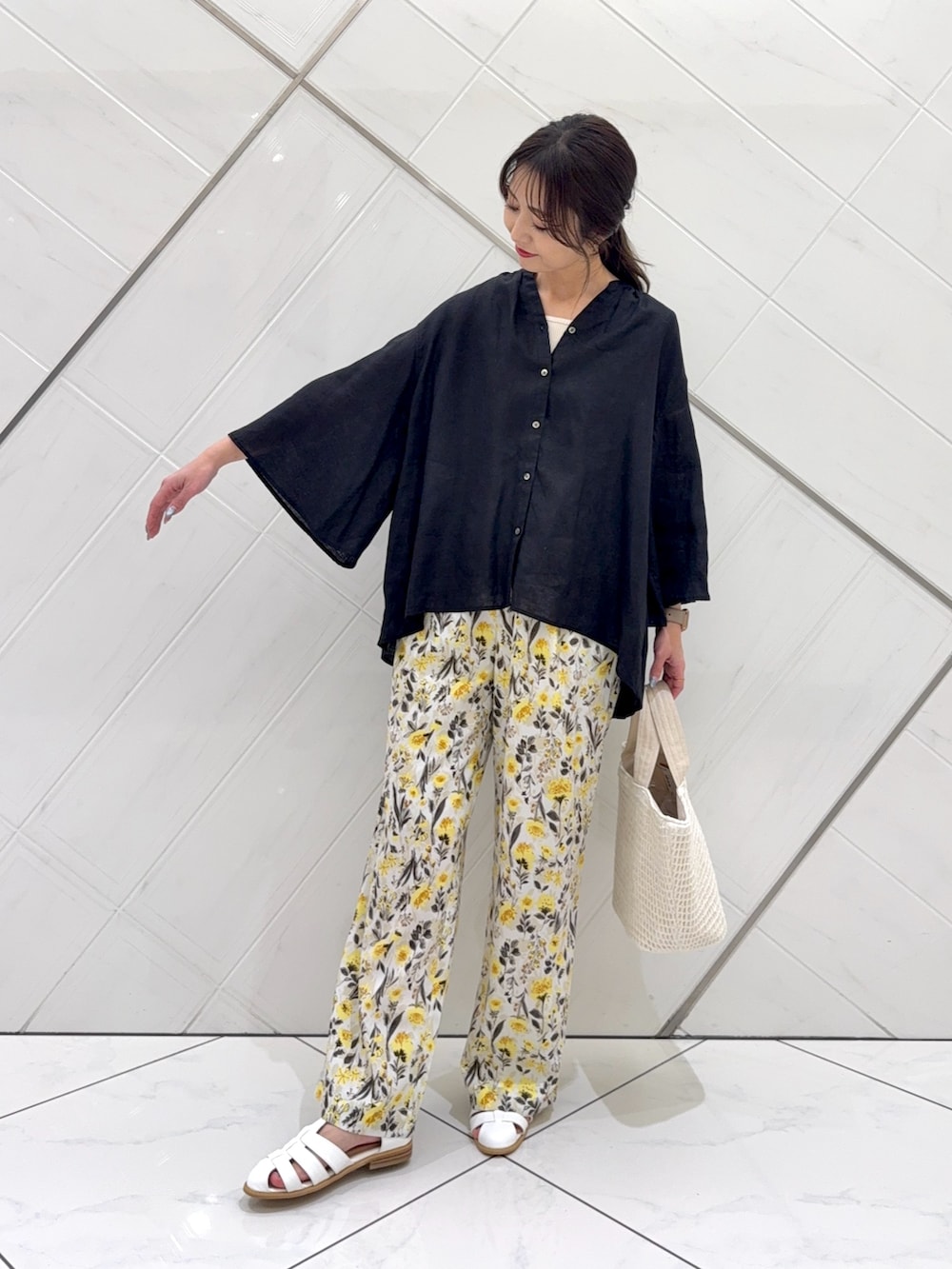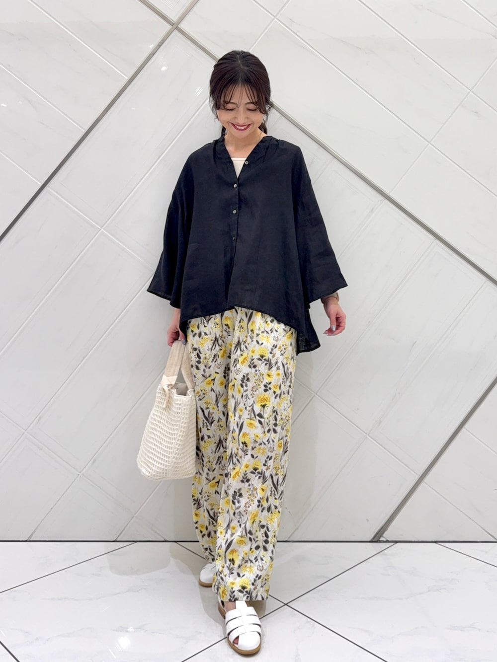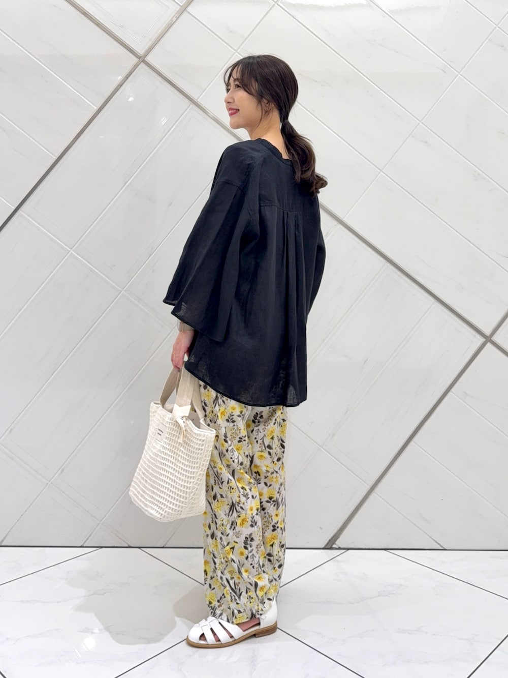 トップスはリネン素材でチクチク感のない柔らかな肌触りで着心地もよく、袖はフレアスリーブになっているので二の腕もカバーしつつ細見えします。