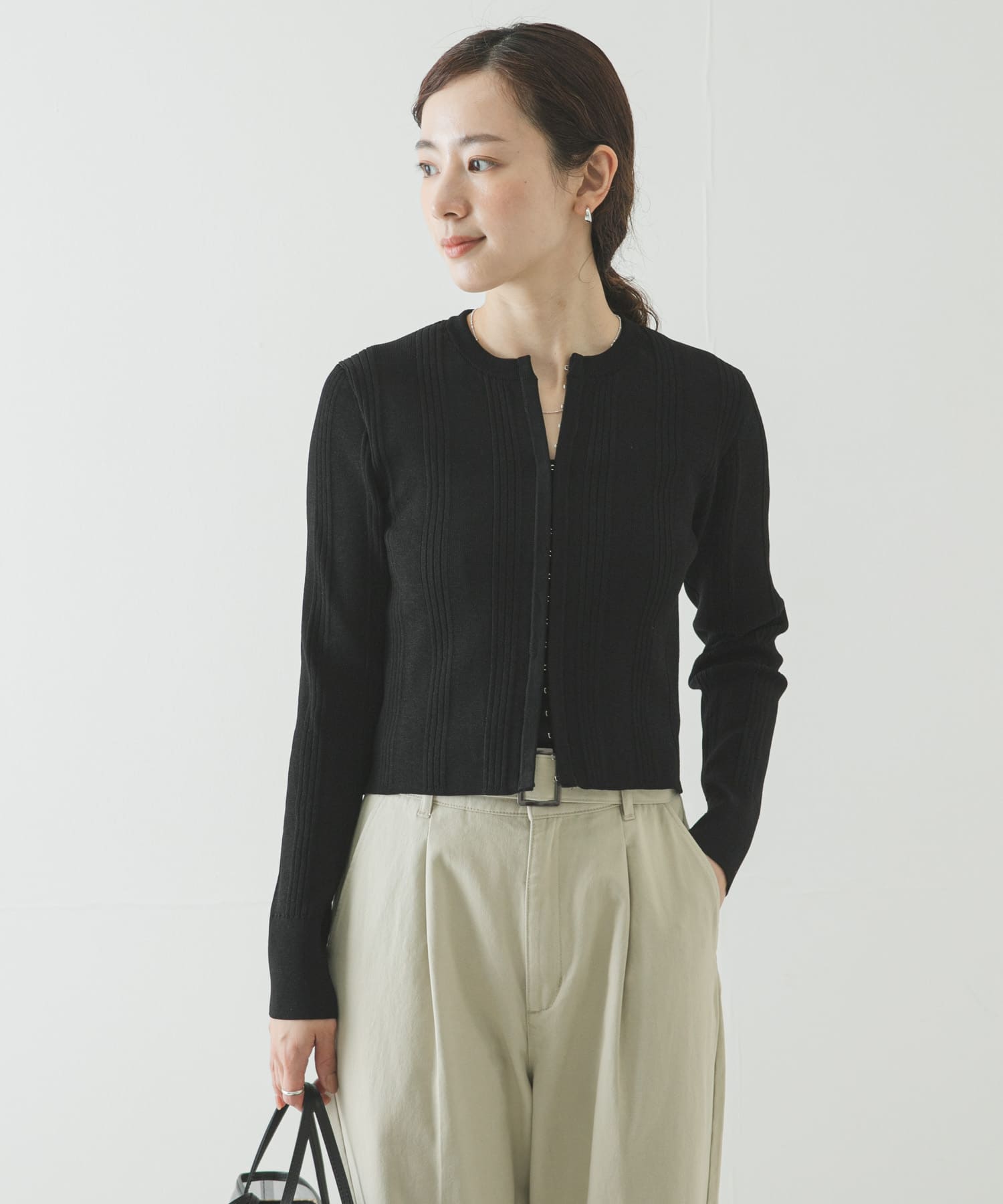 コンパクトに決まるリブカーディガン。