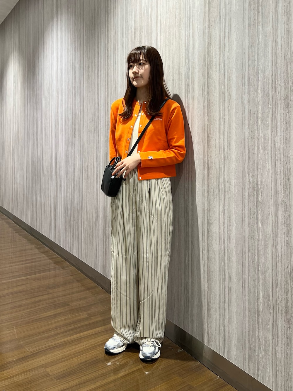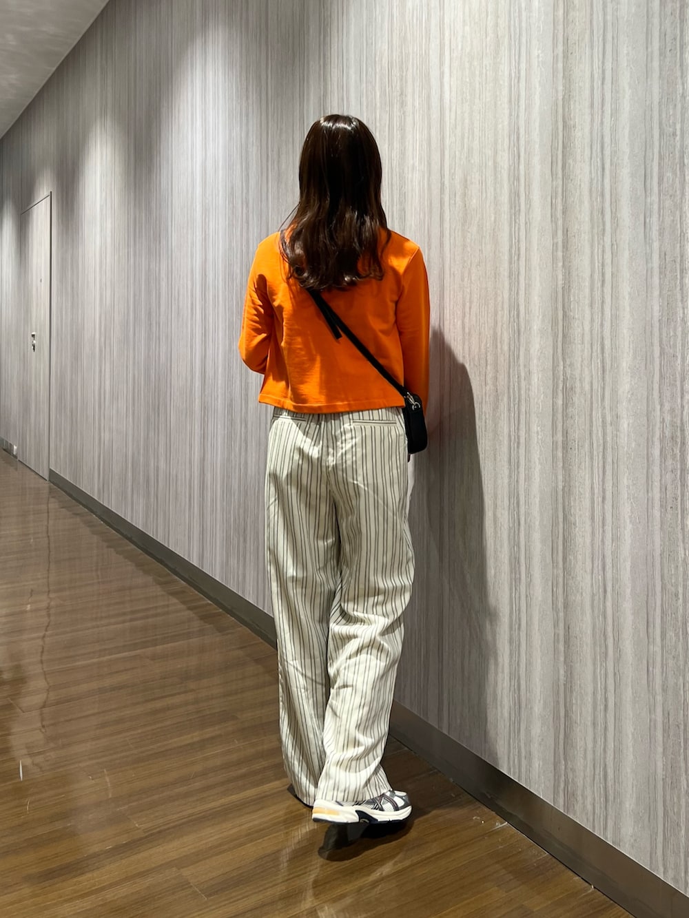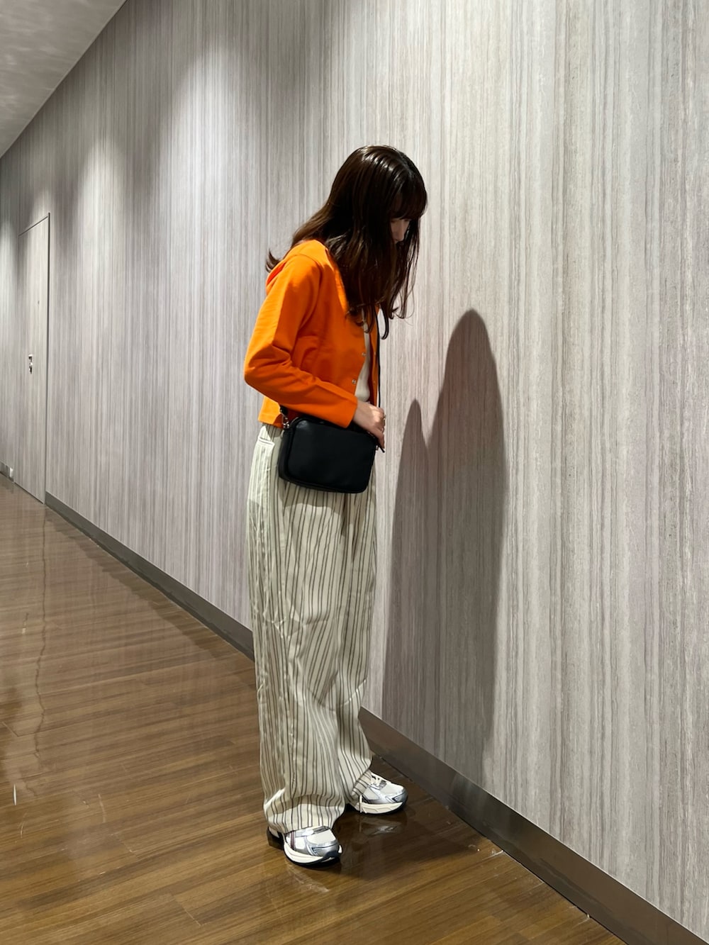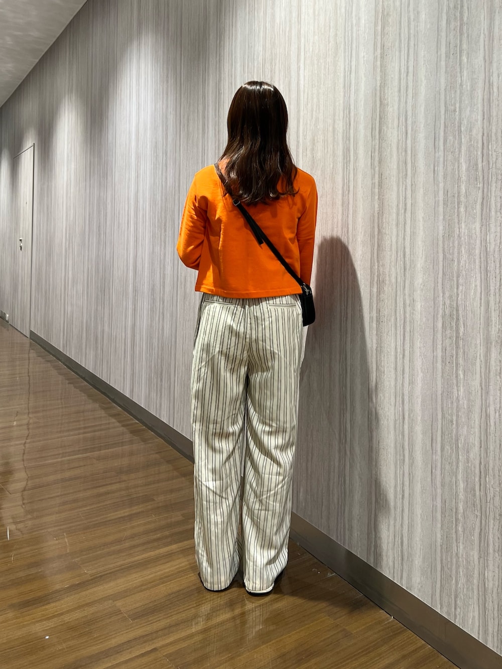 短丈なので、ワイドパンツと合わせてもバランス良く着れます✨さらにストライプ柄のパンツでスタイルアップ⤴️