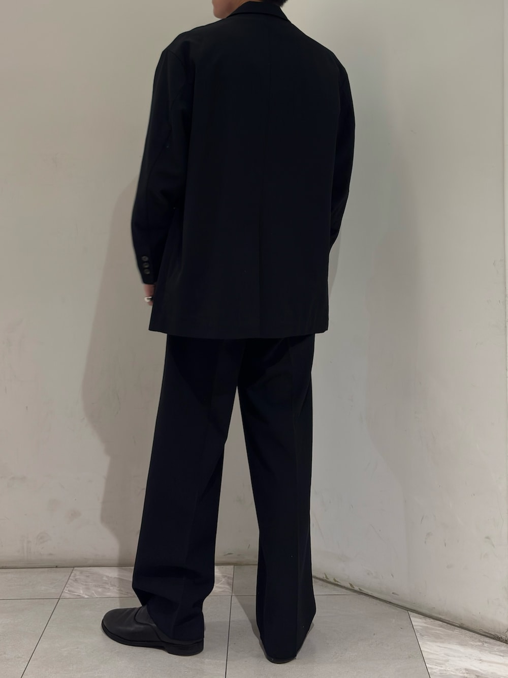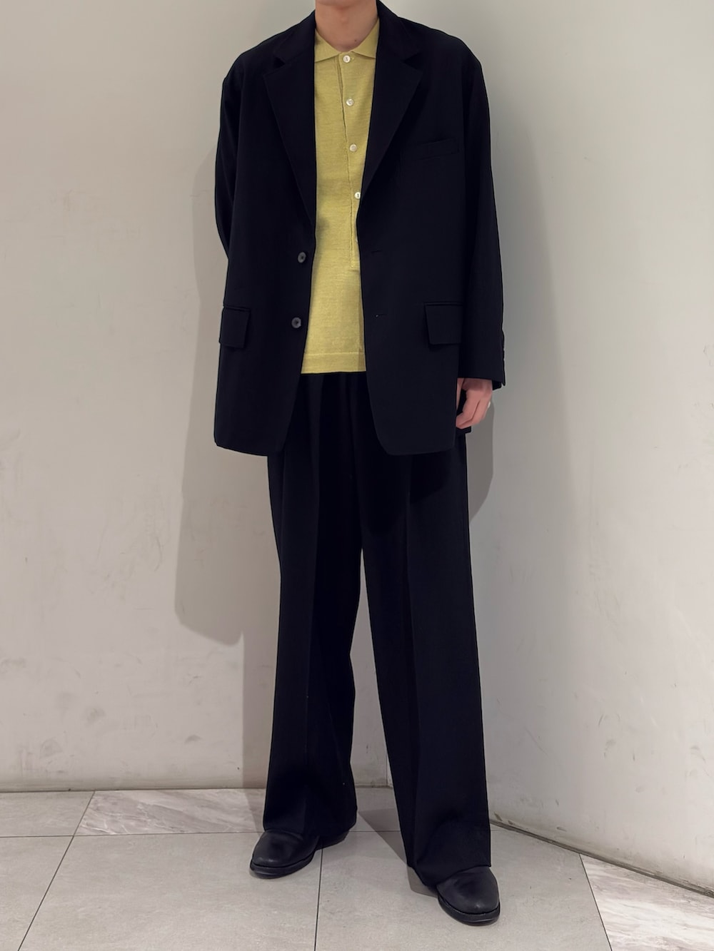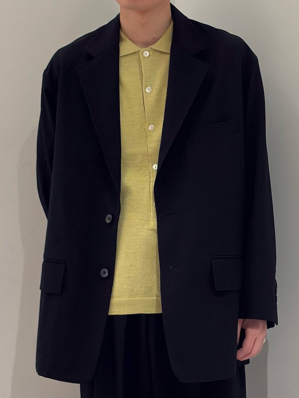 ドロップした肩と大きくとられた身幅が特徴的なジャケットは、自然と肩の力が抜けて、プライベートで気軽にお織れる1着。もちろん、パンツとのセットアップでオケージョンスタイルにも。
